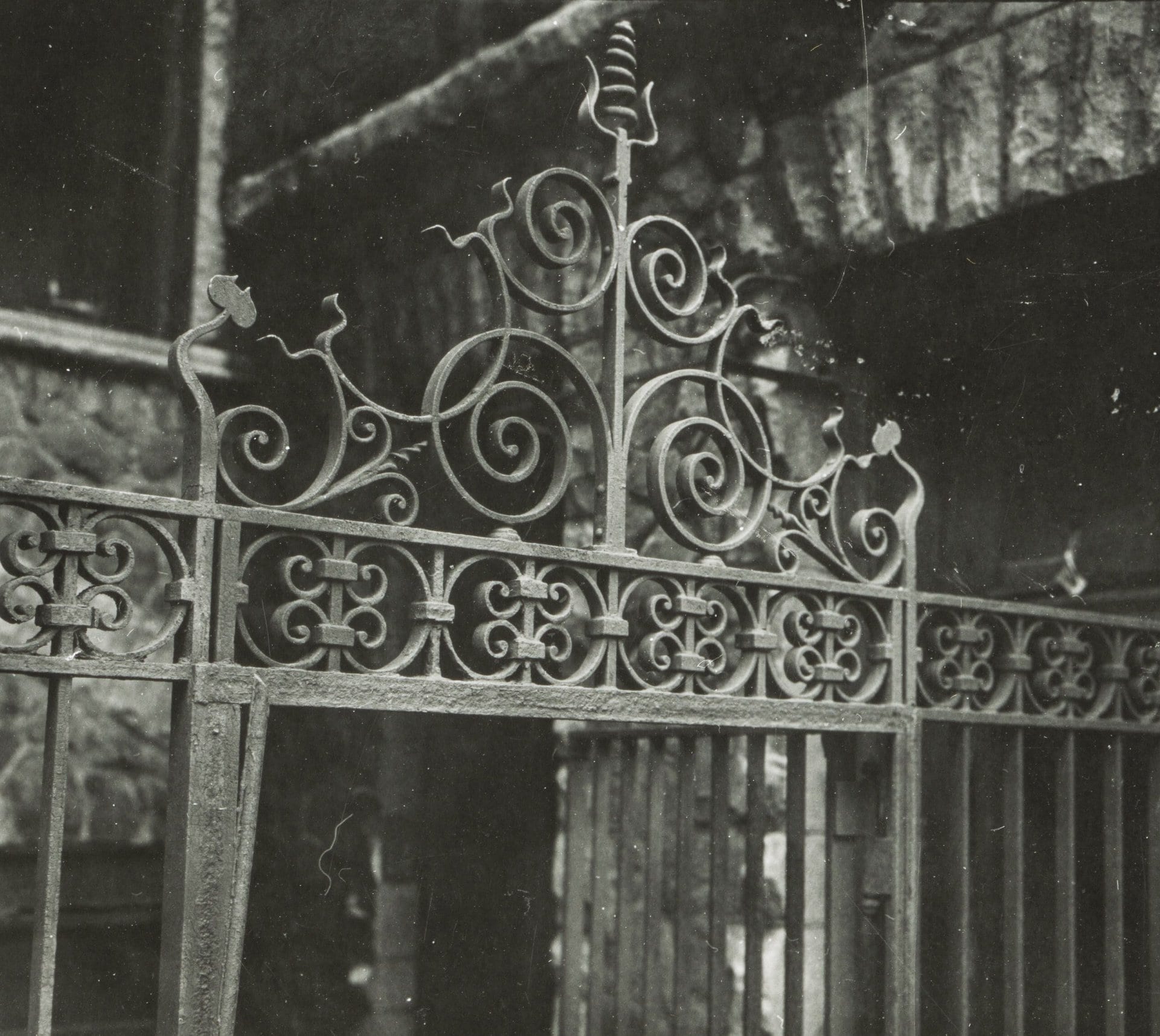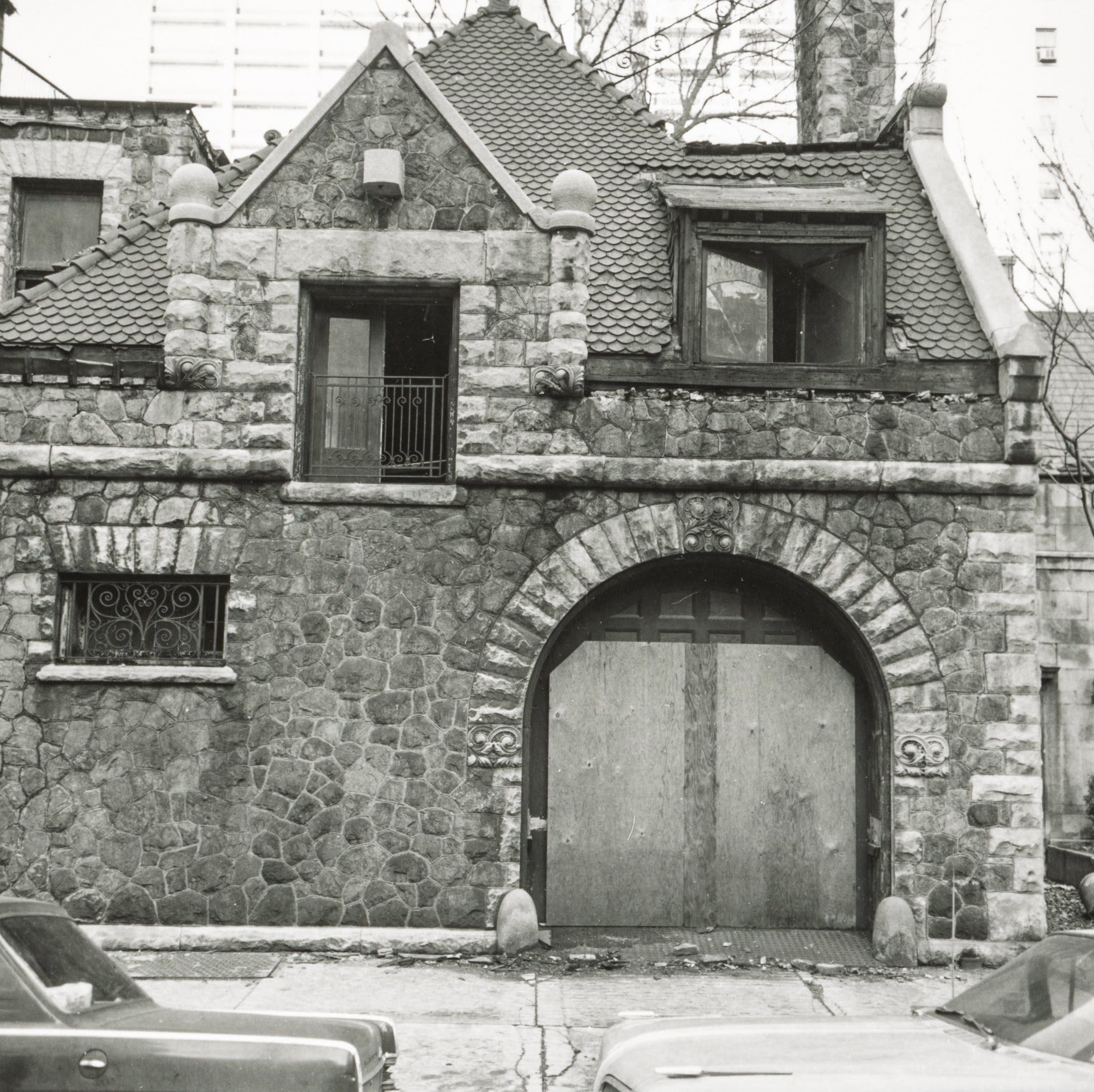 burnham and root’s house for edward e. ayer, a wealthy chicagoan who made his wealth as a supplier of railroad ties. the exterior rubble walls were comprised of split granite boulders. the ironwork was truly remarkable as seen in the hinged gate, massive strap hinges on the entrance doors, and stair railings flaring out from the arched entrance. the oak paneled stair hall, art glass windows, and stone fireplaces with root-designed carved wood overmantels were equally stunning.