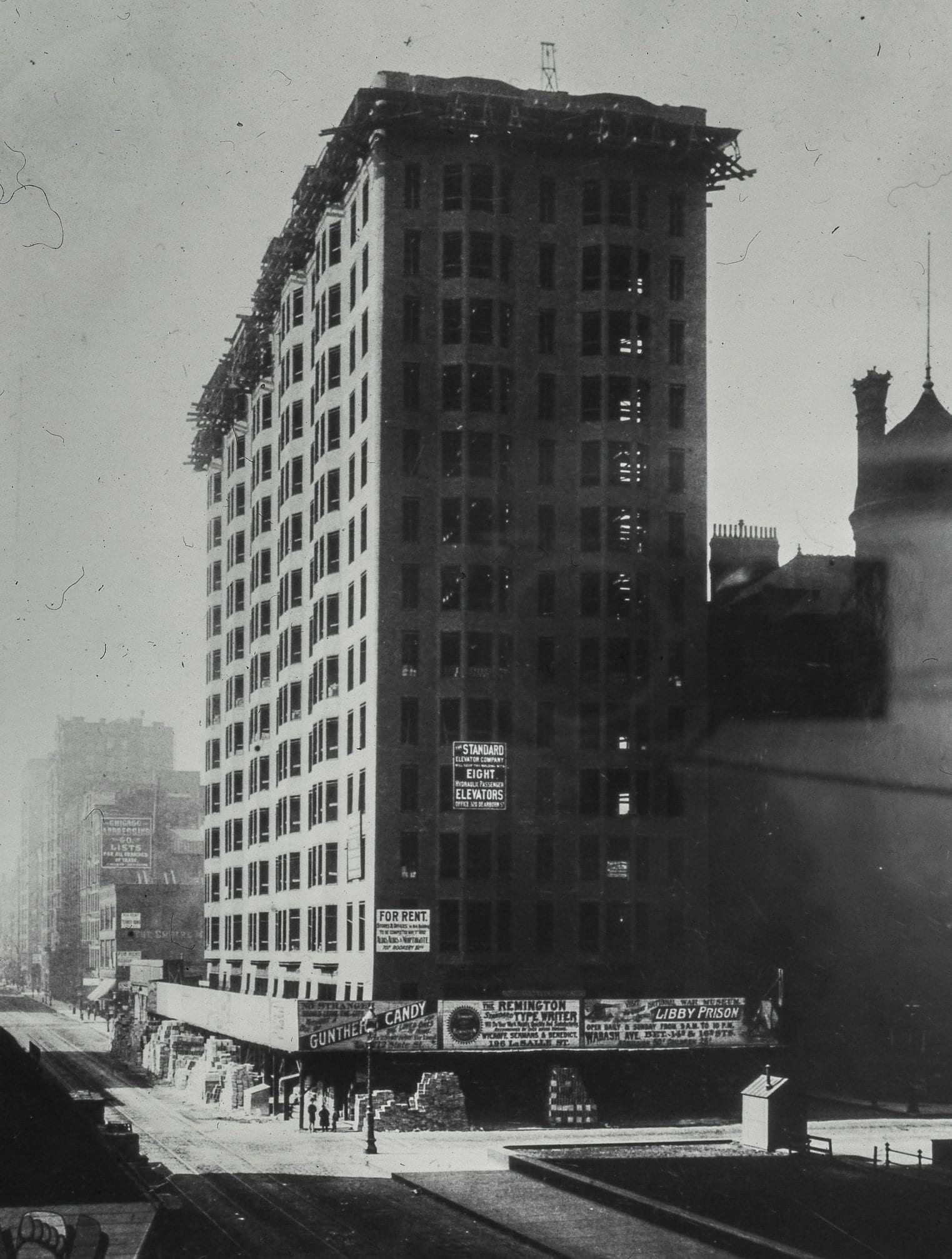 construction of burnham and root’s 17-story monadnock building (north half, 1891) nearing completion. the structure was built by george a fuller company, known as the creator of the modern contracting system in building construction.