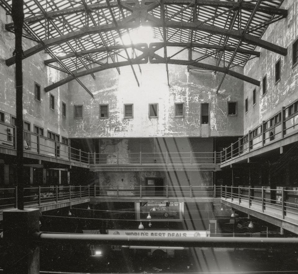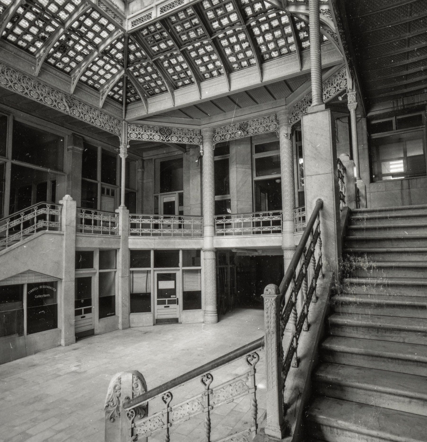 undated richard nickel photo of the rookery building (1888) atrium. burnham and root, architects. the covered skylight, (consisting of strongly geometric cast iron and translucent glass) was covered over on the outer surface with a waterproof membrane and painted a uniform gray on the inner surface. thankfully the skylight has been restored, but it must have been dark and gloomy during that time.