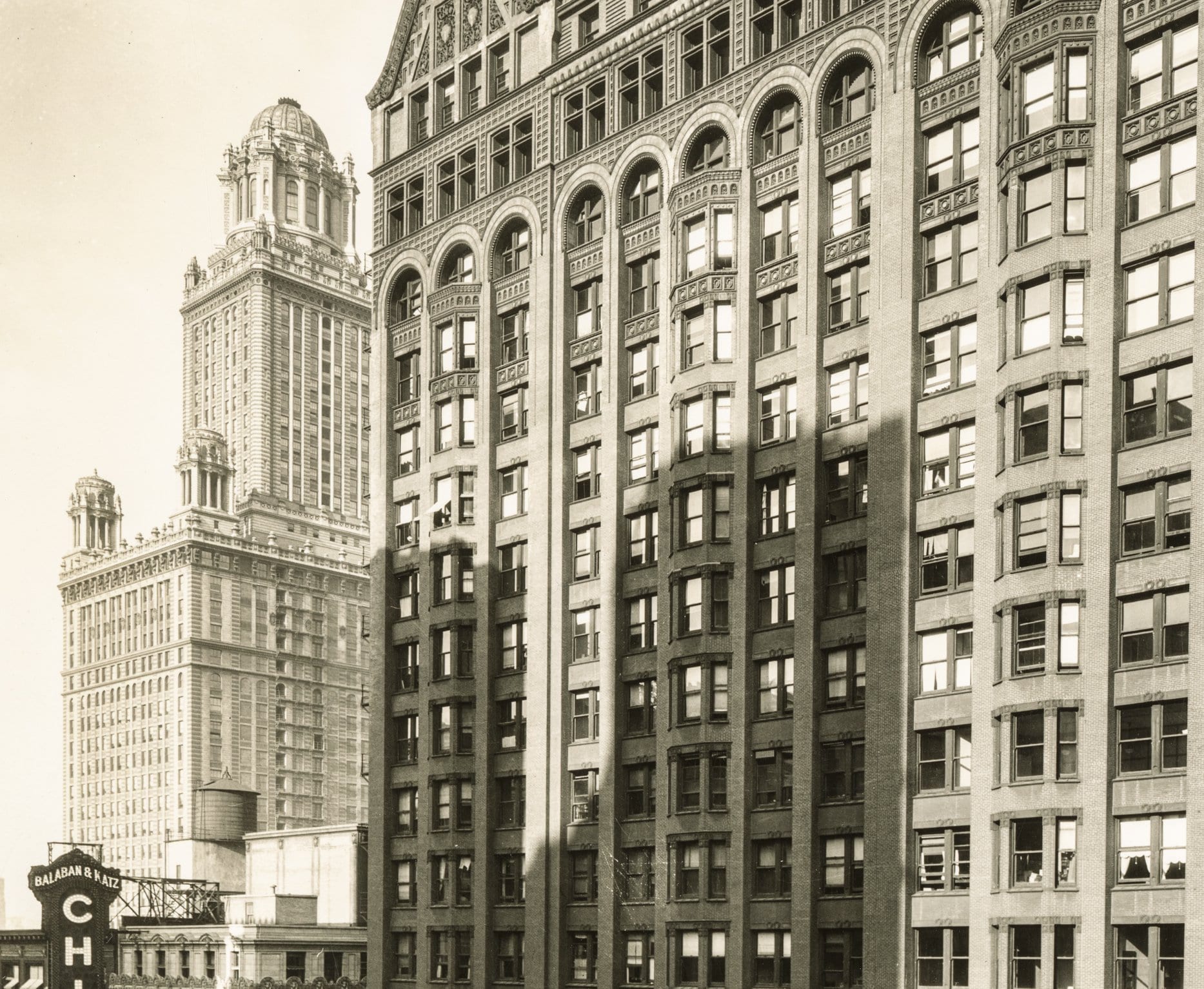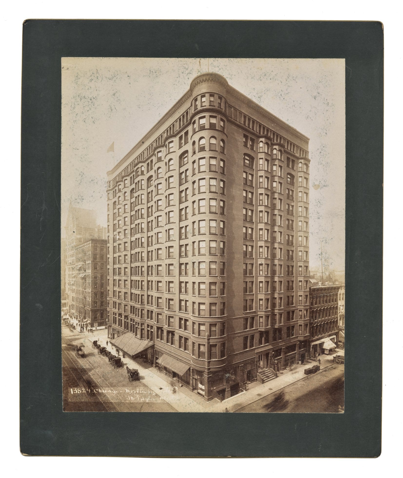 original james taylor mounted albumen print of burnham and root’s 16-story terra cotta-clad ashland block, with adler and sullivan’s schiller theater to the east. the ashland block was destroyed in 1949 and replaced by a greyhound bus station. schiller or garrick (1892) was demolished for a parking garage in 1961.