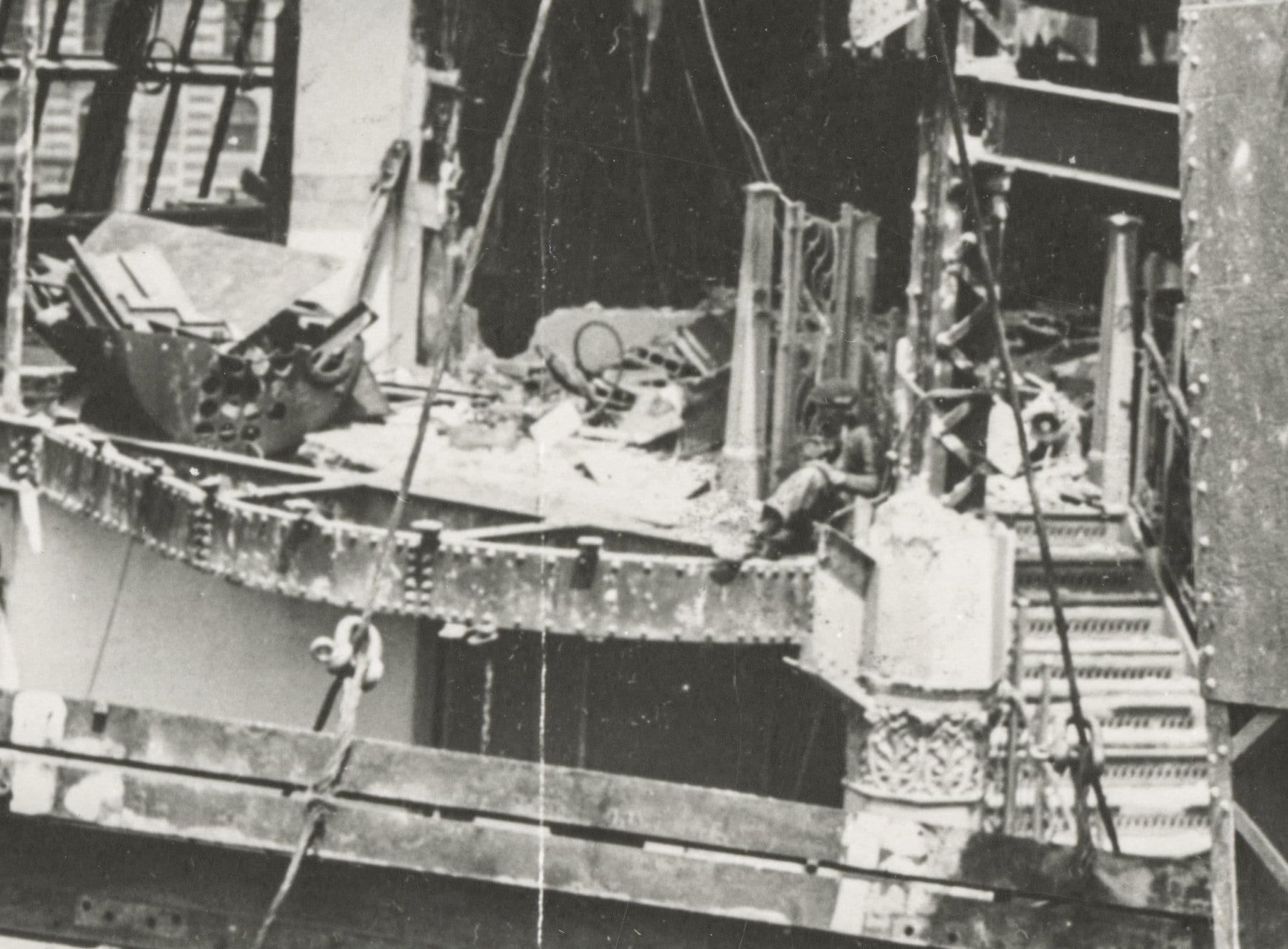 a seldom seen photo of burnham and root’s masonic temple building (1892) undergoing demolition in 1939. judging from what’s left of john wellborn root’s ornamental staircase (note the brown brothers company glass vault lights in the risers) and supporting columns from the sky-lit central court, the ornamental iron – executed by winslow brothers – was no doubt smashed, torched, and tossed into scrap heaps. horrifying.