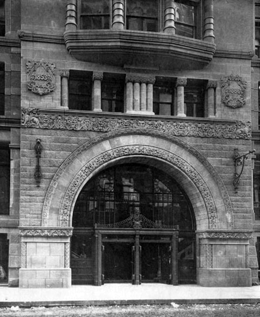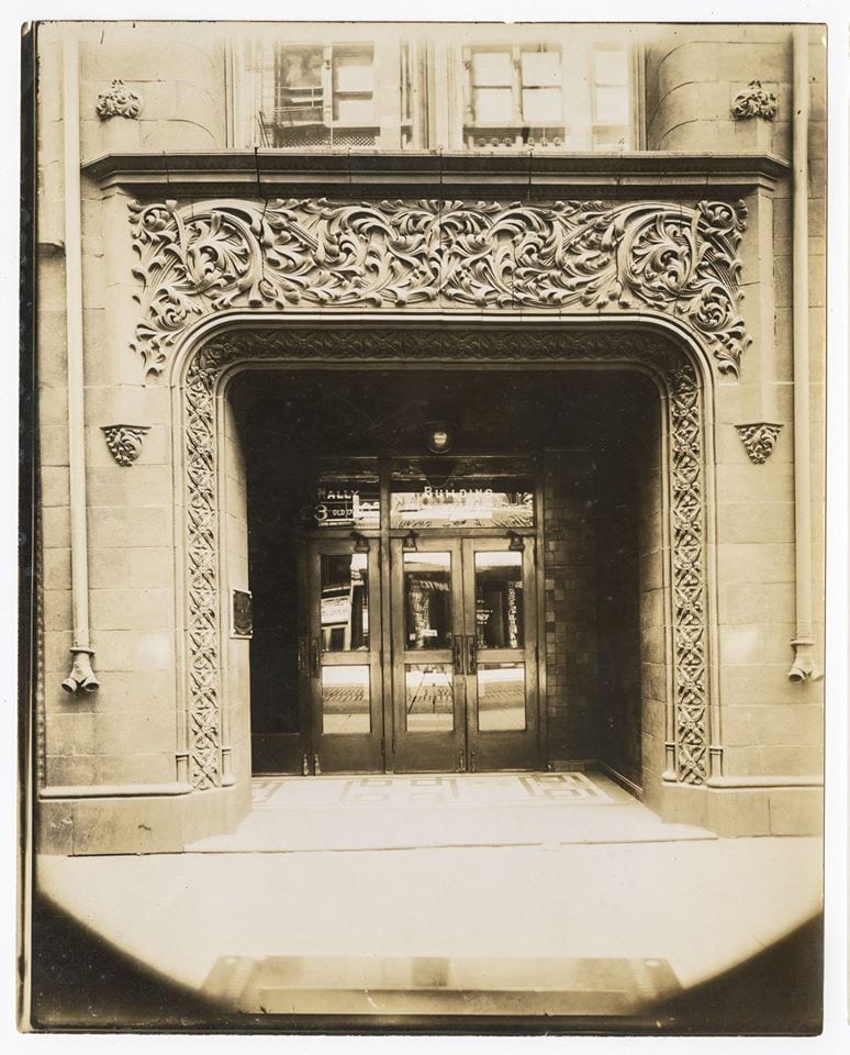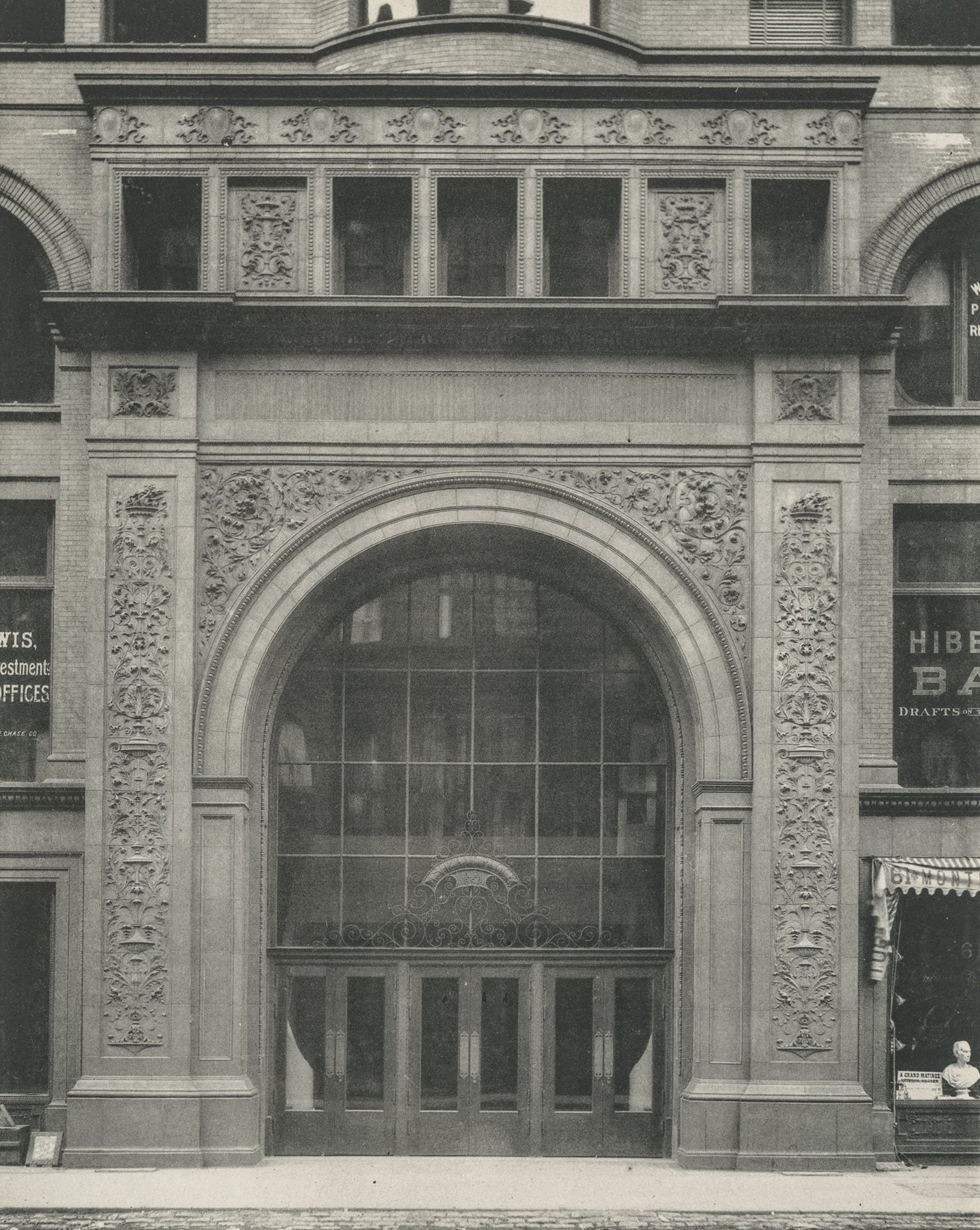 early 20th century photograph of burnham and root’s 10-story rand mcnally building (1889). the image provides a detailed look at root’s ornament about one of two entrances along adams street. the terra cotta panels surrounding the entrance were executed by the northwestern terra cotta company. the building was demolished in 1911.