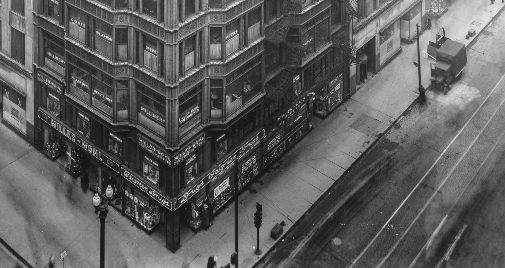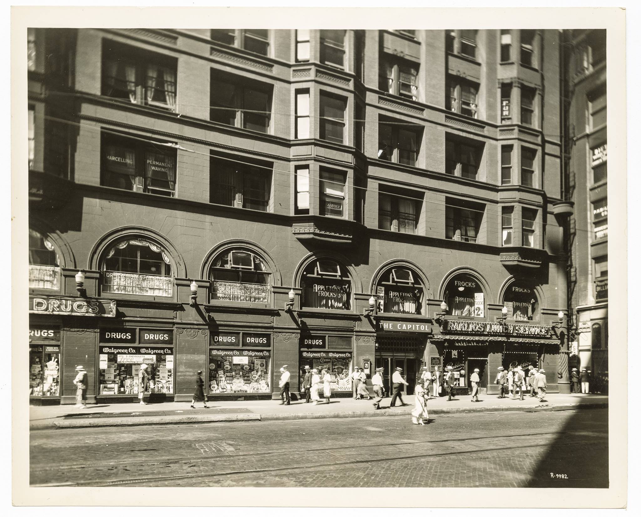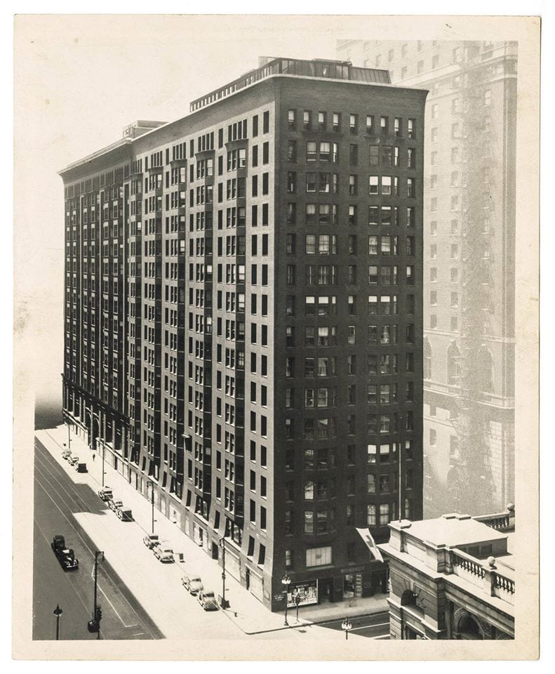 large silver gelatin print of the reliance building (burnham, root, and atwood, 1895) likely taken in the 1930s. the miller-wohl clothing store occupied multiple floors (note the neon signs prominently displayed in building’s expansive plate glass windows). the ground level included a walgreen driugs located at northeast corner of building. the building is already blackened with soot and upper floors appear entirely vacant.