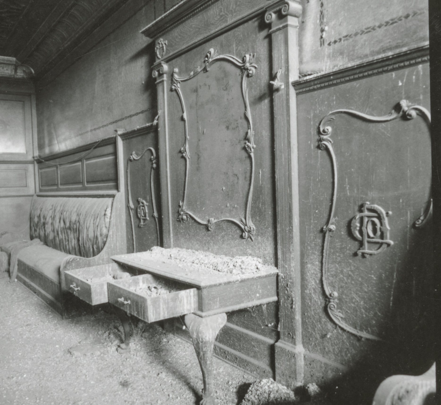 vinci documented a few of these rooms that hadn’t been altered much since the time it was built. the images of an officers’ lounge with quartered oak wood-paneled walls, bench seating, and a monogrammed desk or console are the most compelling in my opinion.