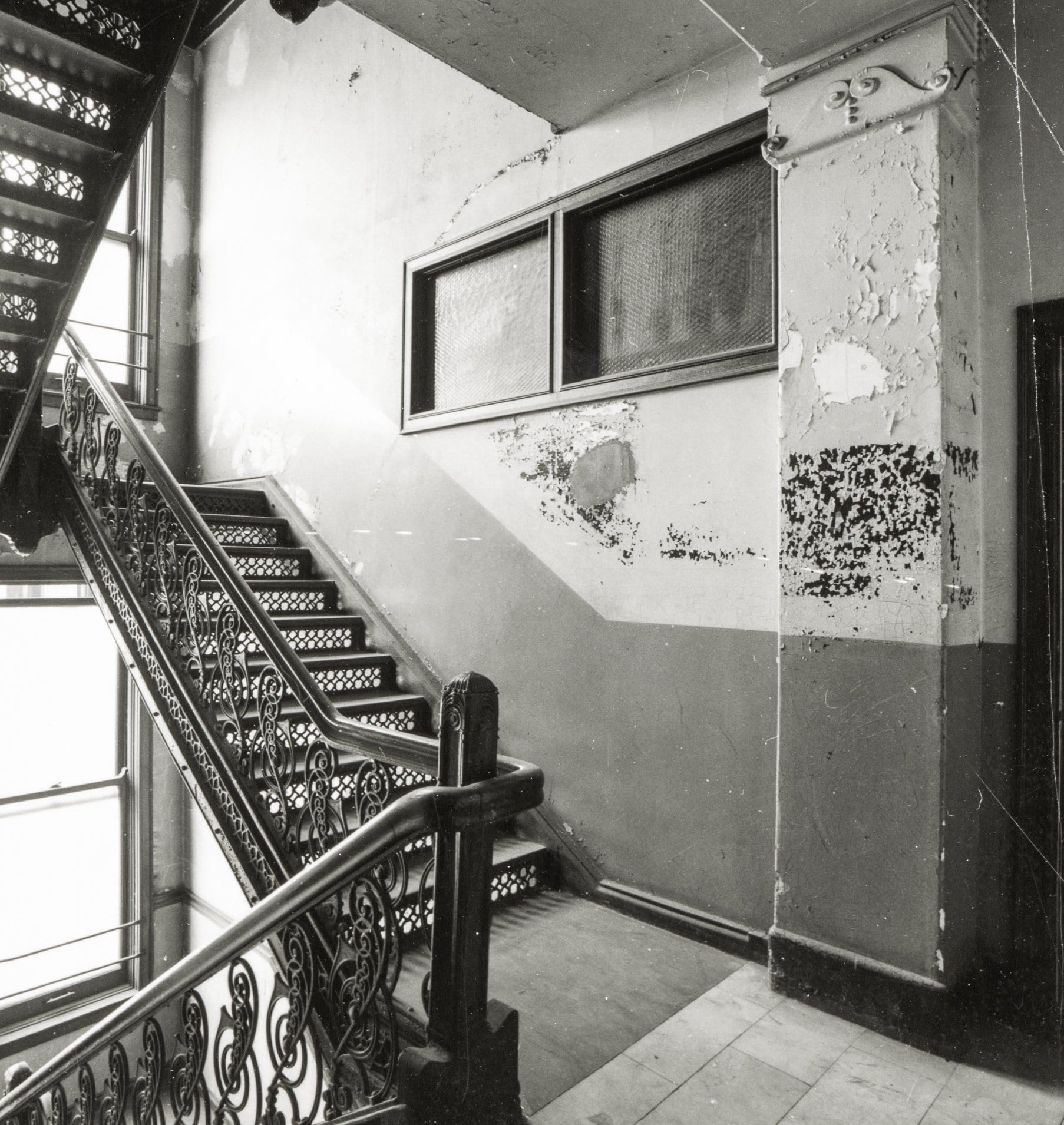 with the exception of the cage elevators being walled-in, the original mahogany woodwork, doors, marble and cast iron staircase remained intact. the office and corridor “school house” light fixtures were added during the depression.