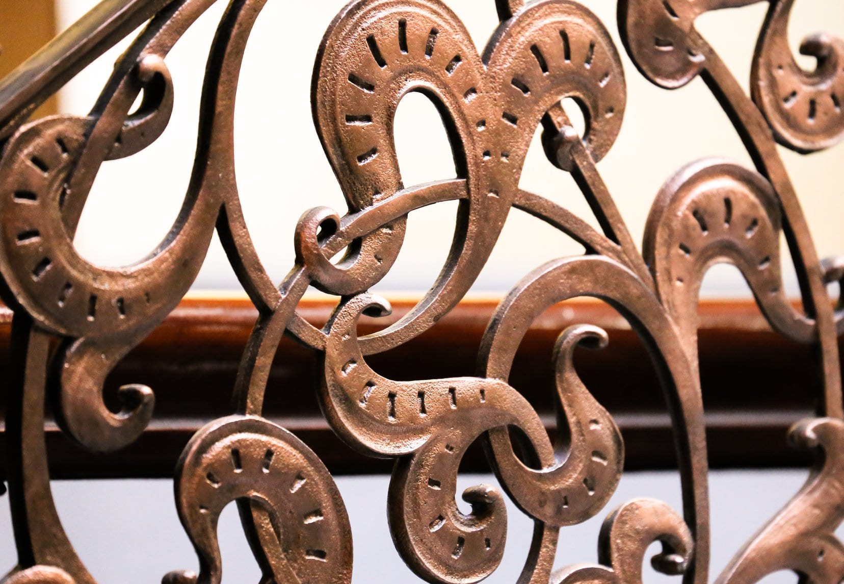 john root-designed interior monadnock staircase balusters, executed in aluminum and copper-plated cast iron.