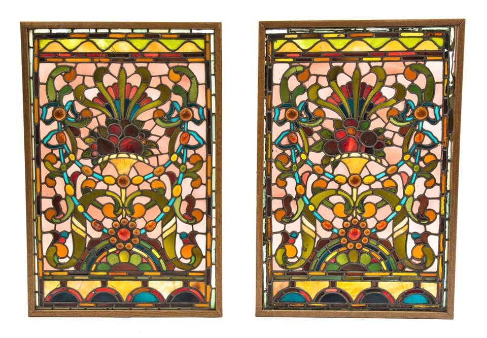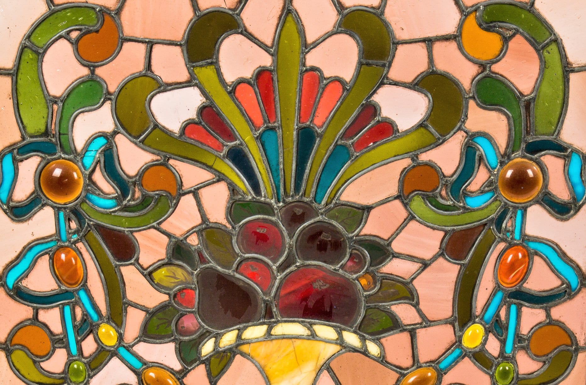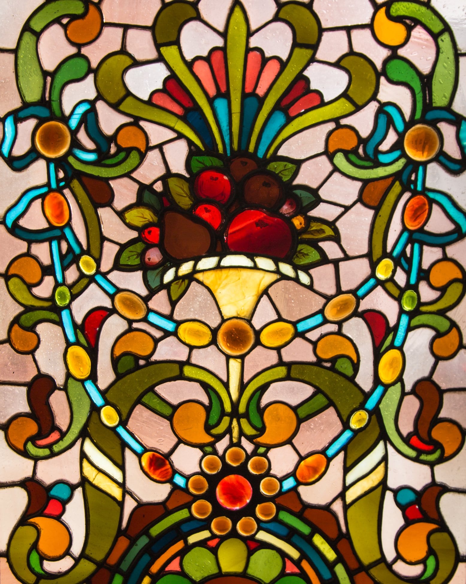 matching set of 19th century richly colored stained interior residential stained glass windows salvaged from the palmer v. kellogg mansion (burnham and root, 1883) during the depression. the two high victorian windows – featuring several jewels, swag, fruit baskets, foliated scrollwork, and fired enameled glass – were removed from the house in 1929, when it was purchased from philo adams otis (prominent chicago hymn composer) and was converted into several apartments. photographer charles cushman documented the house while it was being wrecked in 1941.