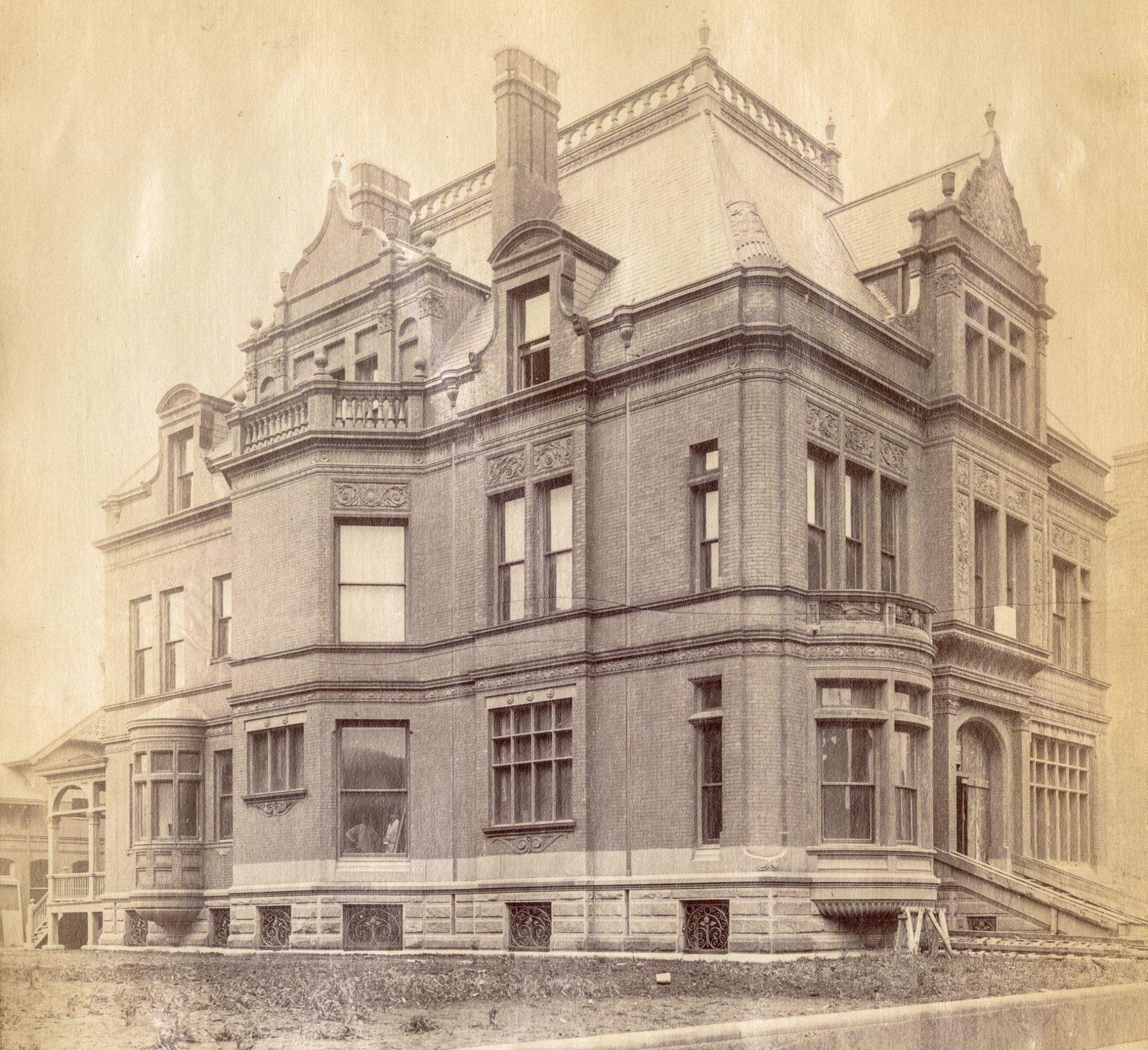 albert levy albumen print of the sydney kent house nearing completion. note the tradesmen or contractors in the window, the entrance boarded up, the sawhorse and surrounding woodwork located below the bay window, a sign posted on the facade identifying the builders, and art glass windows have yet to be installed. the extant house was completed in 1883 by burnham and root.