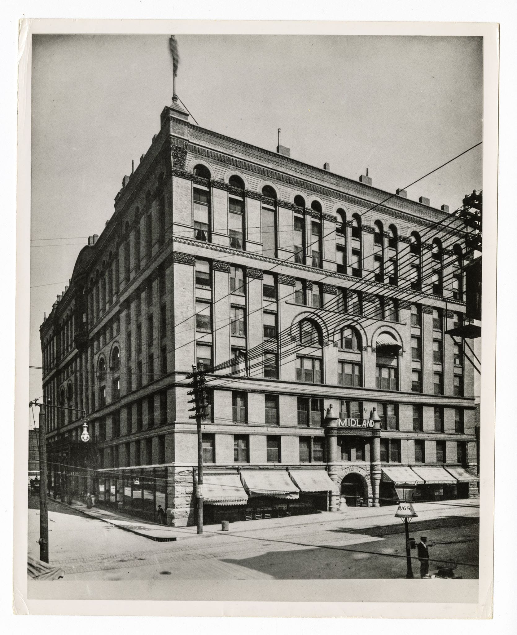 burnham and root’s midland hotel (1888). donald hoffman photographed the kansas city building shortly before it was demolished. the ornamental iron was executed by the winslow brothers company, chicago, ills. the door hardware that survived, looks virtually identical to burnham and root’s rookery building (1888).
