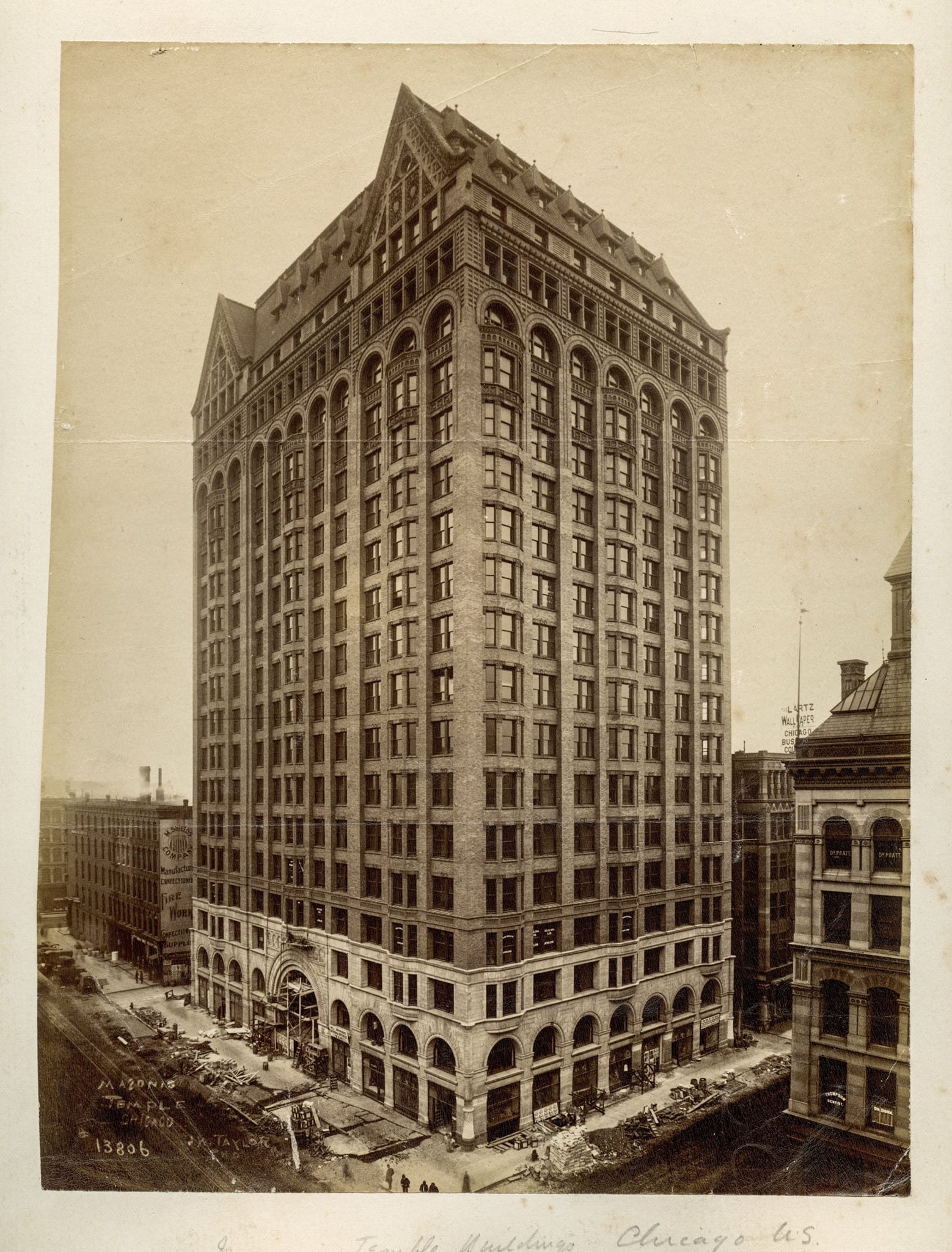 stunning view of burnham and root’s masonic temple building, erected in 1892. the 21-story skyscraper was destroyed in 1939. inland architect press.