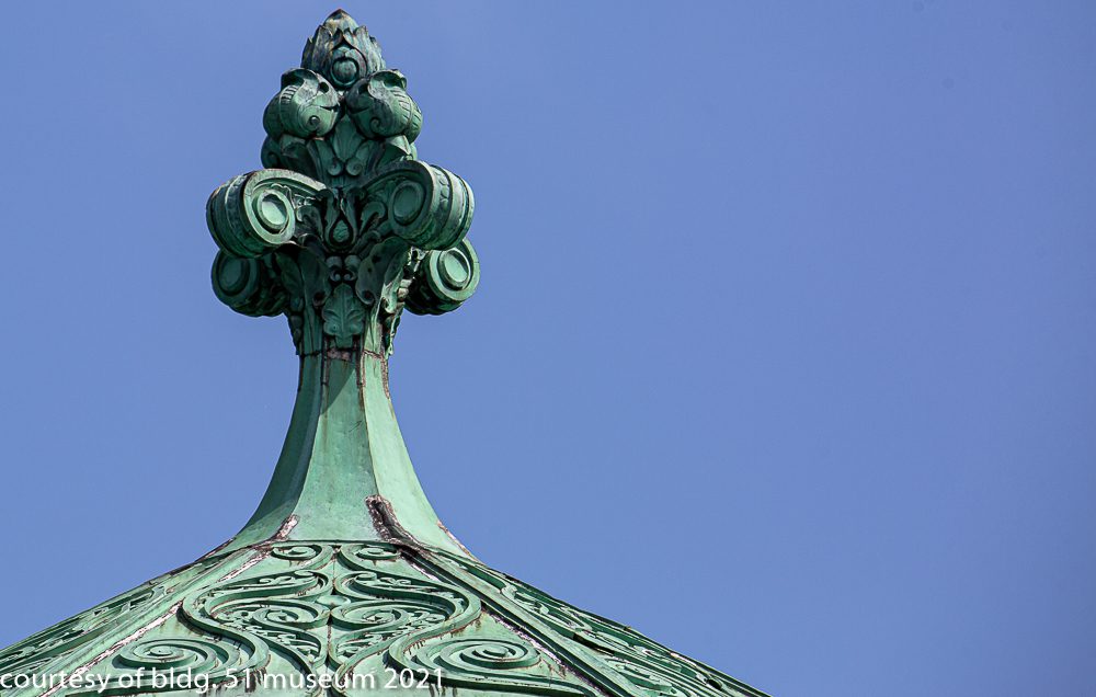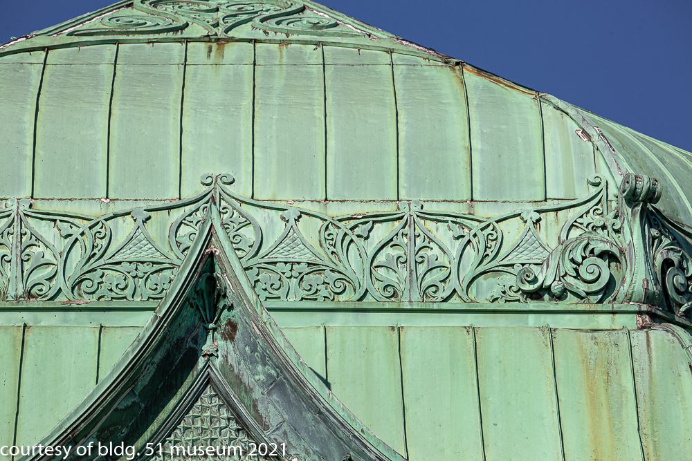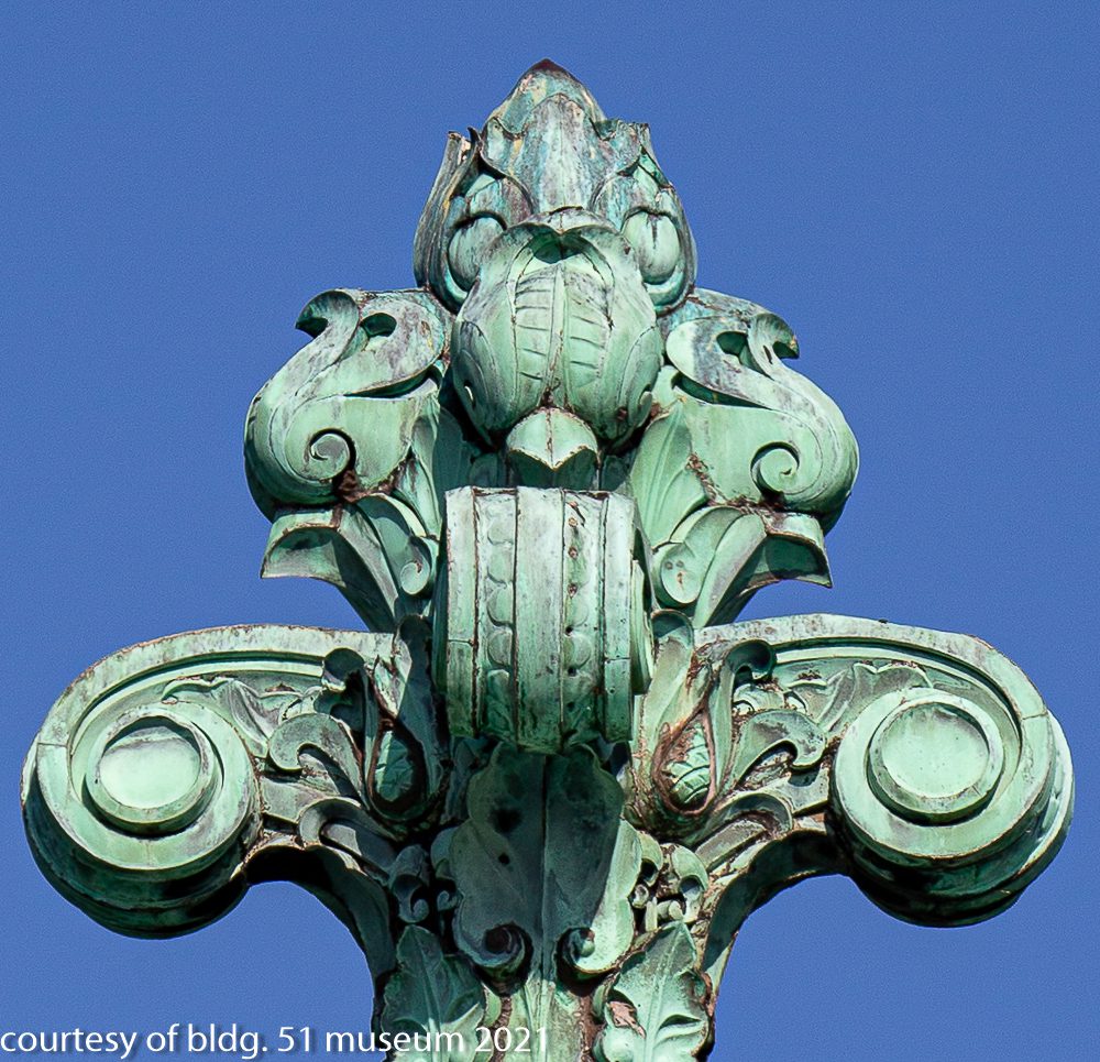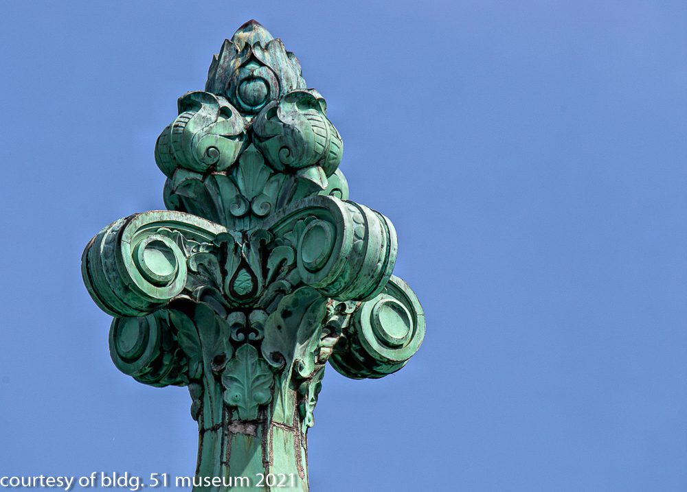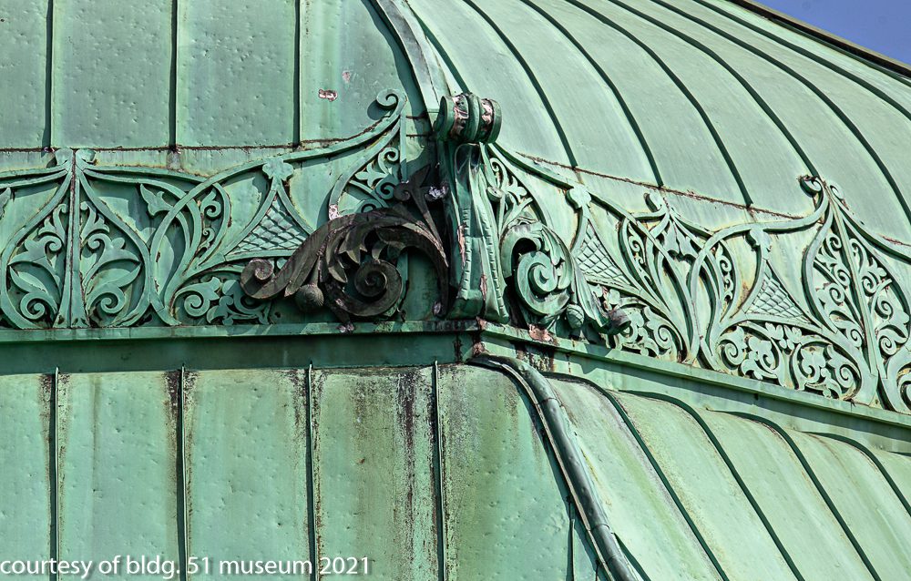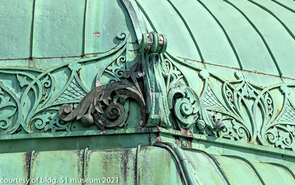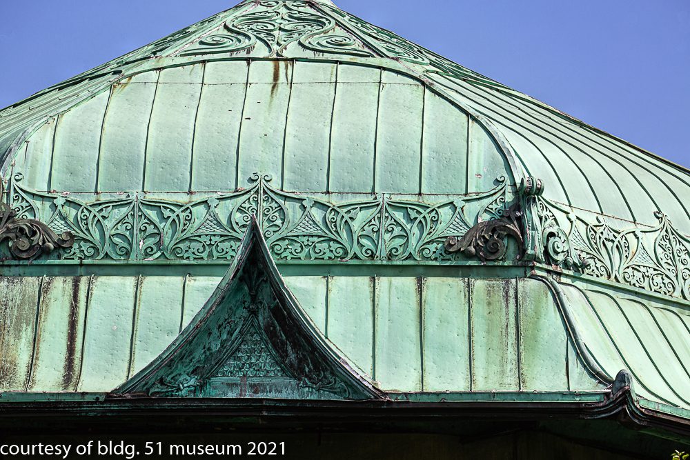 the uniquely designed stamped or pressed copper dome with protruding finial, was executed by the frank voigtmann cornice company, chicago, ills.