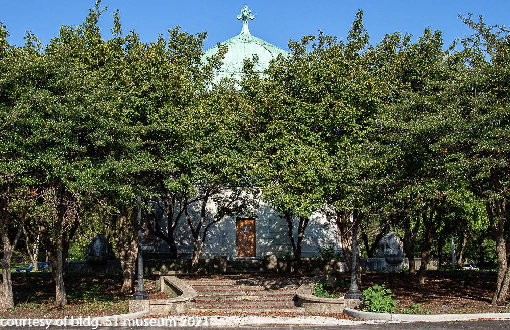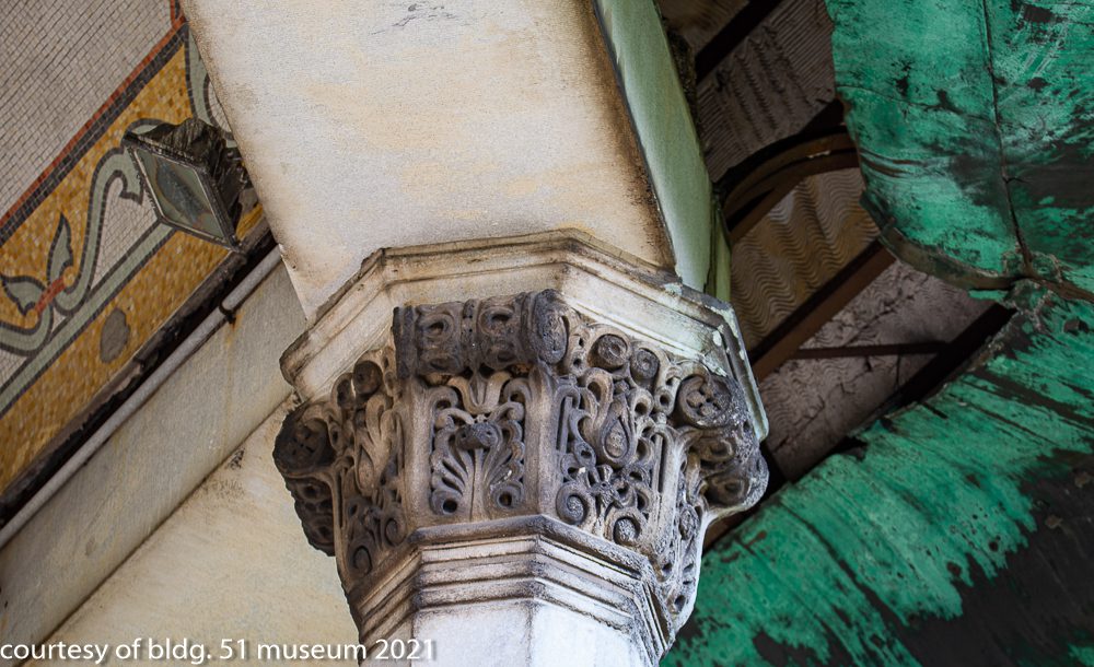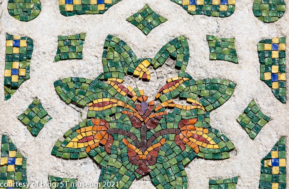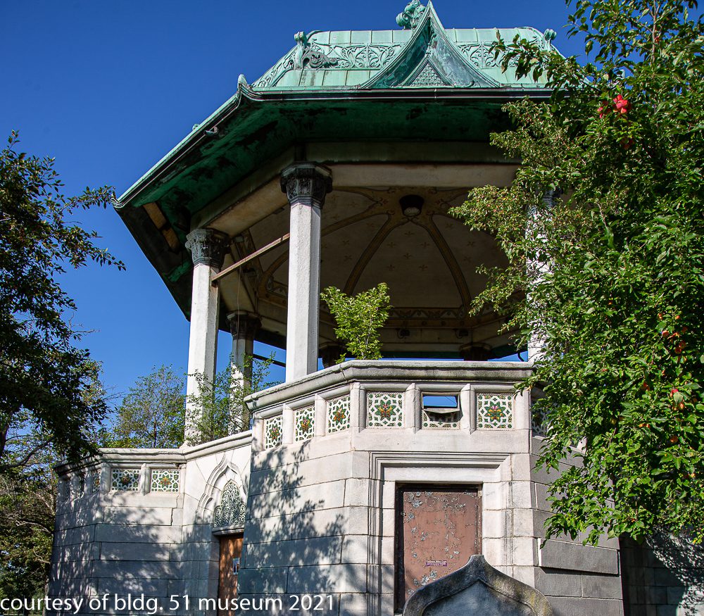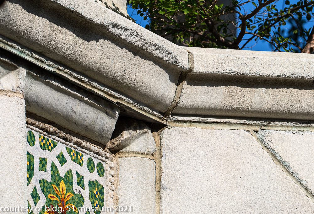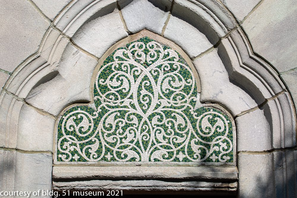 richly colored mosaics punctuate the exterior in the form of recessed panels and morrish-style headers above the doorways leading to the interior, where a massive mosaic adorns the underside of the dome. the mosaic work was completed by john carretti and company, a tile and terrazzo company based in chicago.