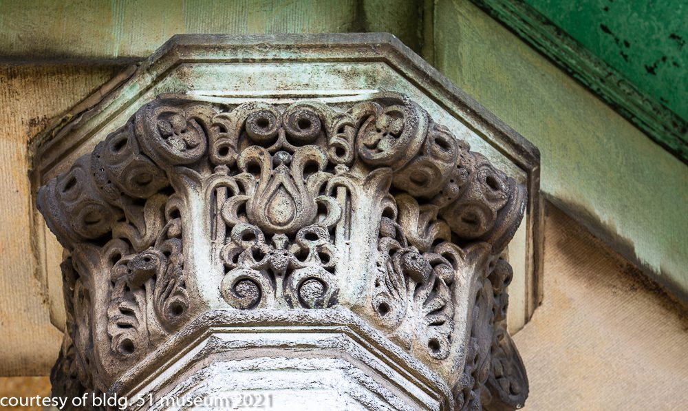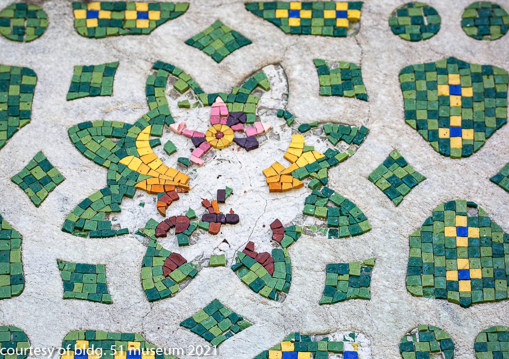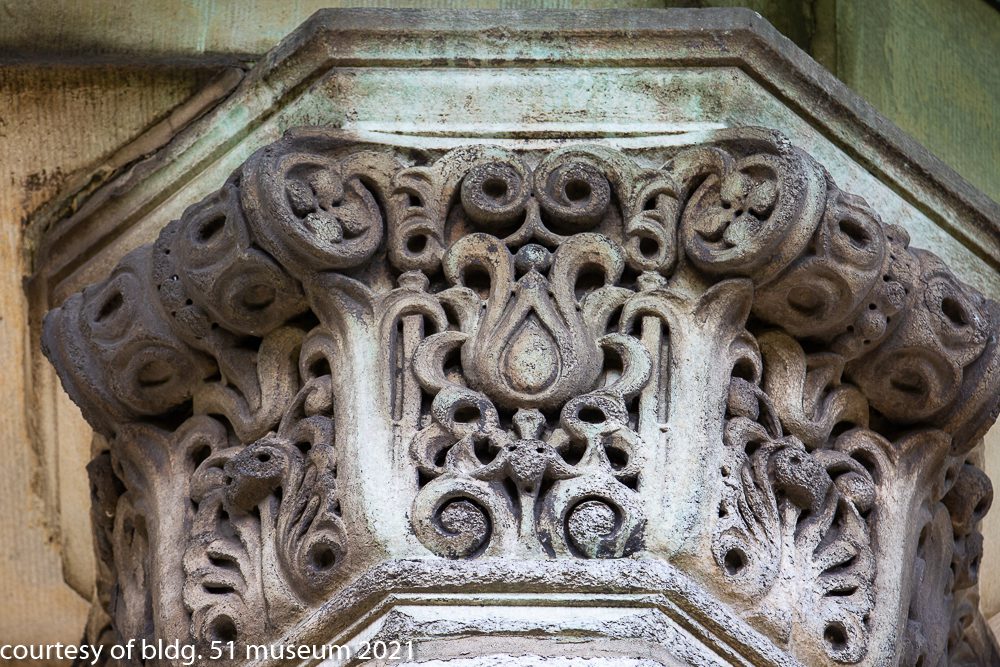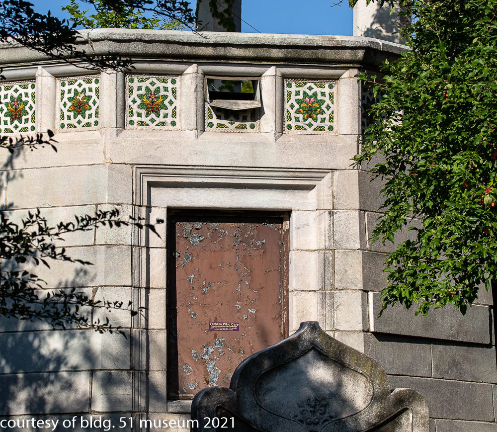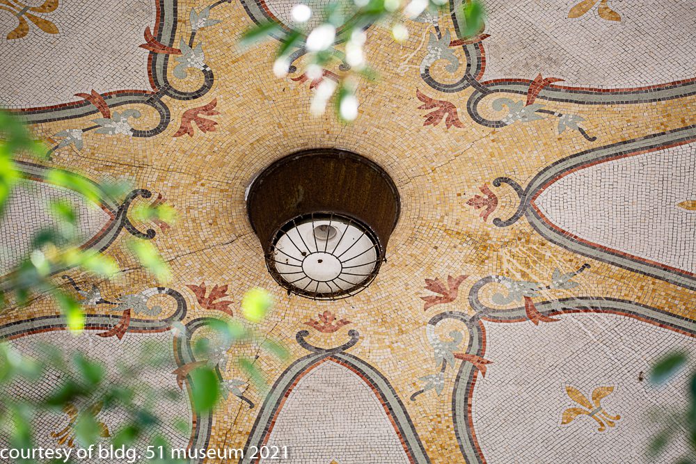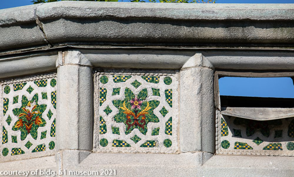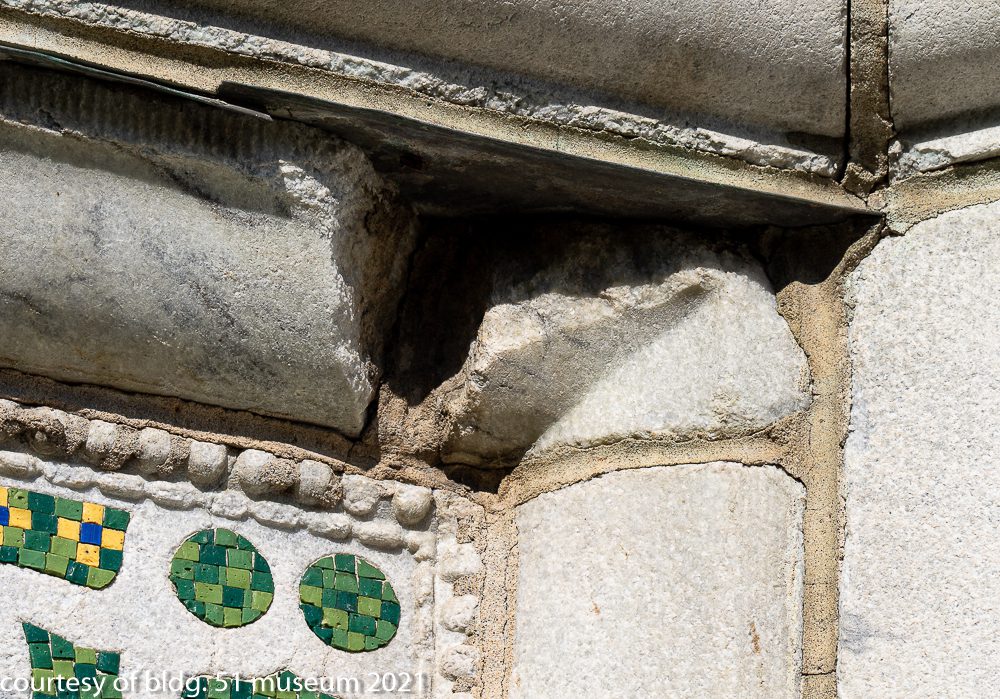 richly colored mosaics punctuate the exterior in the form of recessed panels and morrish-style headers above the doorways leading to the interior, where a massive mosaic adorns the underside of the dome. the mosaic work was completed by john carretti and company, a tile and terrazzo company based in chicago.