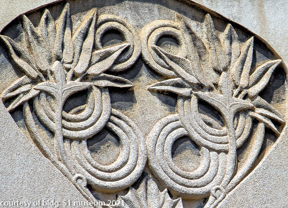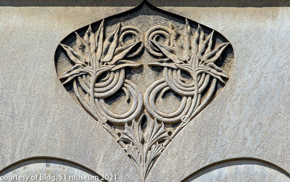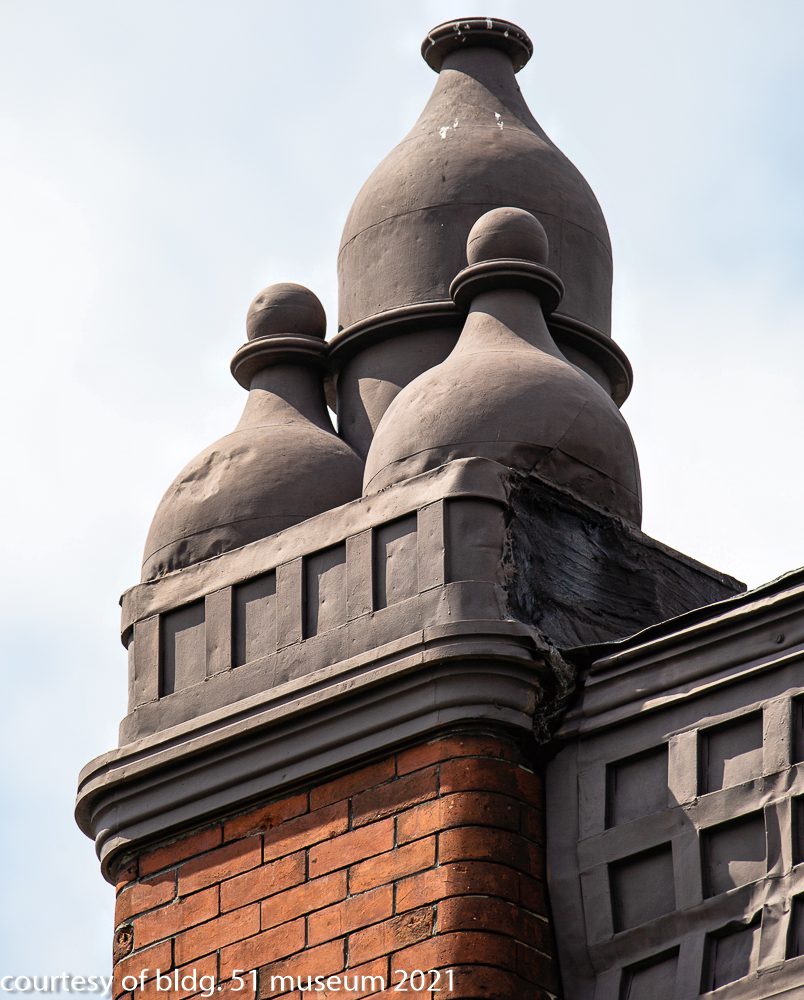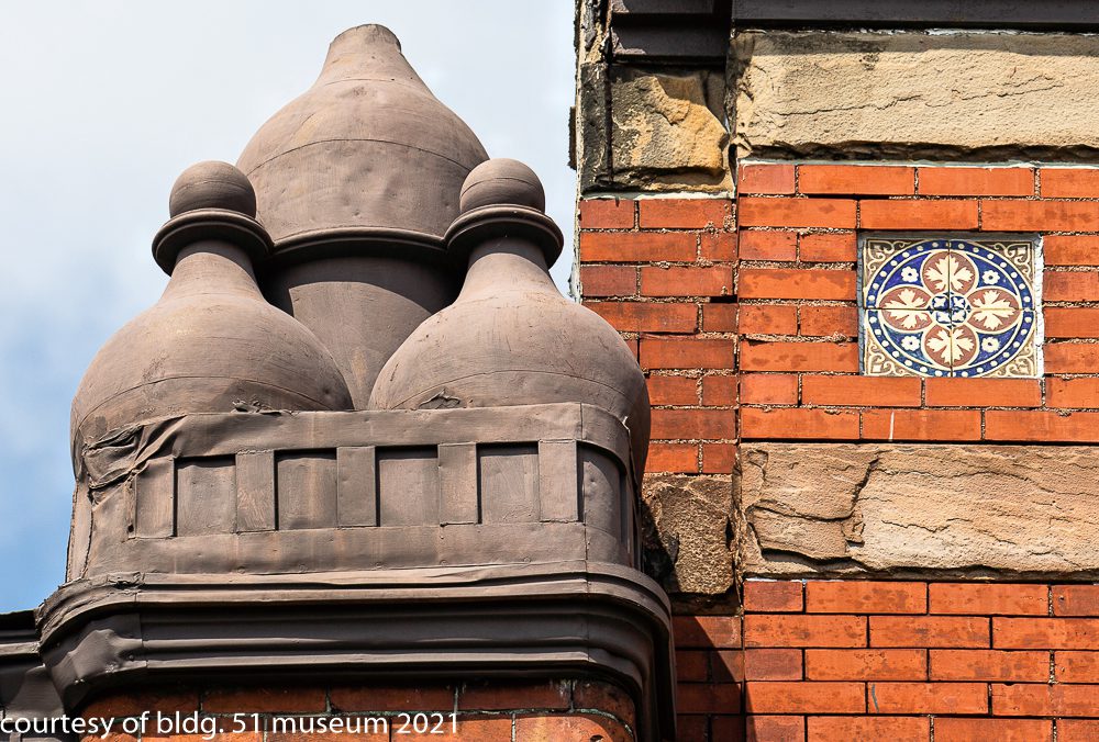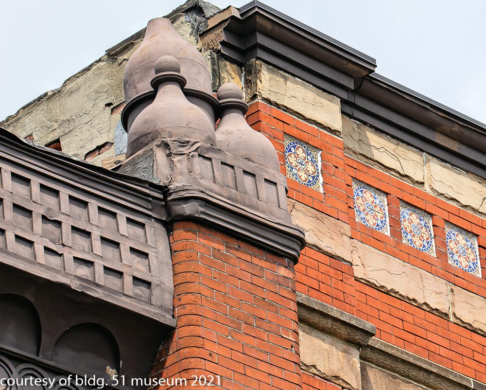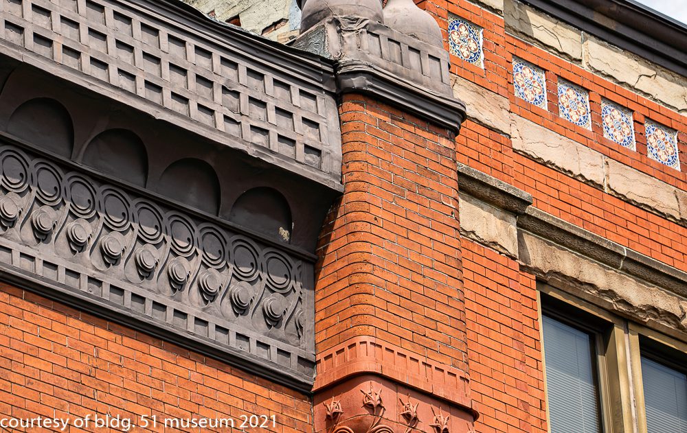 the exterior features unglazed reddish-orange terra cotta (executed by the northwestern terra cotta company, chicago, ills.), a stamped or pressed galvanized tin cornice, and bedford limestone panels with deeply incised ornament.