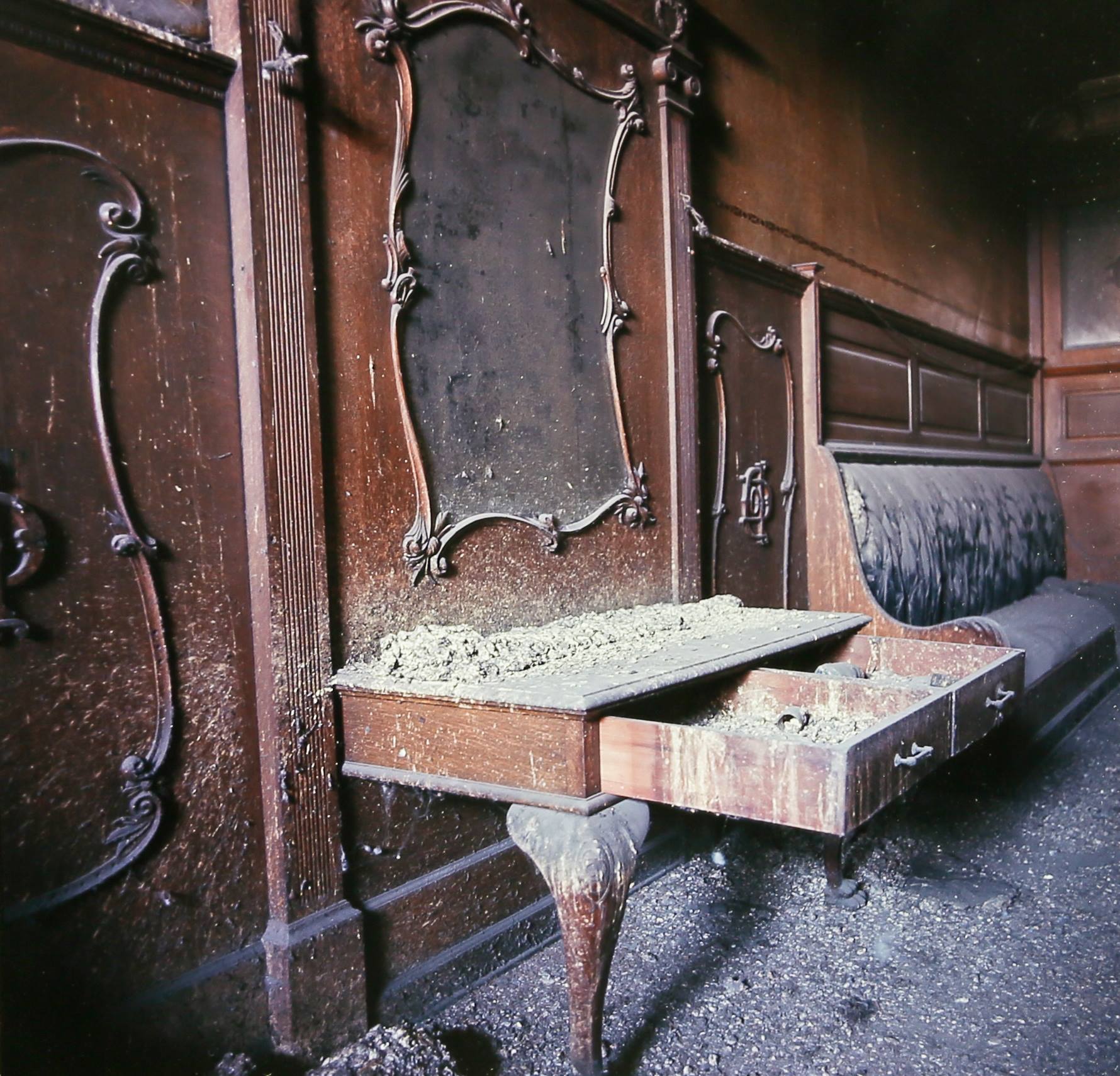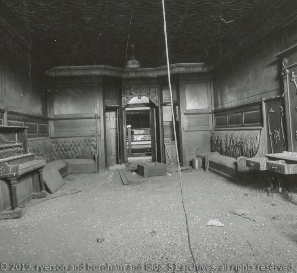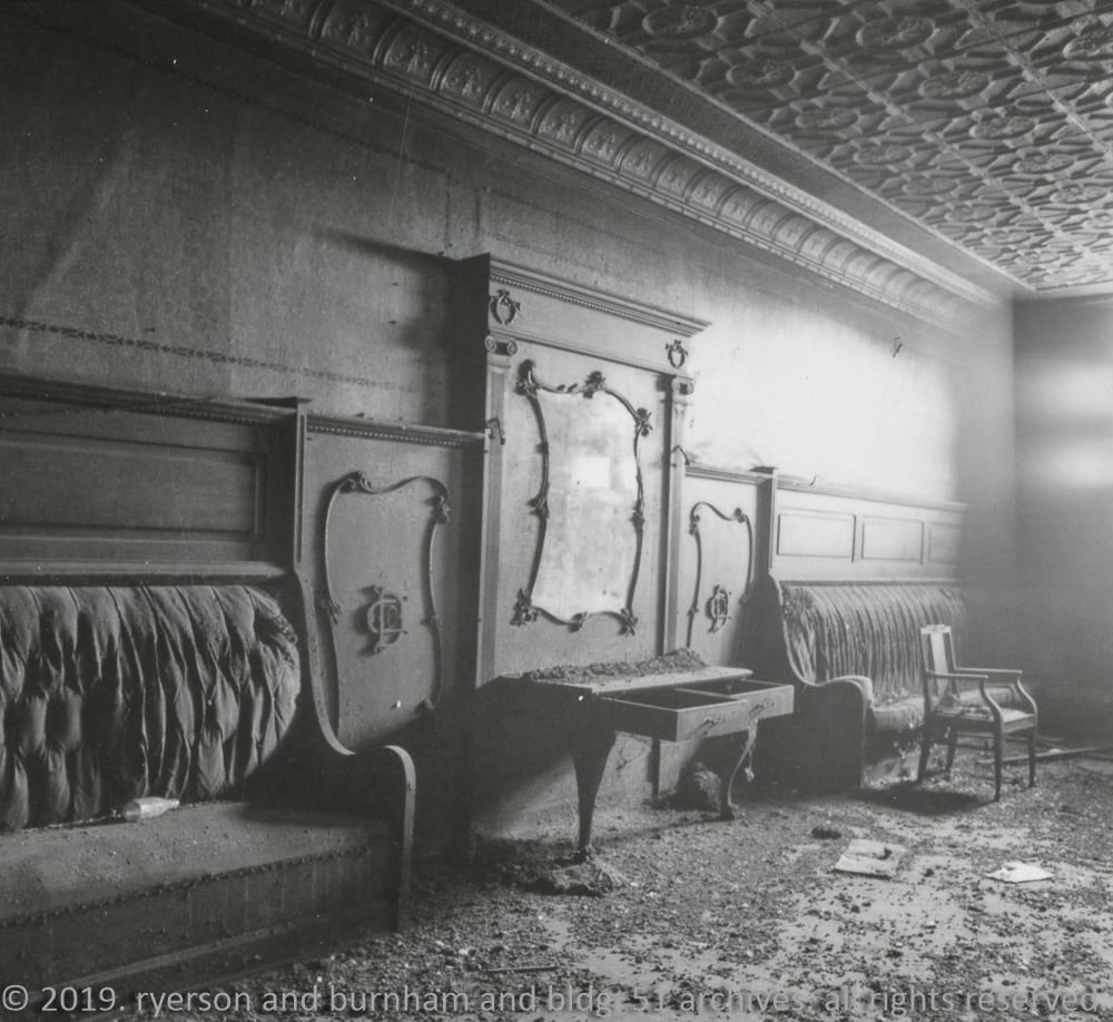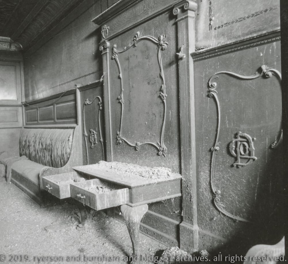 vinci documented a few of these rooms that hadn’t been altered much since the time it was built. the images of an officers’ lounge with quartered oak wood-paneled walls, bench seating, and a monogrammed desk or console are the most compelling in my opinion.