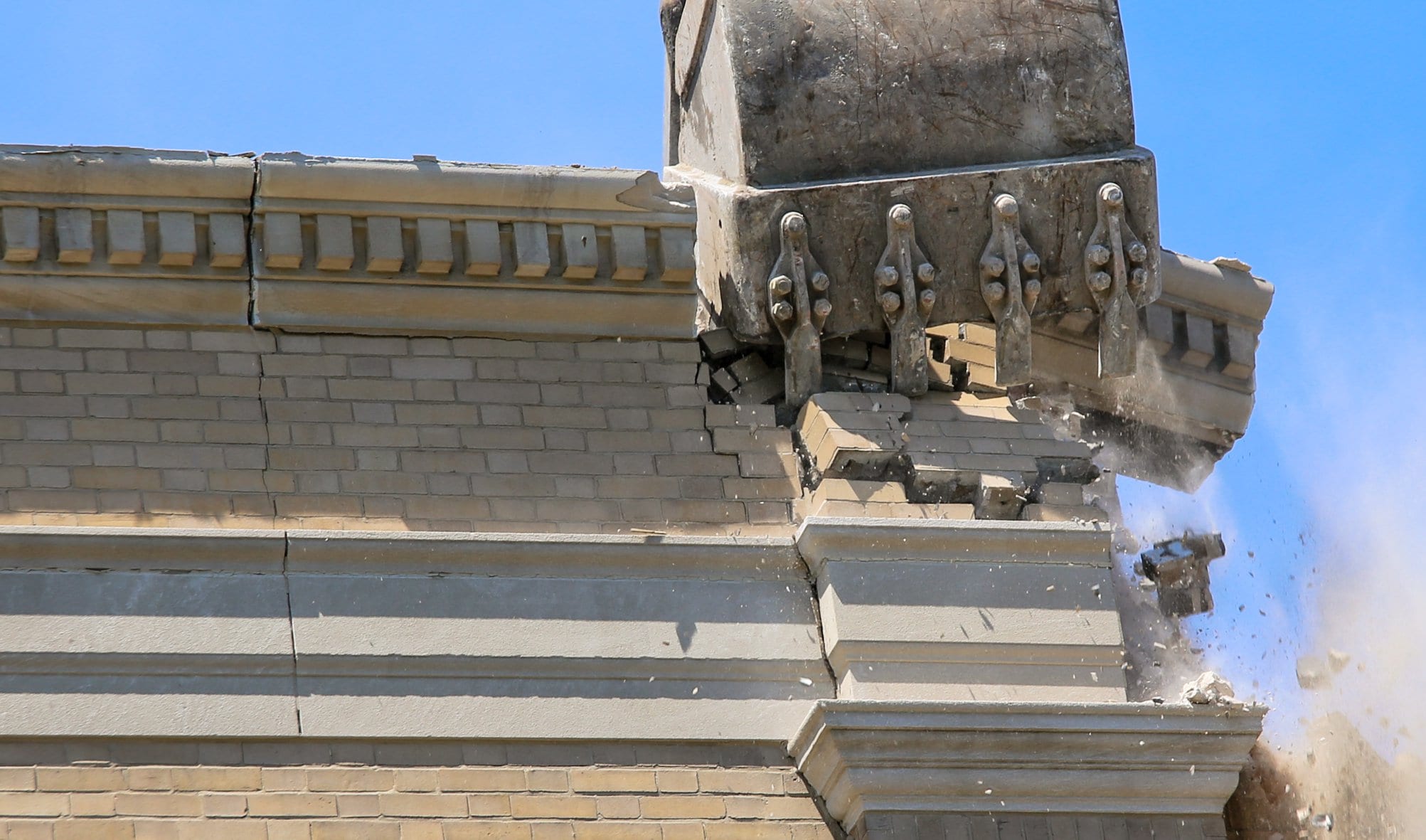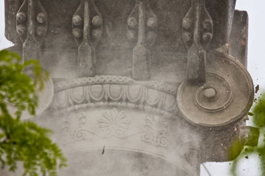 when i was notified of the building’s fate, i quickly made my way over to begin documenting it before the green fence and/or scaffolding was put into place. from afar, i didn’t notice any immediate signs indicating its impending doom. upon closer inspection however, i was taken aback over the fact that the power to the building had already been cut and the placement of a bright orange “building closed” notification which clearly provided evidence that preparation for demolition was well on its way. despite this, i managed to capture photographs of the facade, with its carved “bedford” or indiana limestone facade containing massive cylindrical columns topped by ionic capitals accentuated with high-relief egg and dart and anthemion design motifs wrapped beneath the protruding volutes.