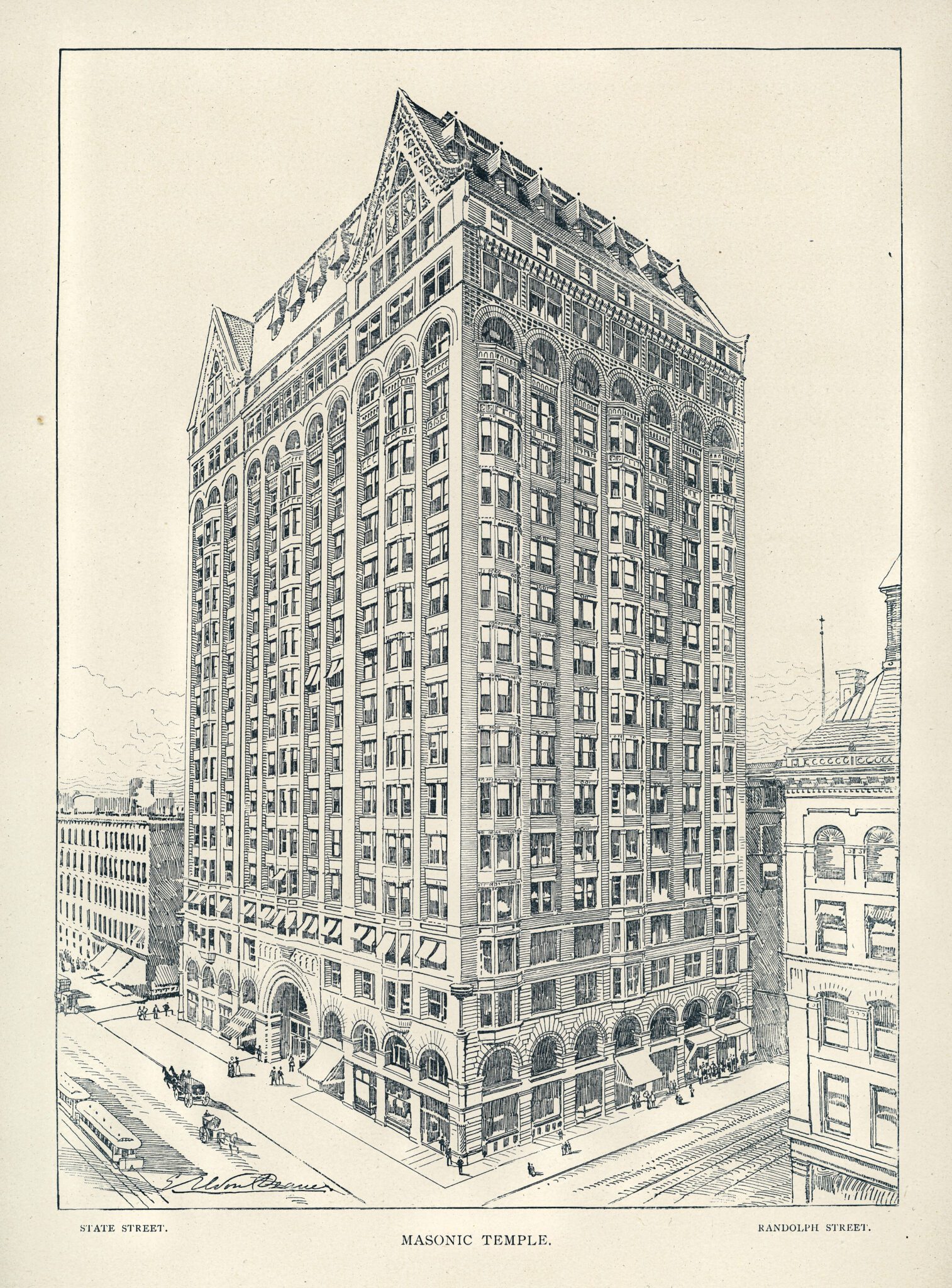 burnham and root’s masonic temple building (1892) was located erected on the corner of state and randolph. the 21-story skyscraper was demolished in 1939. sadly, john wellborn root and the masons’ primary representative, norman gassette, died during its construction.