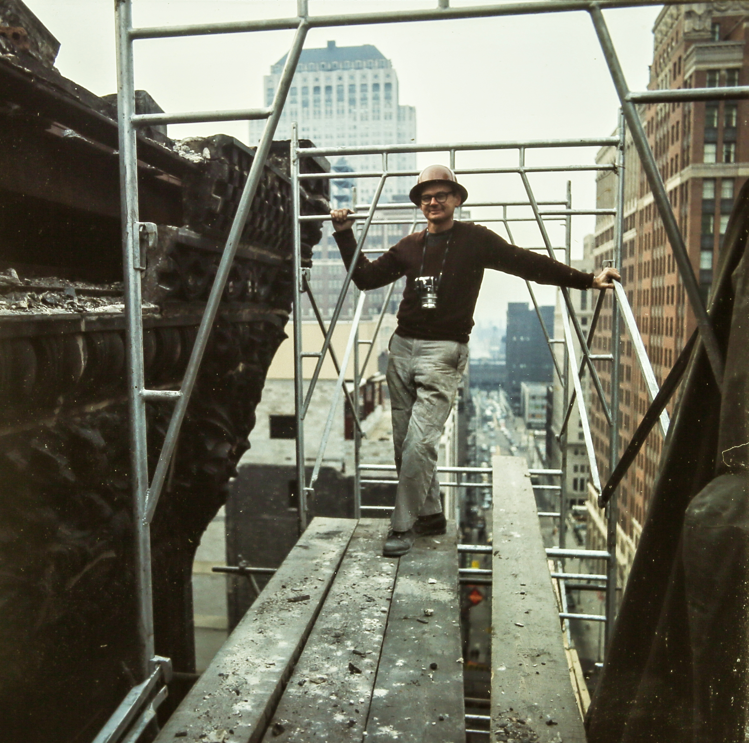 kodachrome slide of richard nickel in 1972 – photographed by john vinci. both nickel and vinci where shooting the chicago stock exchange demolition using hasselblad 500c cameras.