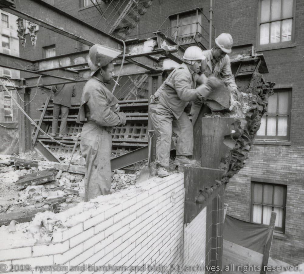 after looking closely at nickel’s contact sheets, i’m amazed at how methodical he was – salvaging and/or documenting every stage of the building’s slow and agonizing death. and, there is nothing worse than having a camera in one hand and a wrecking bar in the other. it’s truly a dangerous balancing act. wrestling around with terra cotta while high up on scaffolding is no picnic either.