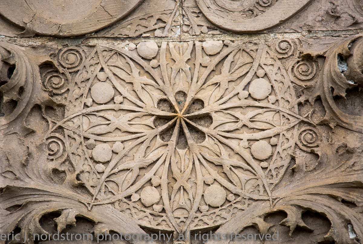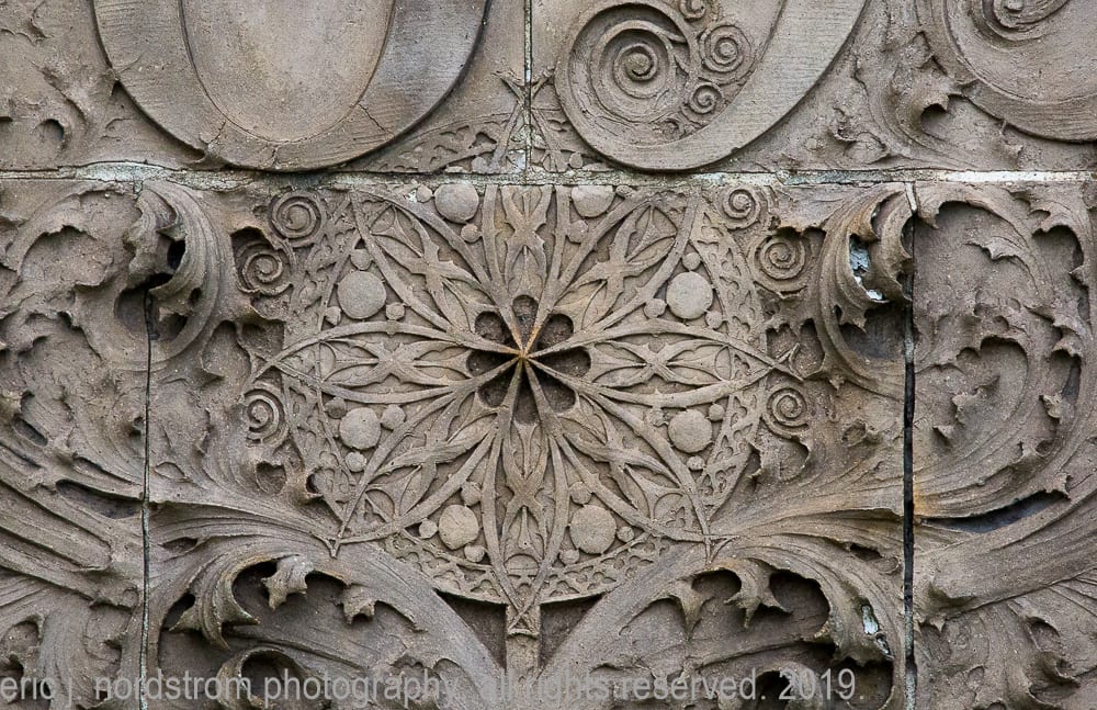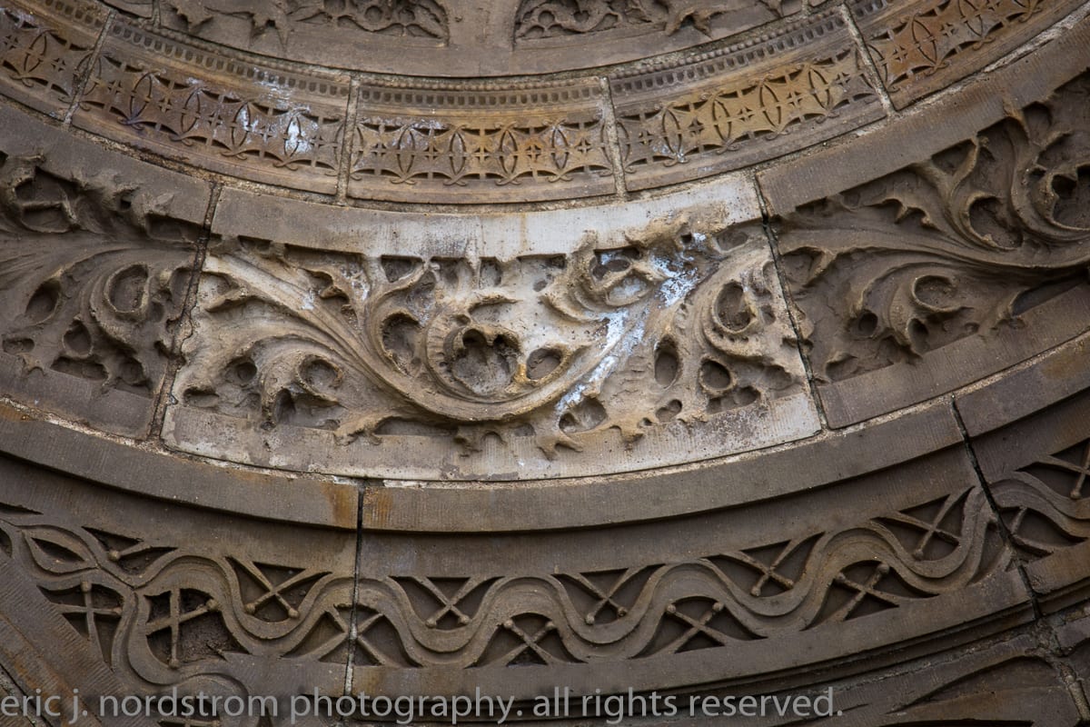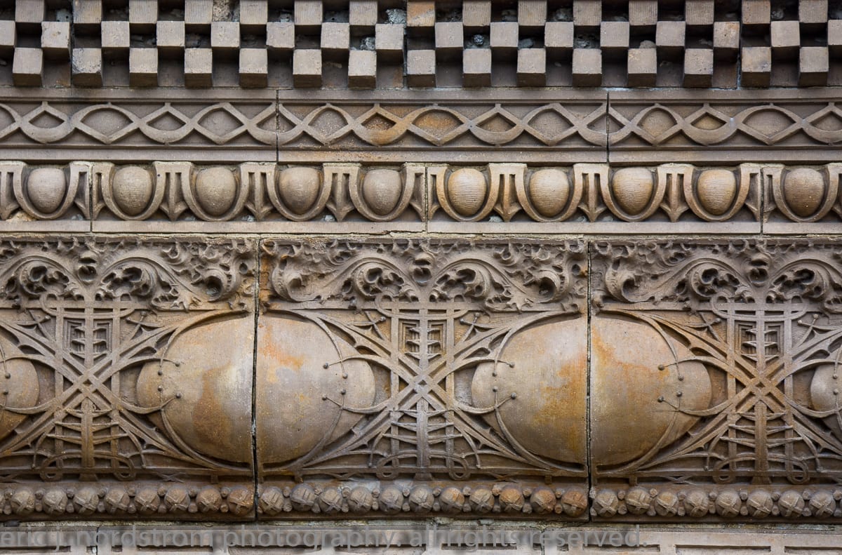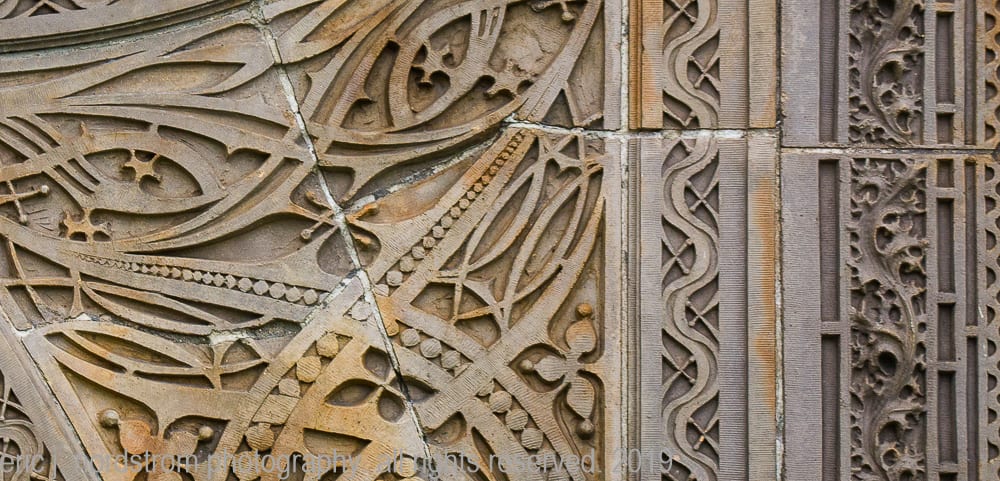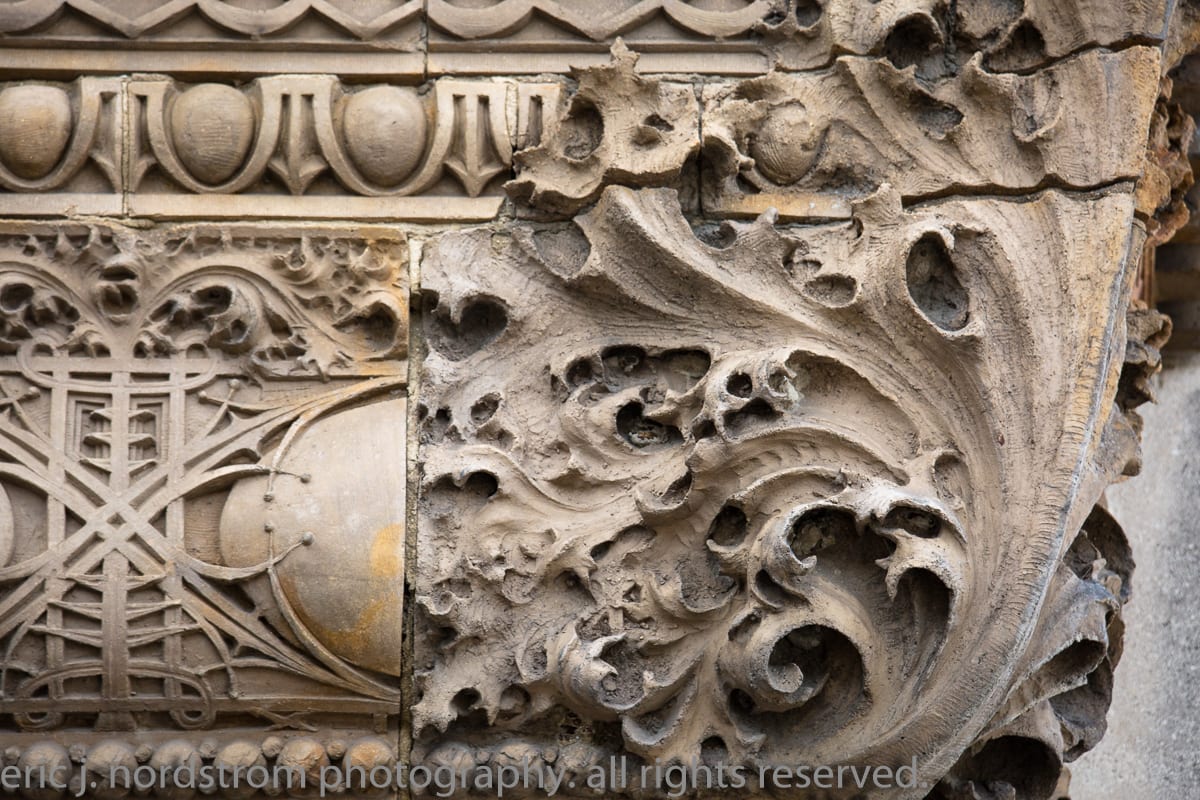 having trained as a scientist years ago has instilled upon me a relentless inclination to take things apart – study them intensely in isolation – then painstakingly reconstruct them to gain a better understanding of the system with all of its working parts. i used that method the other day when documenting the reconstructed chicago stock exchange building (1895) freestanding terra cotta entrance arch that was taken apart and carted off into storage during the building’s untimely demise in 1972. it was a great exercise to identify and document each and every sullivan-designed design used in the creation of a heavily ornamented arch bursting at the seams with an integration of organic energy that overwhelms the mind’s eye. it’s hard to look away.