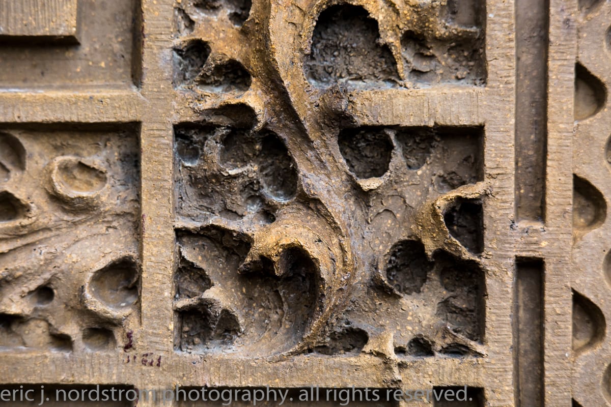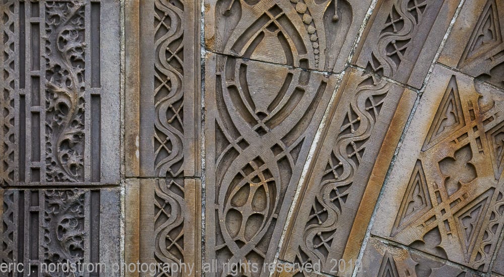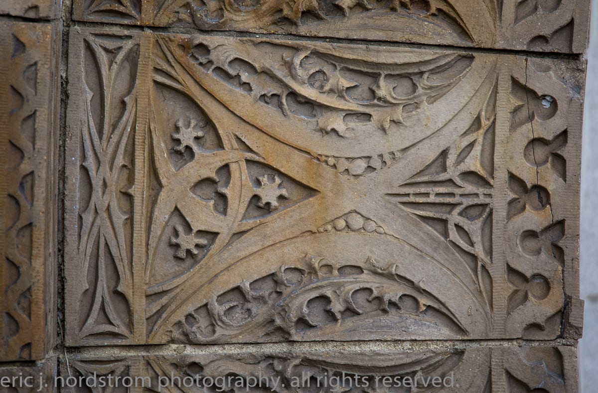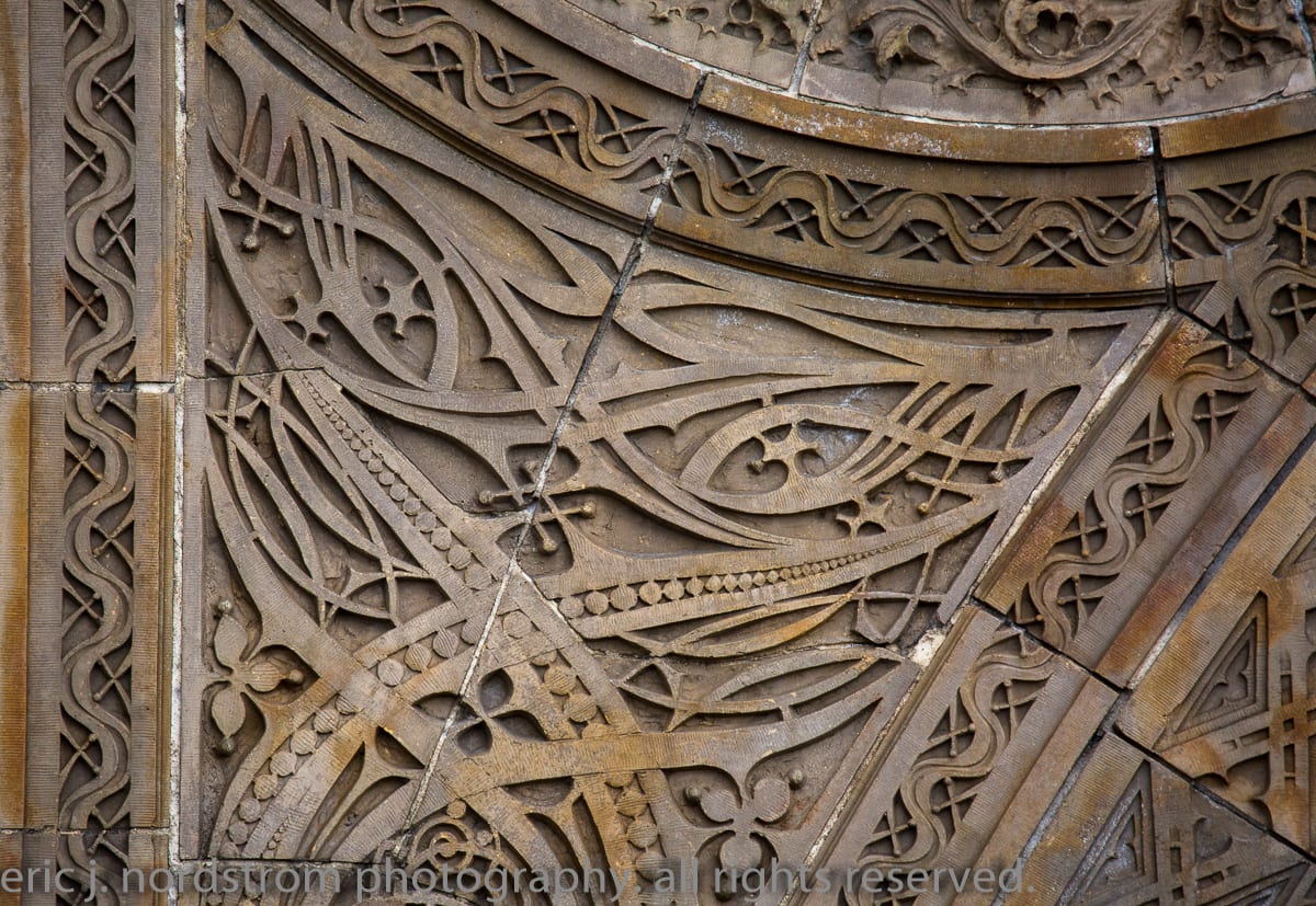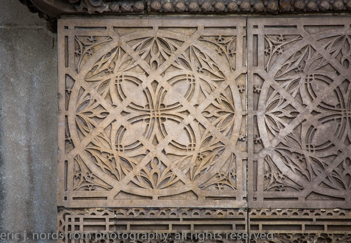 having trained as a scientist years ago has instilled upon me a relentless inclination to take things apart – study them intensely in isolation – then painstakingly reconstruct them to gain a better understanding of the system with all of its working parts. i used that method the other day when documenting the reconstructed chicago stock exchange building (1895) freestanding terra cotta entrance arch that was taken apart and carted off into storage during the building’s untimely demise in 1972. it was a great exercise to identify and document each and every sullivan-designed design used in the creation of a heavily ornamented arch bursting at the seams with an integration of organic energy that overwhelms the mind’s eye. it’s hard to look away.