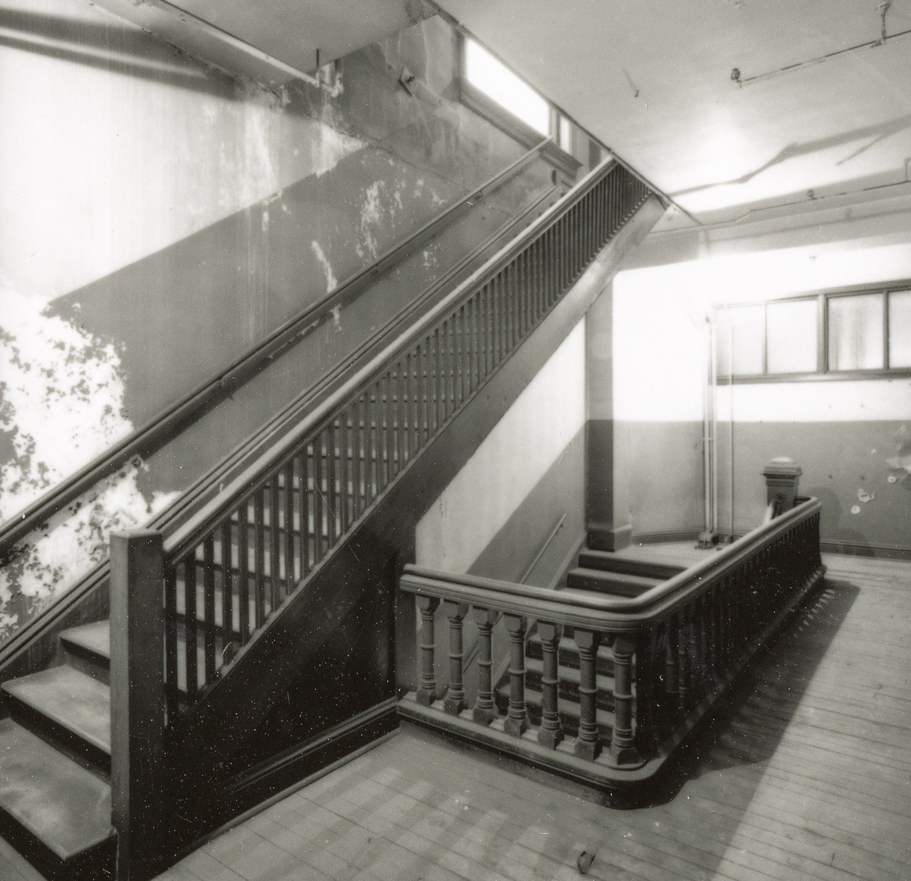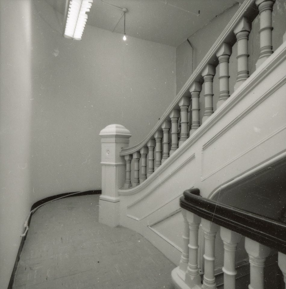 seldom seen interior images of william le baron jenney’s first leiter building (1879) taken by richard nickel before its demolition in 1972. the images show the building’s original heavily-built wood staircase consisting of elegantly turned newels and box-shaped newels accentuated with “bullseye” rosettes.