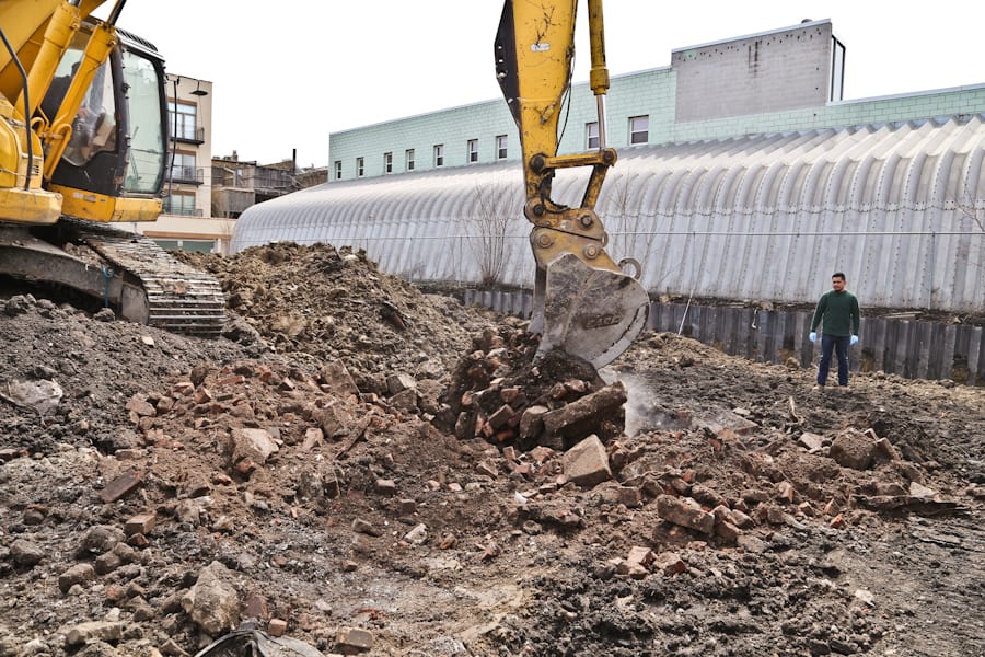 EXCAVATION OF RECENTLY DEMOLISHED CRANE BROTHERS FACTORY BEGINS, PAVERS AND PAPERWORK UNEARTHED