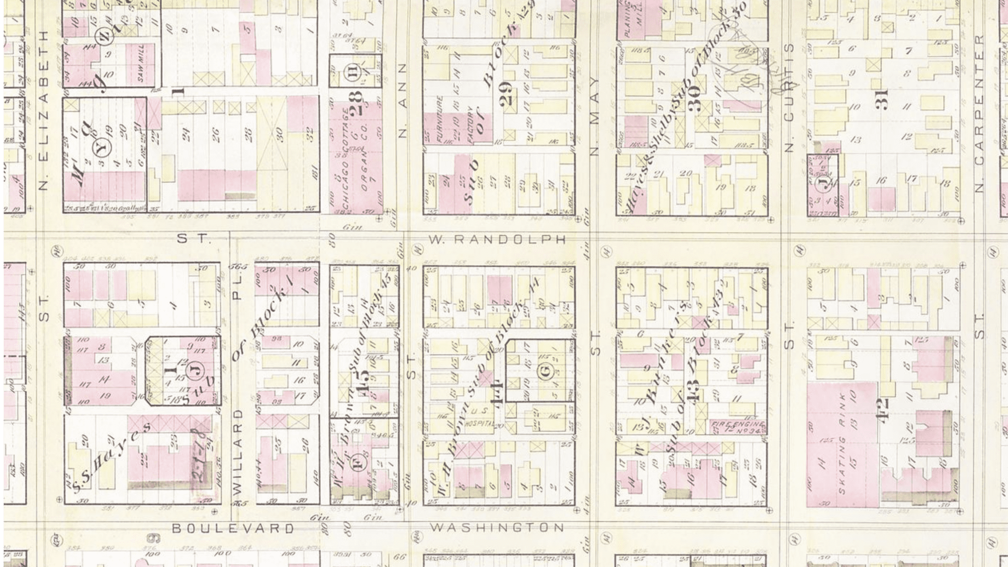 1886 robinson’s map of chicago shows hopper residence and surrounding structures on block. the horse stable (yellow rectangular box with and x) was demolished long ago.