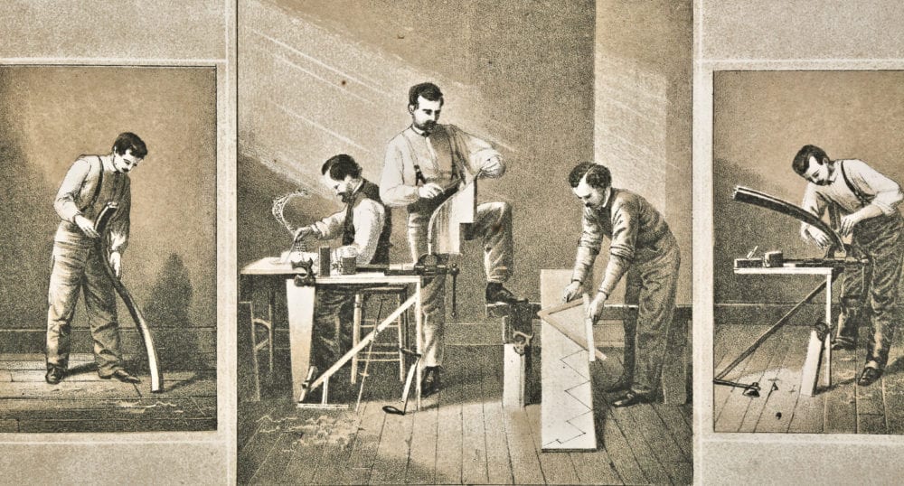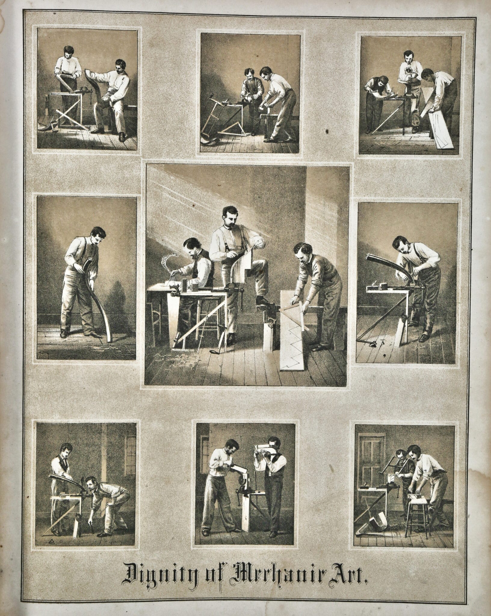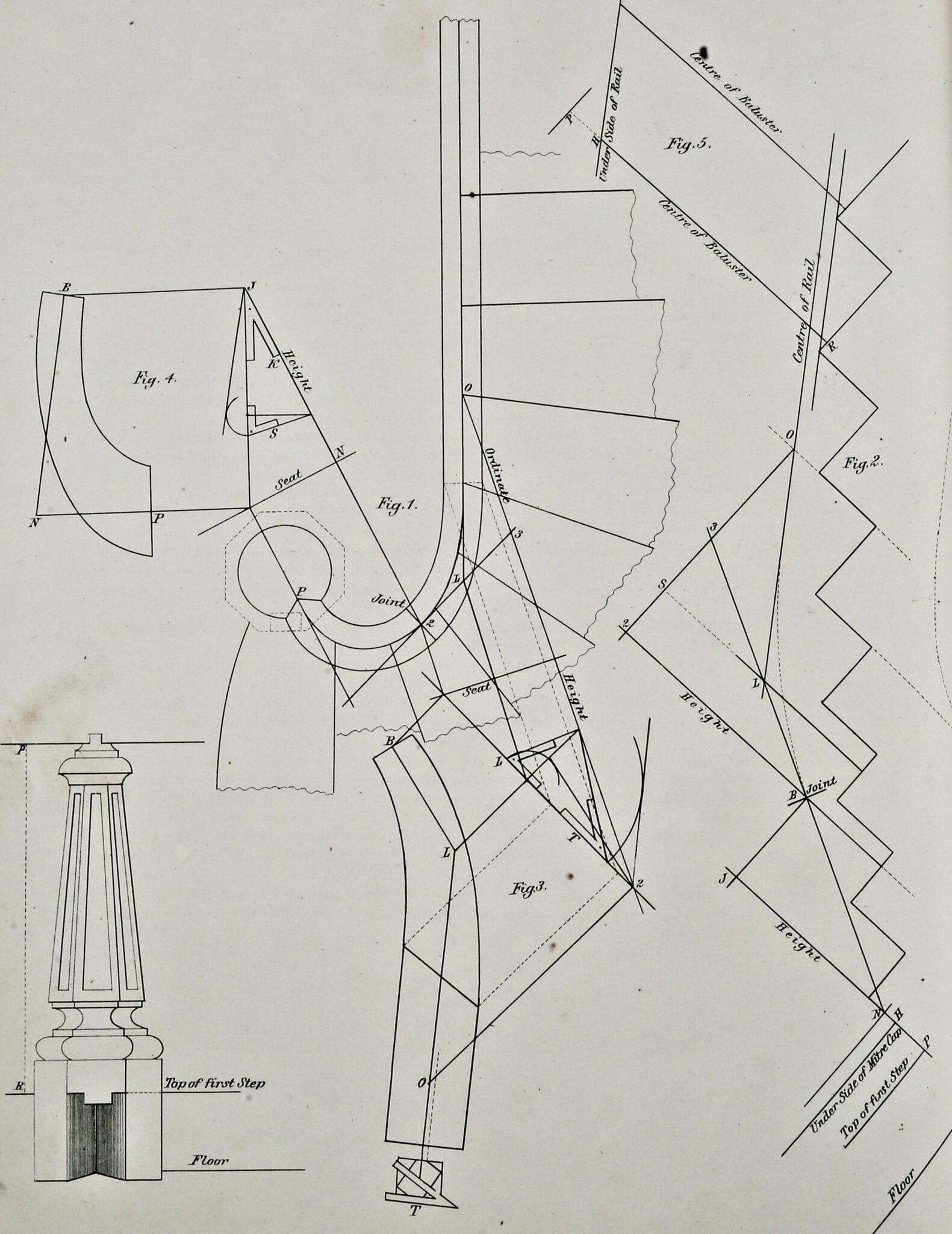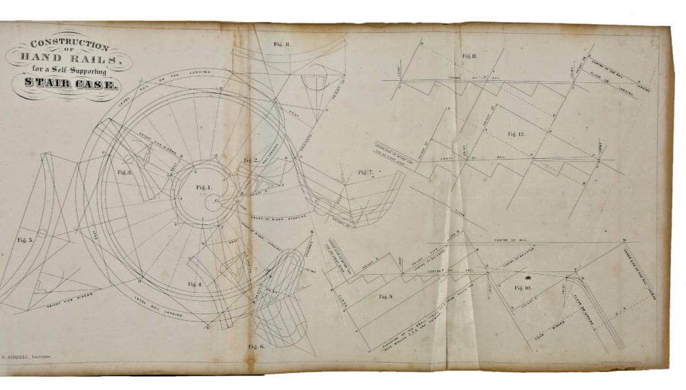 around the time i began salvaging a chicago italianate row house constructed shortly after the fire, i was deeply immersed in the book, “the carpenter and joiner, and elements of hand-railing,” written by robert riddell in 1869. the highly technical book discusses the “art” of stair building in great detail pertaining to methodologies with several plates illustrating construction techniques focusing on every conceivable cut necessary to build any number of staircases in a variety of configurations.