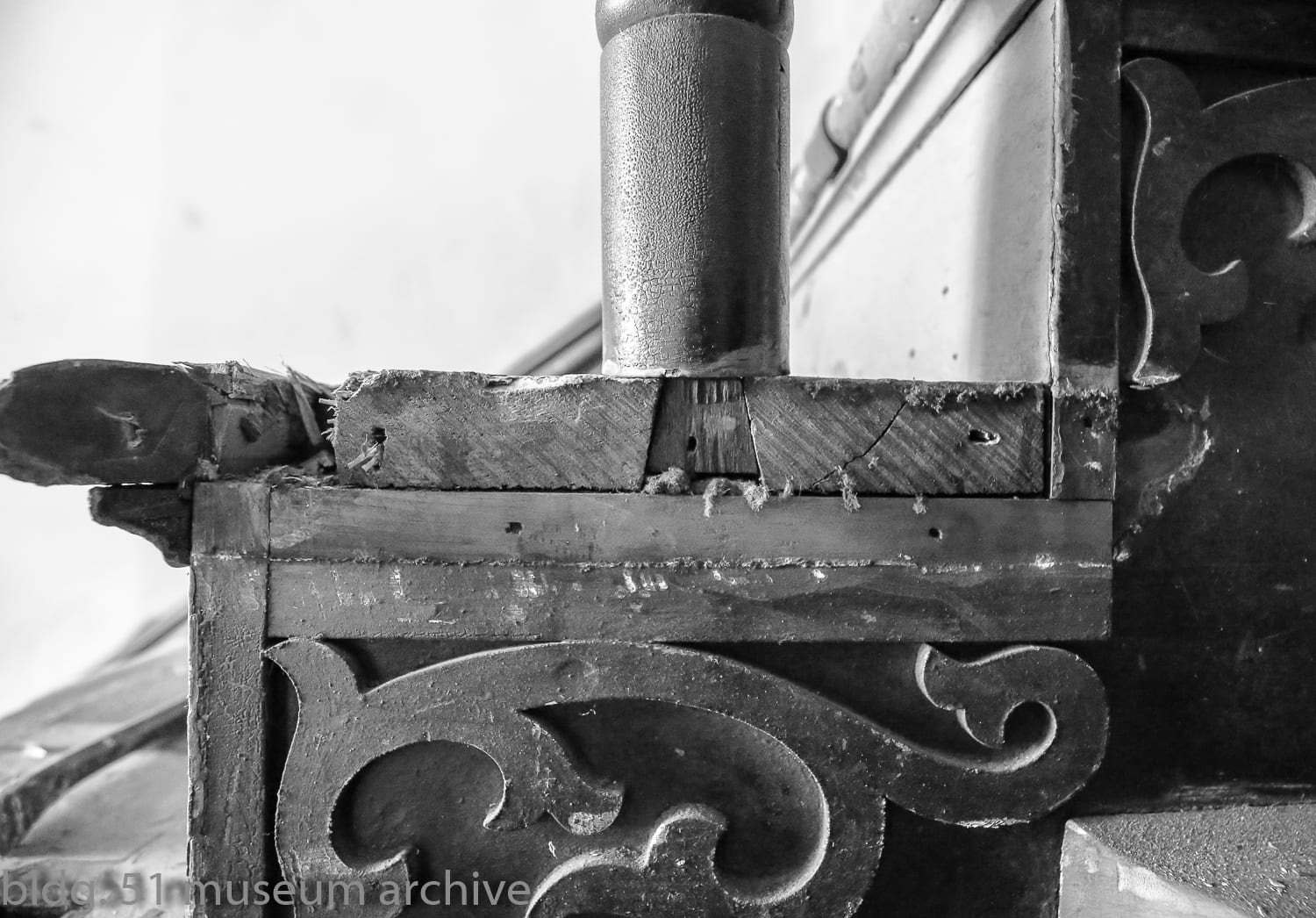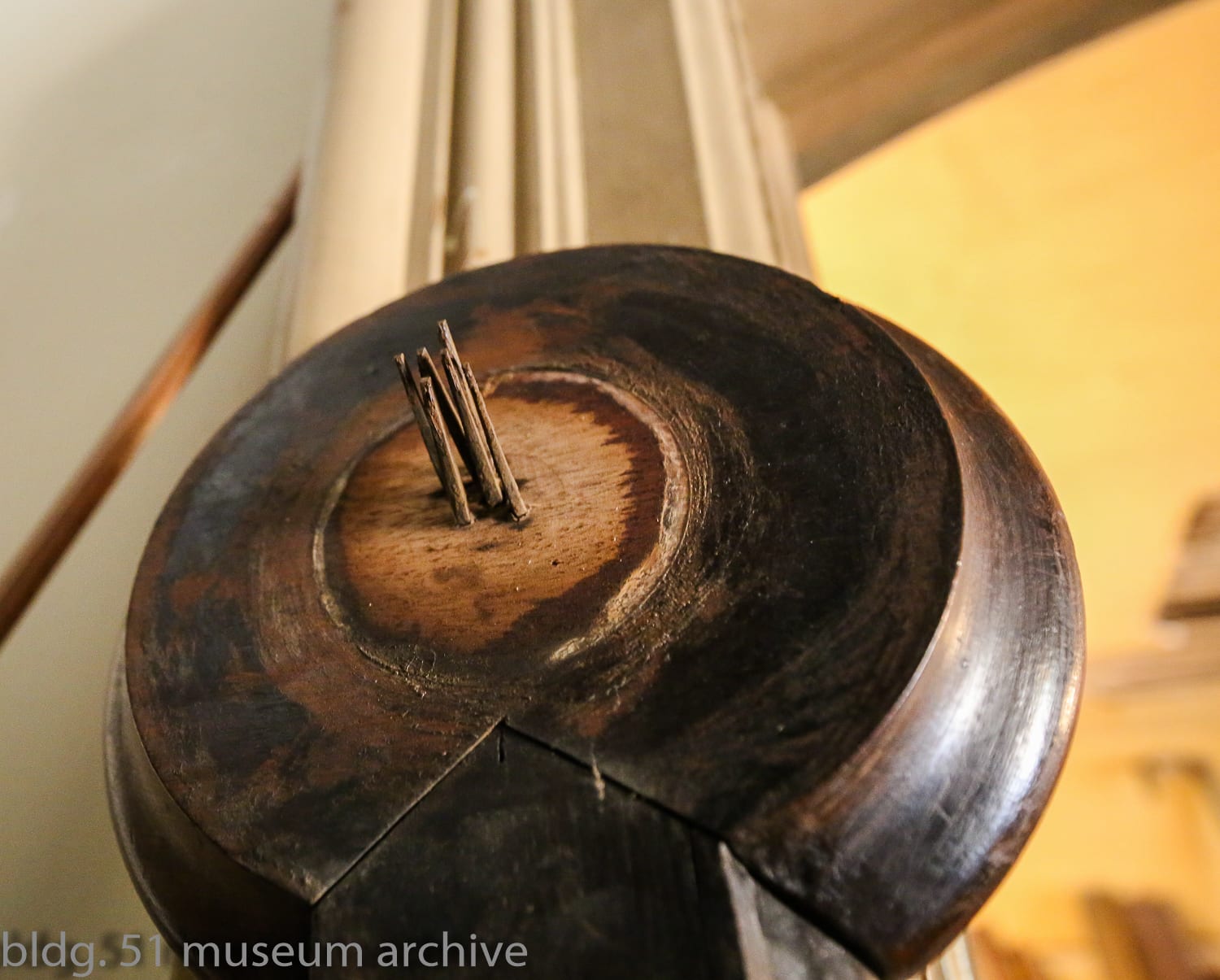 stair tread showing spindle’s exposed dovetailed joint reinforced with a single nail. two spindles were mounted to each tread.
