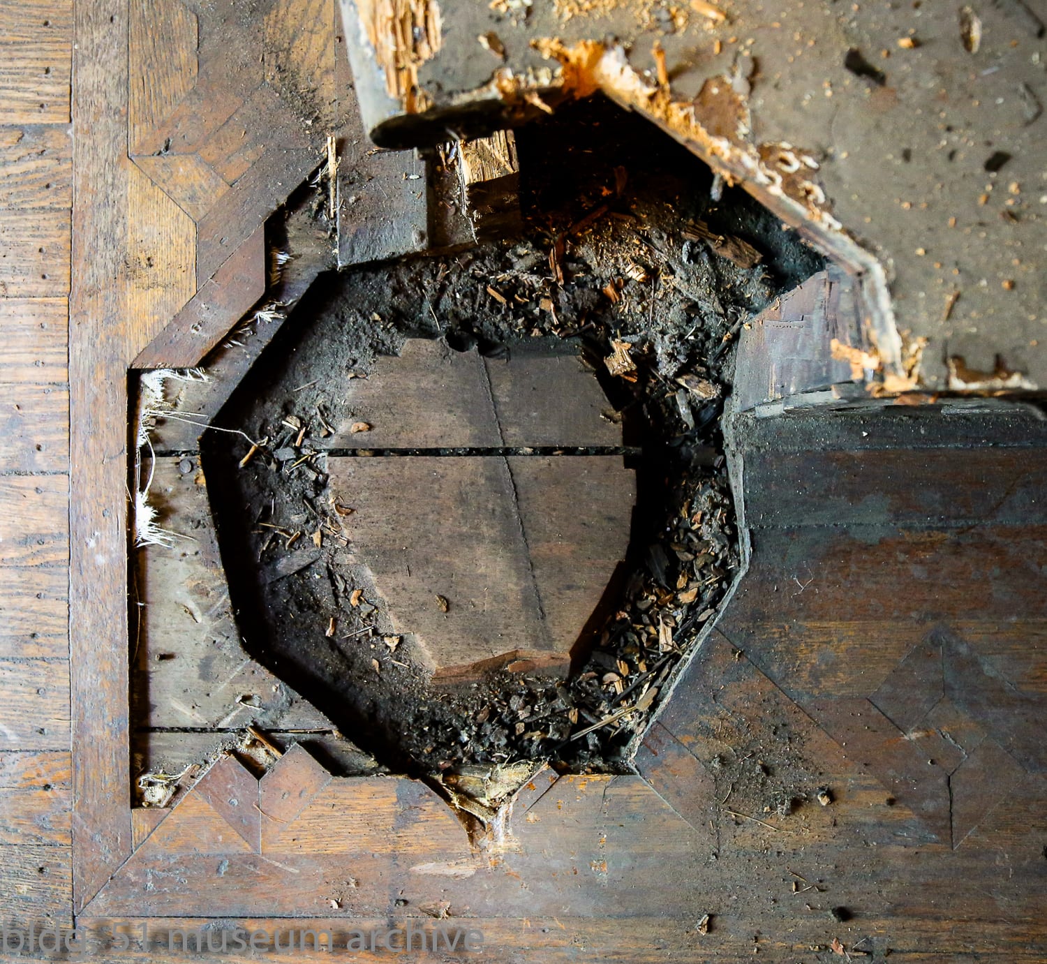 with the use of hand tools, carpenters cut in and around the sub-flooring to anchor the multi-part, octagonal-shaped newel post in place. wood filings are commonly found where the newel was formally positioned once carefully extracted during deconstruction. the combination oak and walnut wood geometric mosaic parquet floor was installed after the staircase was installed.