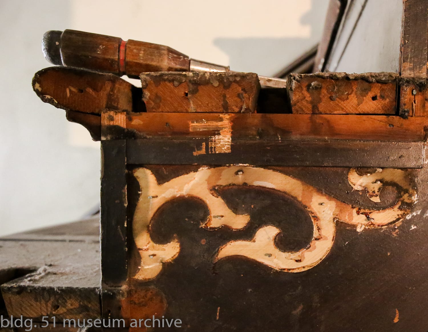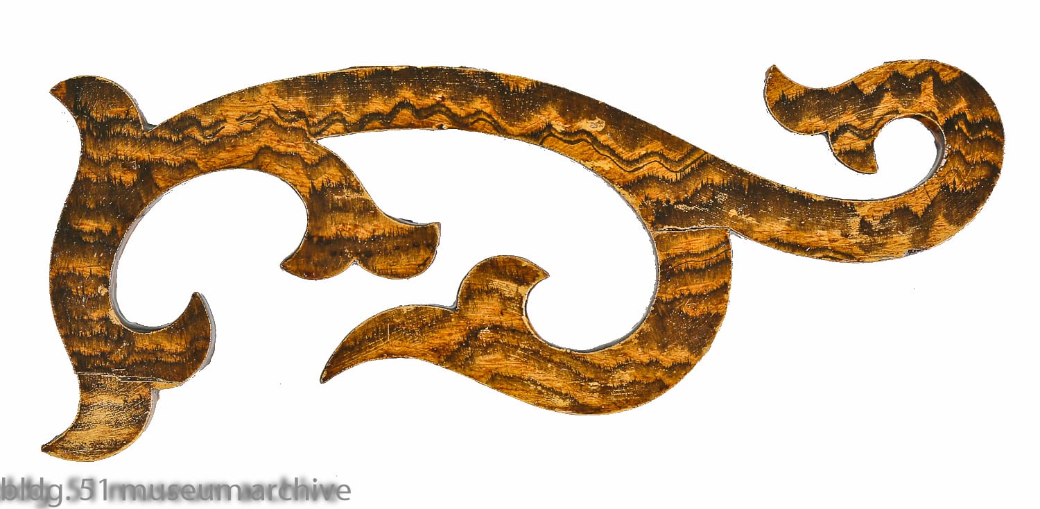 one of several delicate fret-sawn appliqués or decorative elements carefully removed from a staircase stringer leading to the second floor. each single-sided element is comprised of white pine. on average, approximately ten finish nails were used to set each piece in place. interestingly, after gently removing a dark stain, i discovered a striking hand-applied faux wood grain finish. i have yet to verify whether its the original treatment used upon installation.