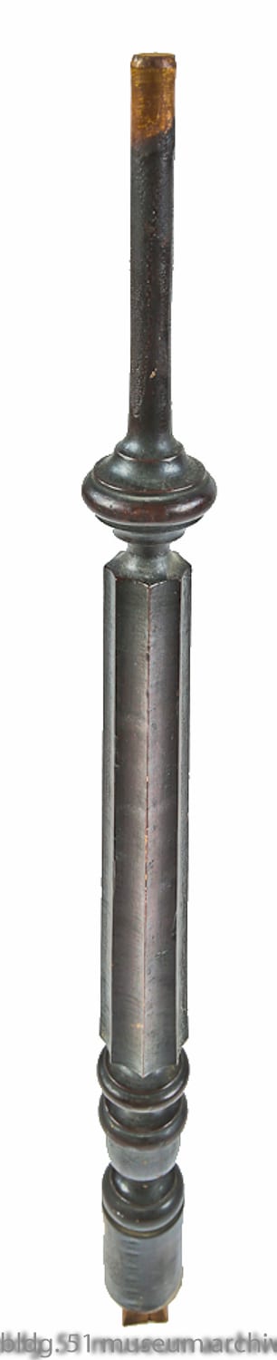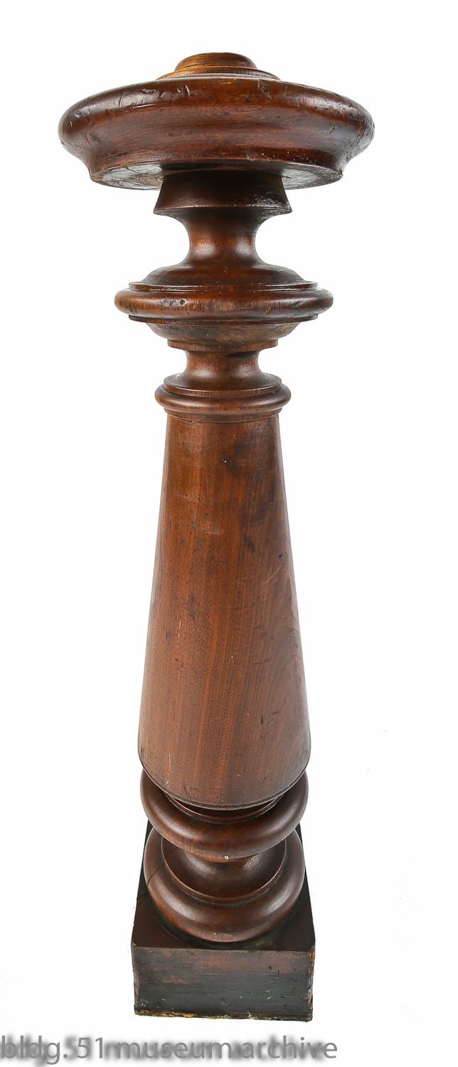 with the exception of normal wear and tear, the faceted and recessed paneled walnut wood newel post remains in remarkable condition. the upper section of the post is comprised of multiple lathe-turned sections or components held in place by a centrally located steel rod with threaded end and nut concealed by the circular-shaped newel cap finial. the original stained finish has darkened considerably over time. unlike other newels of the periods, this example does not feature burled walnut veneer within the recessed panels.