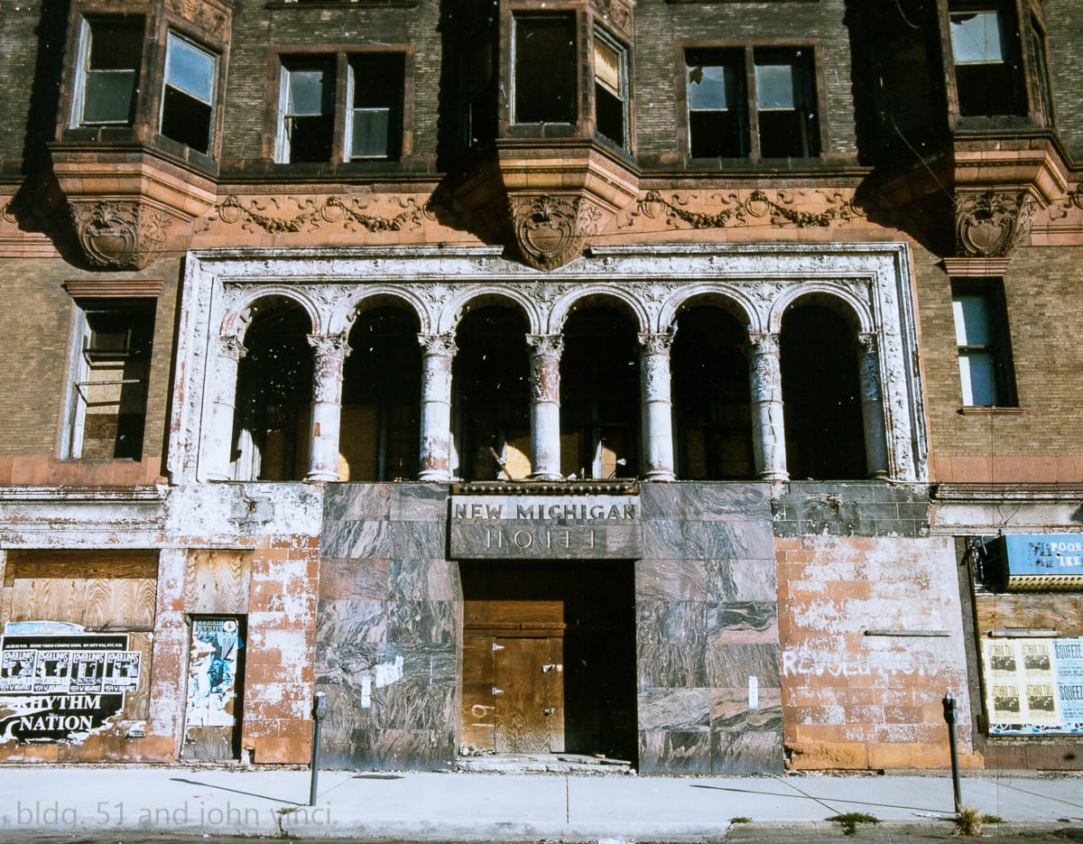 the lexington was renamed the new michigan hotel in 1938. the hotel became increasingly surrounded by blight after world war ii, and descended into a haven for prostitutes and transients. the hotel officially closed in 1980. by 1985 the endangered hotel was placed on the national register of historic places. yet it was an abandoned hulk and a blight on the neighborhood (i.e., covered by soot, boarded up on the ground floor, raided by vandals, and its upper floor windows broken and exposed to the elements. the building was finally demolished in 1996 by national wrecking.