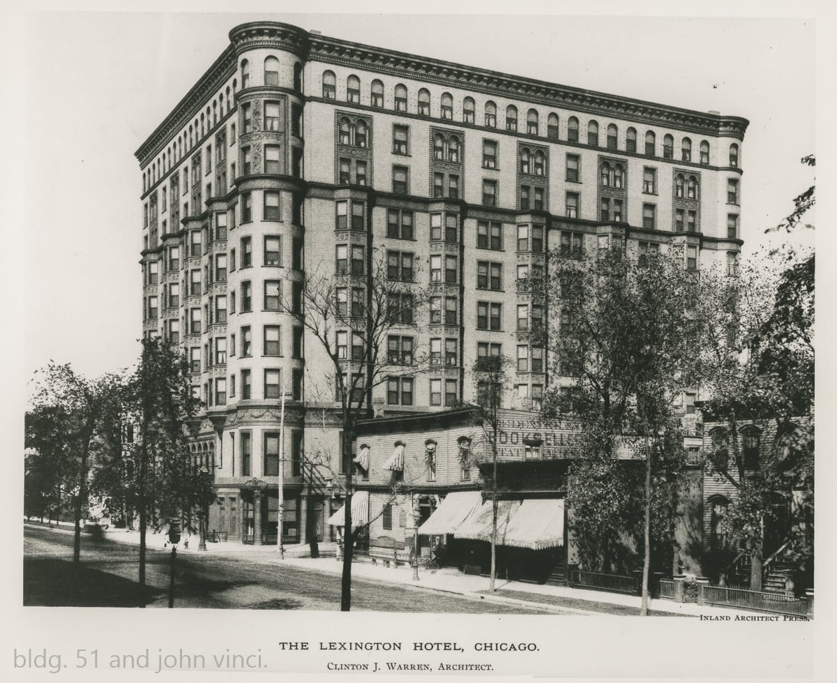 the neoclassical style hotel lexington building was designed by chicago architect clinton j. warren in 1891-92. in a four-year span (from 1889 to 1893), warren designed the congress hotel, the leander mccormick apartments, the metropole hotel, the plaza hotel, and the lexington. with the exception of the congress hotel, the other buildings have been demolished.