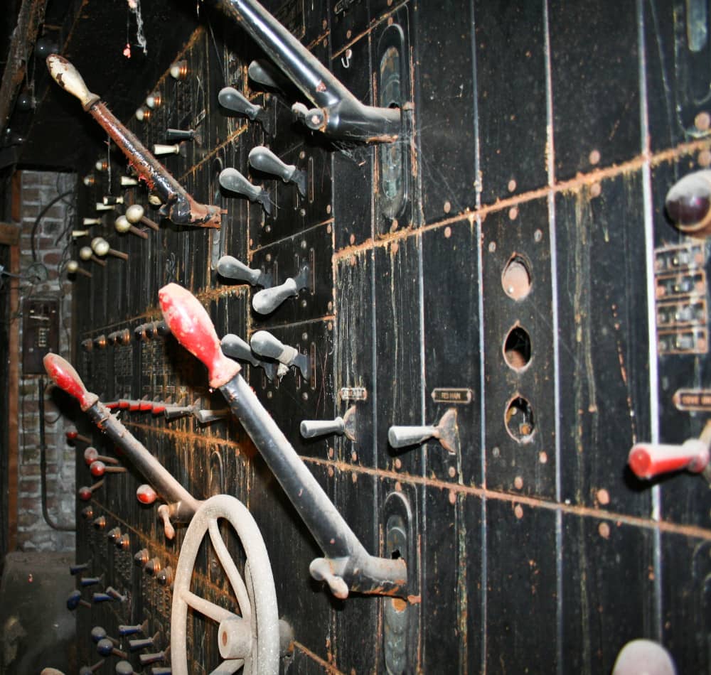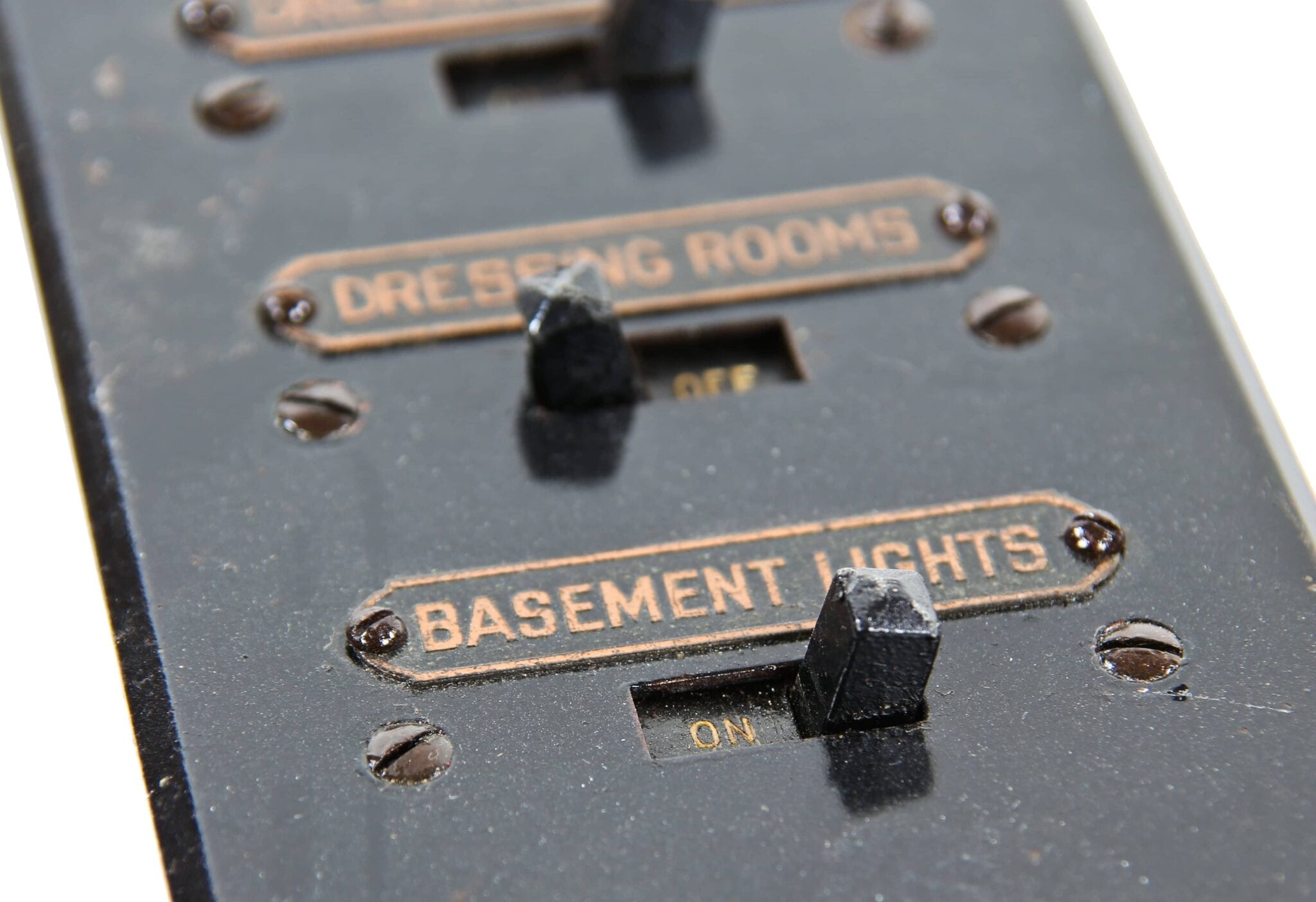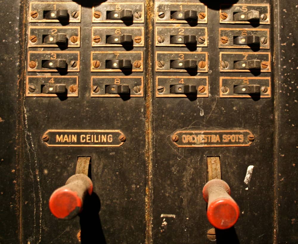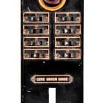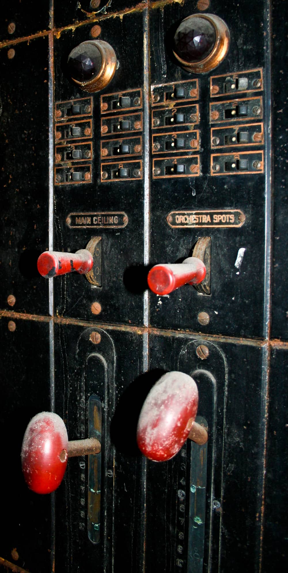 the non-extant lawndale (opened as the new yiddish lawndale theater) at 4015 w. roosevelt, salvaged nearly 8 years ago, was an exemplary site for rescuing antiquated lighting equipment housed near the east side of the stage within the cavernous atmospheric theater (also built in 1927). the lawndale was a 2,200 seat venue renamed the rena theater in 1948. it served as a yiddish theater for a time, and finally closed in 1963, only to be converted into a church before its eventual demise. the massive and remarkably intact “major” lighting control panel was partially salvaged in an attempt to represent a well-preserved late 1920’s technology that existed behind-the-scenes while completely transforming the ambiance of the room for theater-goers. the heavily integrated upright panel contained a grid-like configuration of multiple black enameled steel metal plates, complete with original bakelite switches corresponding to lighting in discrete parts of the building (i.e. the main ceiling, or the orchestra spots, dressing rooms, etc.). an operator controlled virtually all parts of the building from this single area, by frequently adjusting levers, cranks, switches, and so on. the panel was illuminated from above and each bay containing a collection of switches and dimmer levers would glow with multi-faceted, copper-encased indicator panel lights.