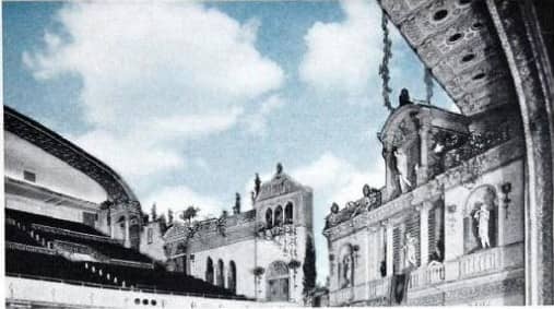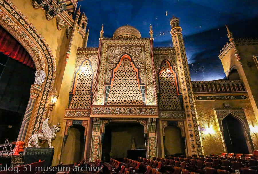 electronic and lighting effects were integral to creating these illusions. cove lighting would simulate the setting sun as the curtains opened, or constellations would flicker above to transform the room into a nocturnal space. projections on the ceiling using the brenograph magic lantern gave audiences the sensation of being in any number of settings at different times of day. the fantastical style is attributed to the austrian architect john eberson, who in 1923 created the houston majestic, the first so called “atmospheric theater” and a structure built at a fraction of the cost of a standard domed theater. one of eberson’s most elaborate projects in chicago was the avalon theater (1927), which combined middle eastern decor to mimic a persian mosque.