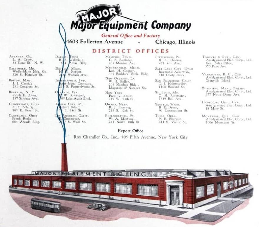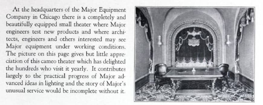 the lighting systems and equipment used to outfit many chicago theaters during the depression were manufactured by the major equipment company, whose headquarters and factory were located at 4603 fullerton avenue, chicago, ills.