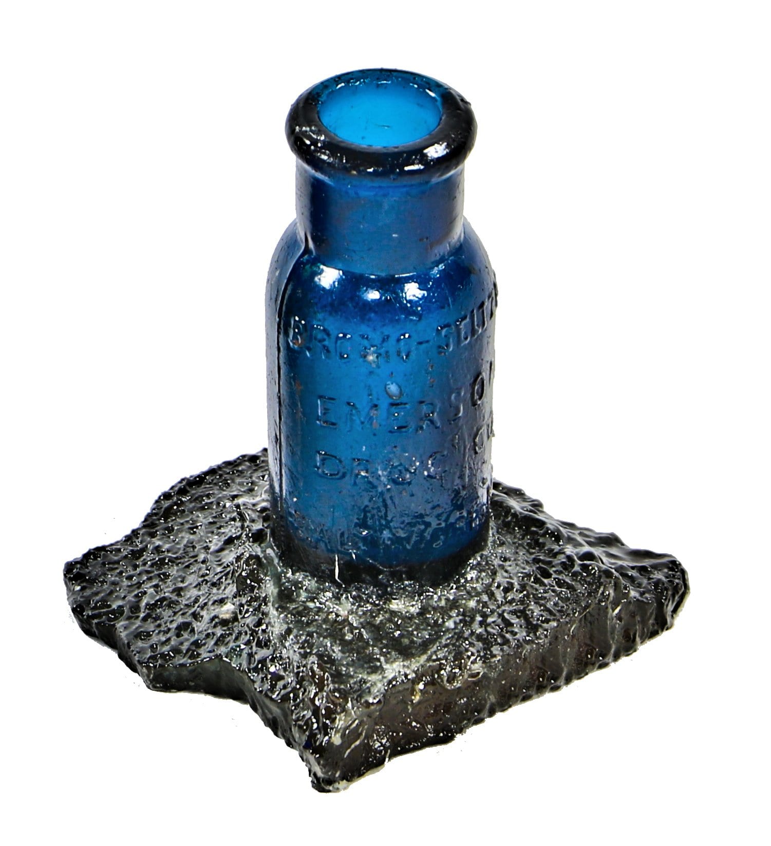 the bromo product reached the national market in 1891, and around the turn  of the century on, was distributed in deep cobalt blue glass bottles (although aqua, green, and other colors have been unearthed) with embossing of the product and firm. isaac emerson invented the remedy they contained, and between 1900-1970, the emerson drug company commissioned more than 20 variations of the bottles in at least 7 sizes.