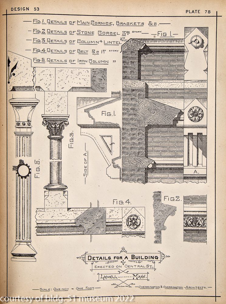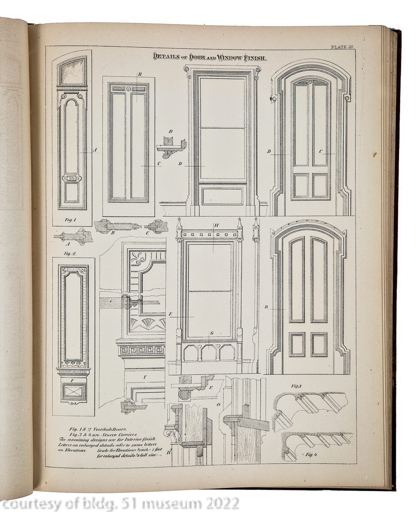 “showing a great variety of designs for cornices, brackets, windows, window caps, doors, piazzas, porches, bay and dormer windows, observatories, towers, chimney tops, balconies, canopies, scrolls, gable and sawed ornaments, fences, stairs, newels, architraves, mantels, plaster finish, etc., etc. including 45 perspectives, elevations, and plans of modern designs for cottages with details and 18 elevations of summer houses, villas, sea-side cottages and country houses. together with 14 designs for street and store fronts, with inside finish for stores and banks: also framing for dwellings, barns, exhibition buildings, roofs, bridges, etc., etc. making in all a practical book for architects, builders, carpenters, and all who contemplate building or remodeling wood, stone or brick buildings.”