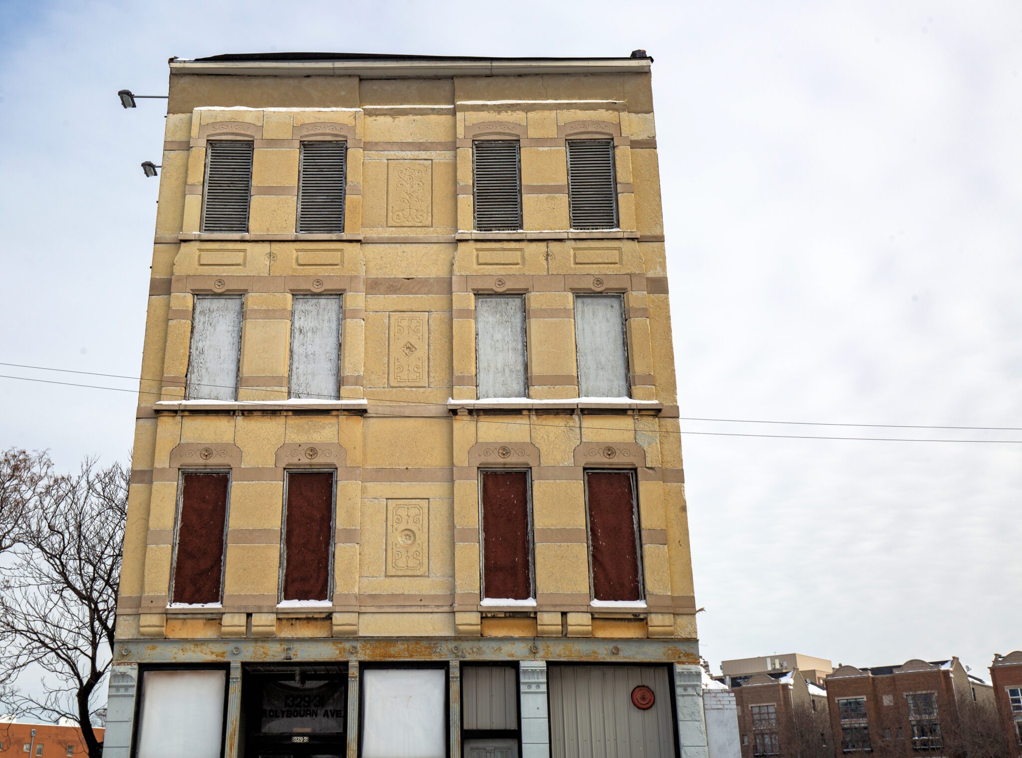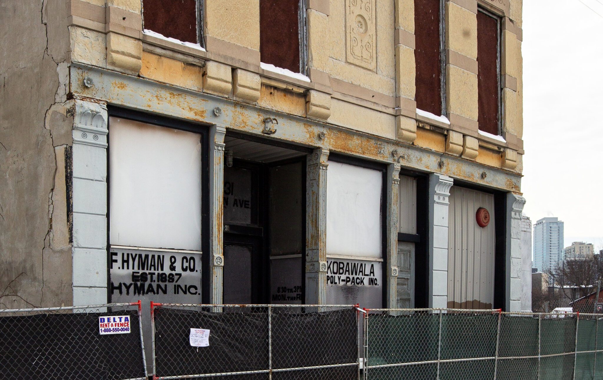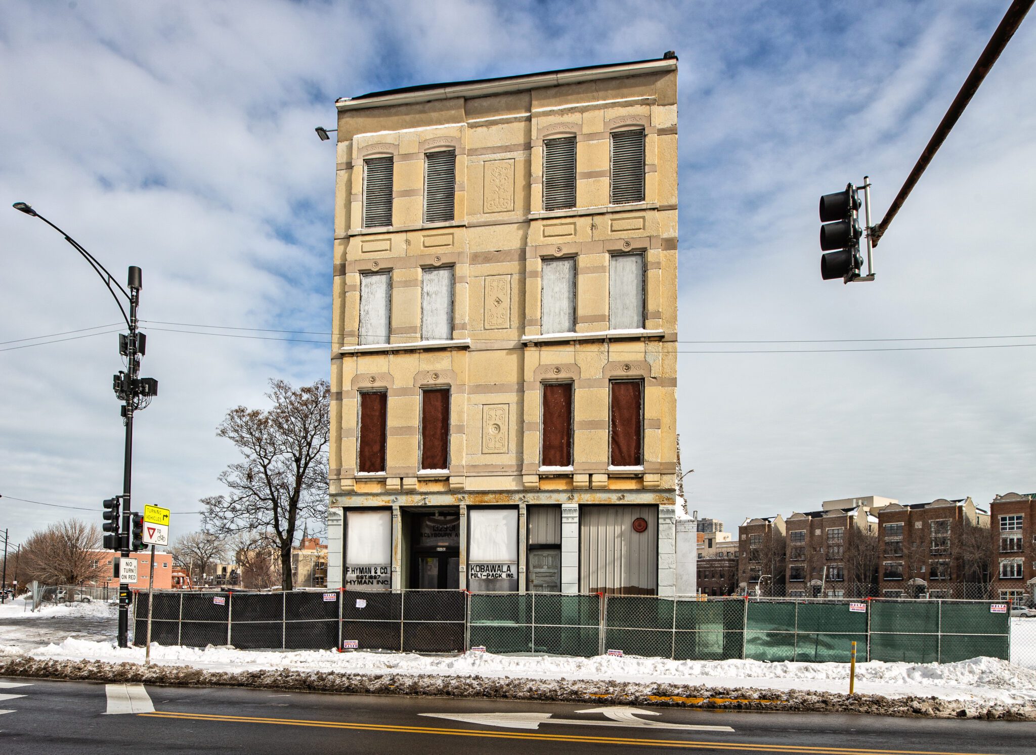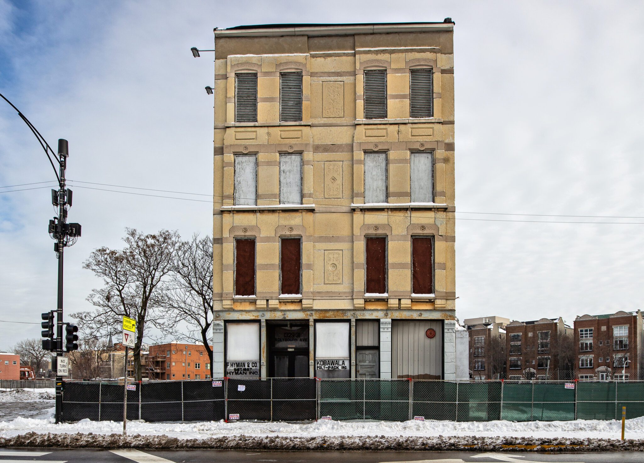 a largely intact 19th century five-story mixed-use commerical building featuring a unique facade comprised of lightly incised lemont and bedford limestone, will be demolished in the coming weeks. located at 1329 n. clybourn avenue, the victorian-era structure was built in 1884, housing a funeral parlor and wholesale grocer (frederick kosche and son (frederick and ernest f. kosche) on the first floor and boarding rooms on the upper floors. the building was later occupied by garment wholesaler hyman and company.