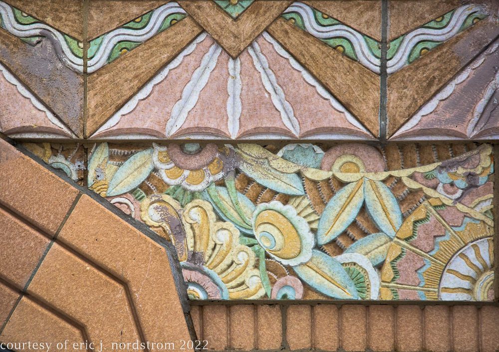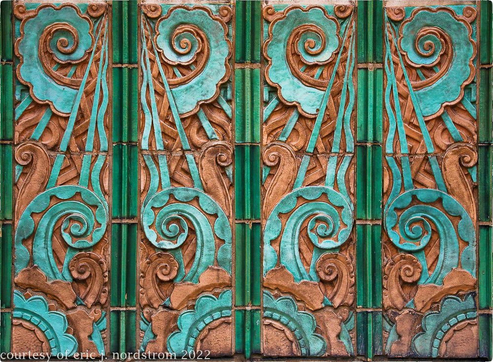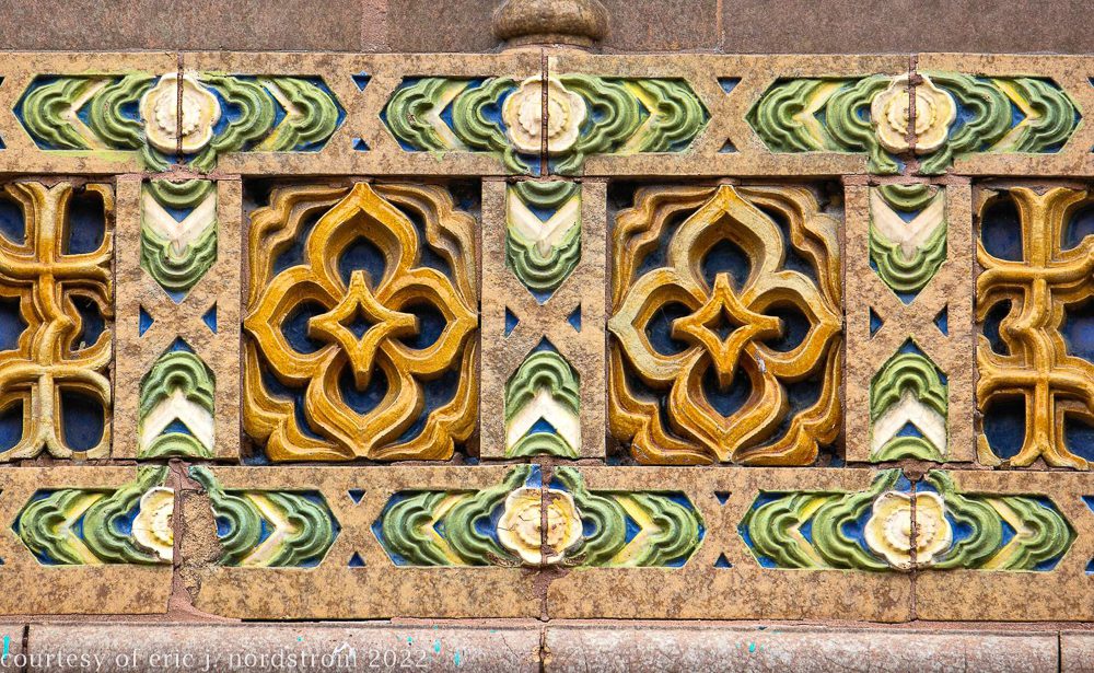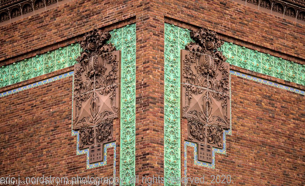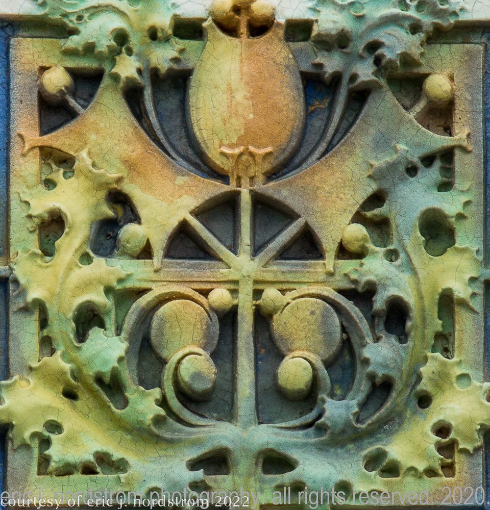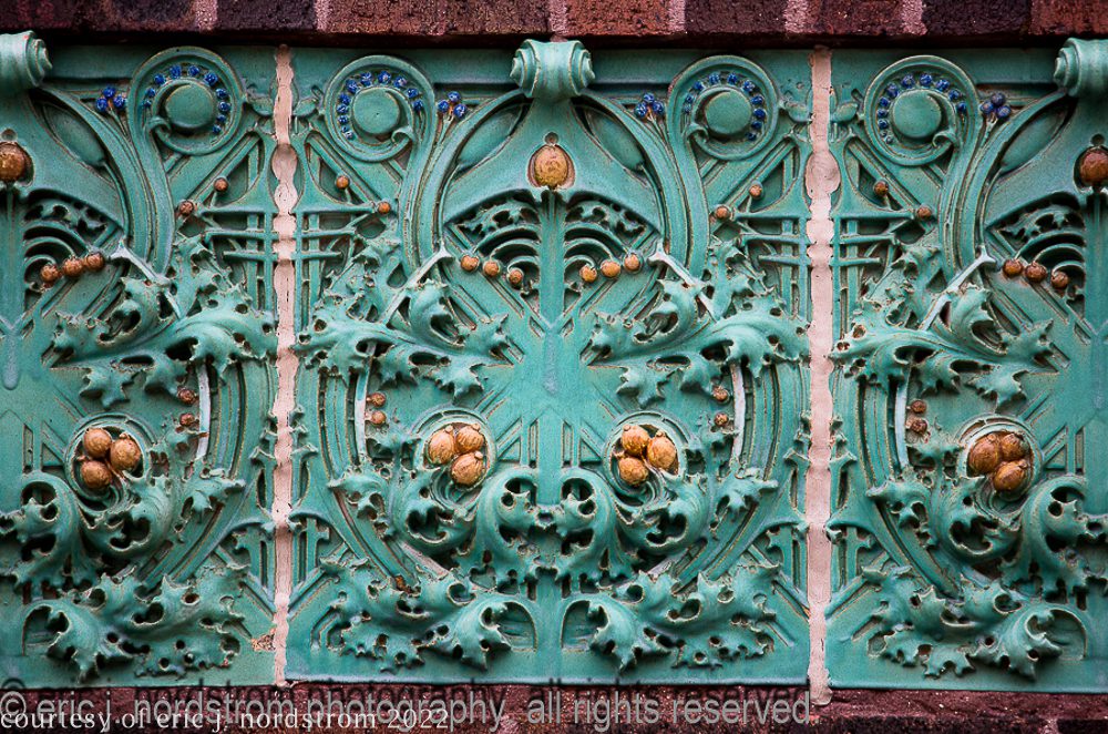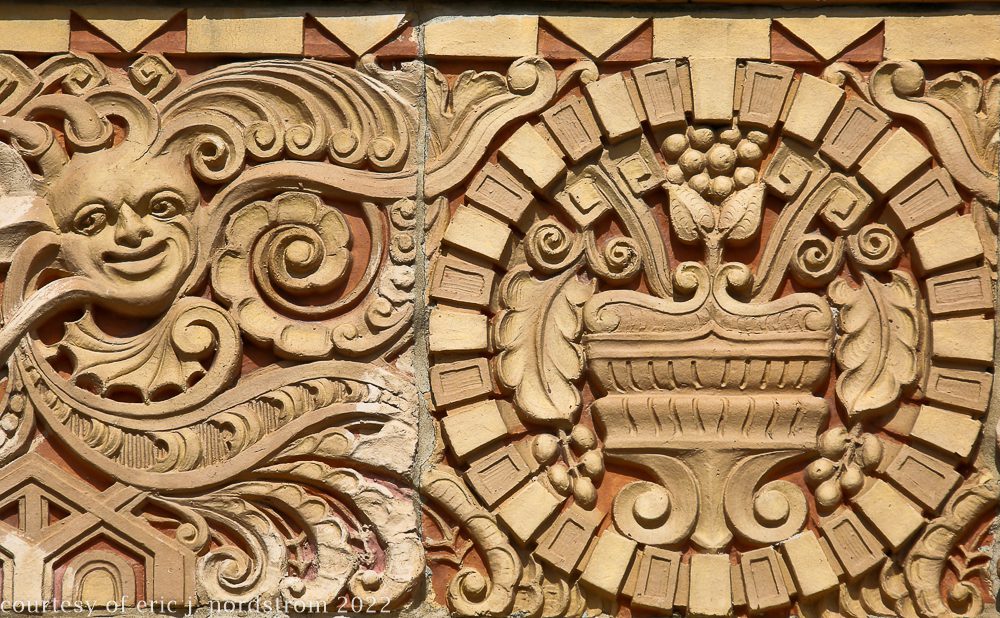 the following images were taken from a years-long exhaustive photographic survey of exterior polychrome terra cotta ornament executed by terra cotta companies (e.g., northwestern, american, midland) found largely in the midwest. the images offer an in-depth analysis of ornament bedecked with a multitude of glazes and/or finishes. information including, but not limited to building identification, architect (if known), terra cotta fabricator, dates, job numbers, condition, and so on, will be provided when time permits.