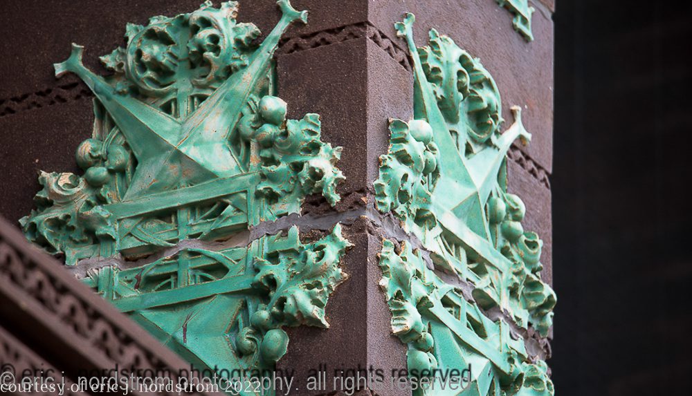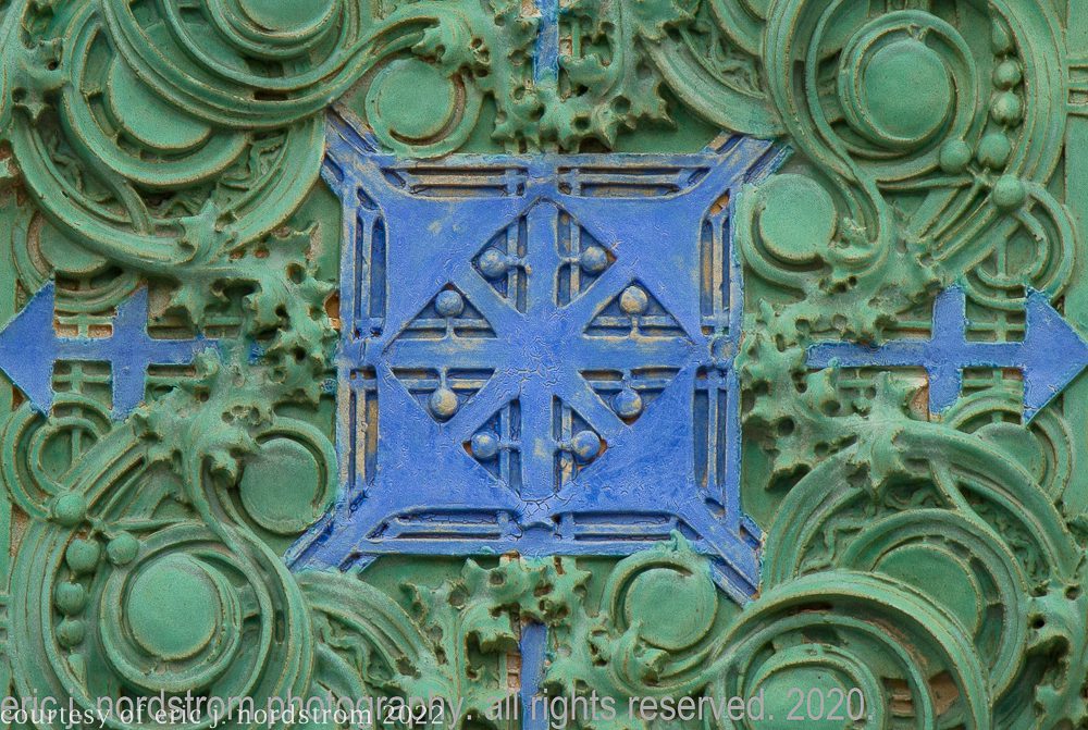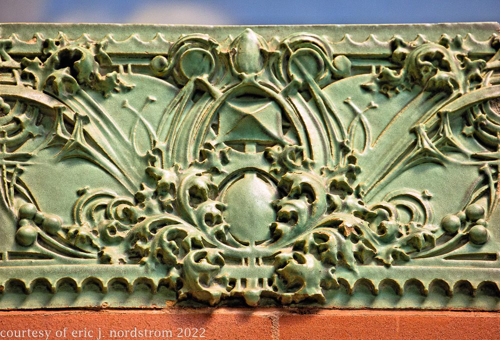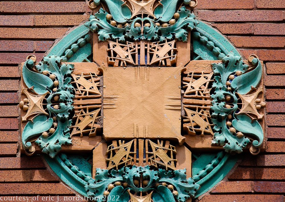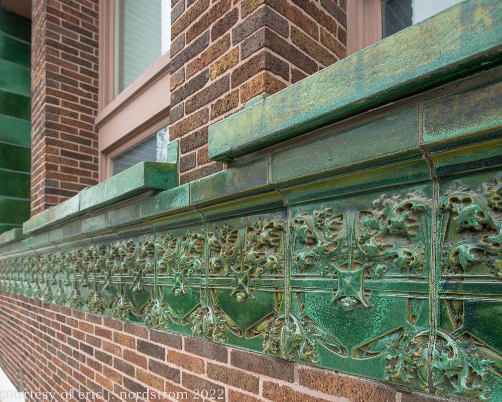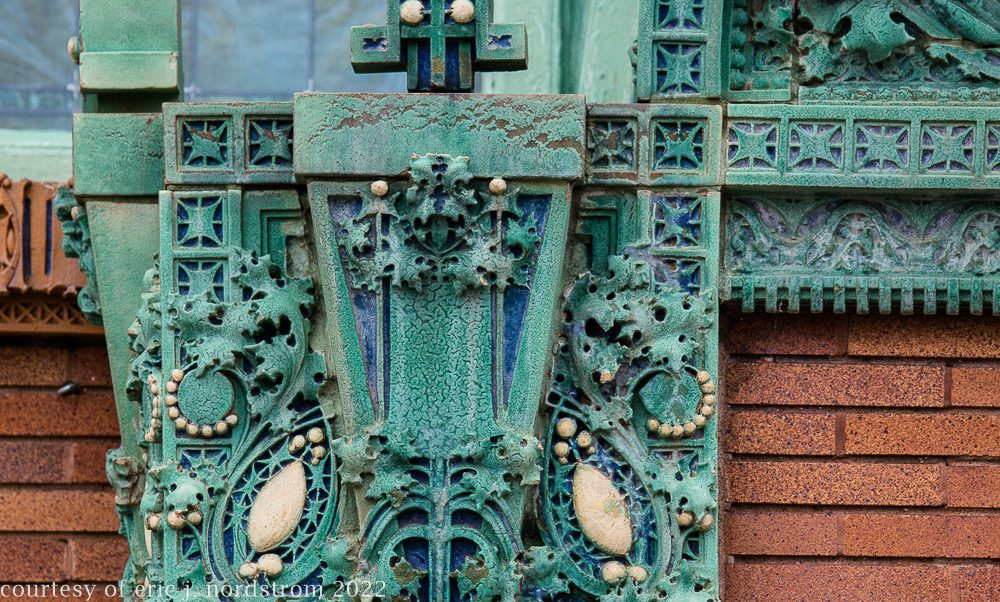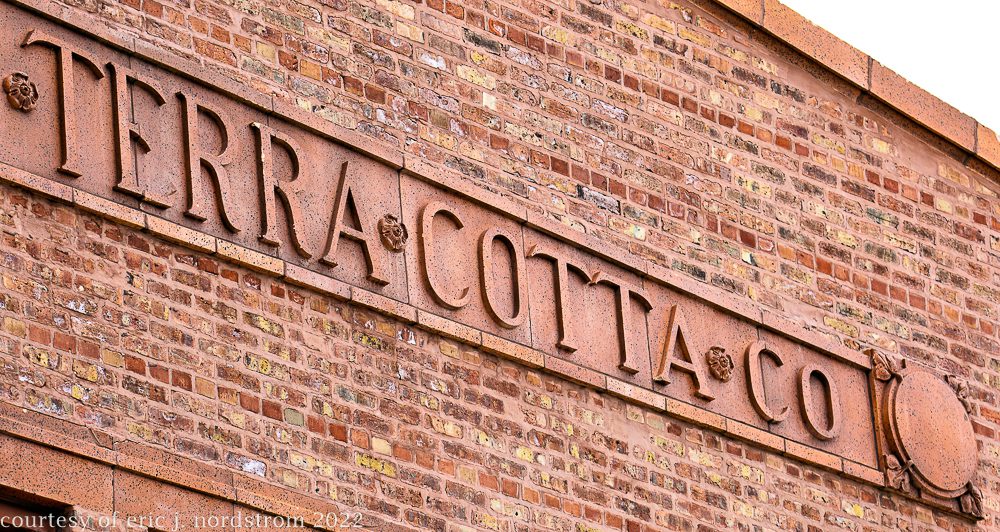 the following images were taken from a years-long exhaustive photographic survey of exterior polychrome terra cotta ornament executed by terra cotta companies (e.g., northwestern, american, midland) found largely in the midwest. the images offer an in-depth analysis of ornament bedecked with a multitude of glazes and/or finishes. information including, but not limited to building identification, architect (if known), terra cotta fabricator, dates, job numbers, condition, and so on, will be provided when time permits.