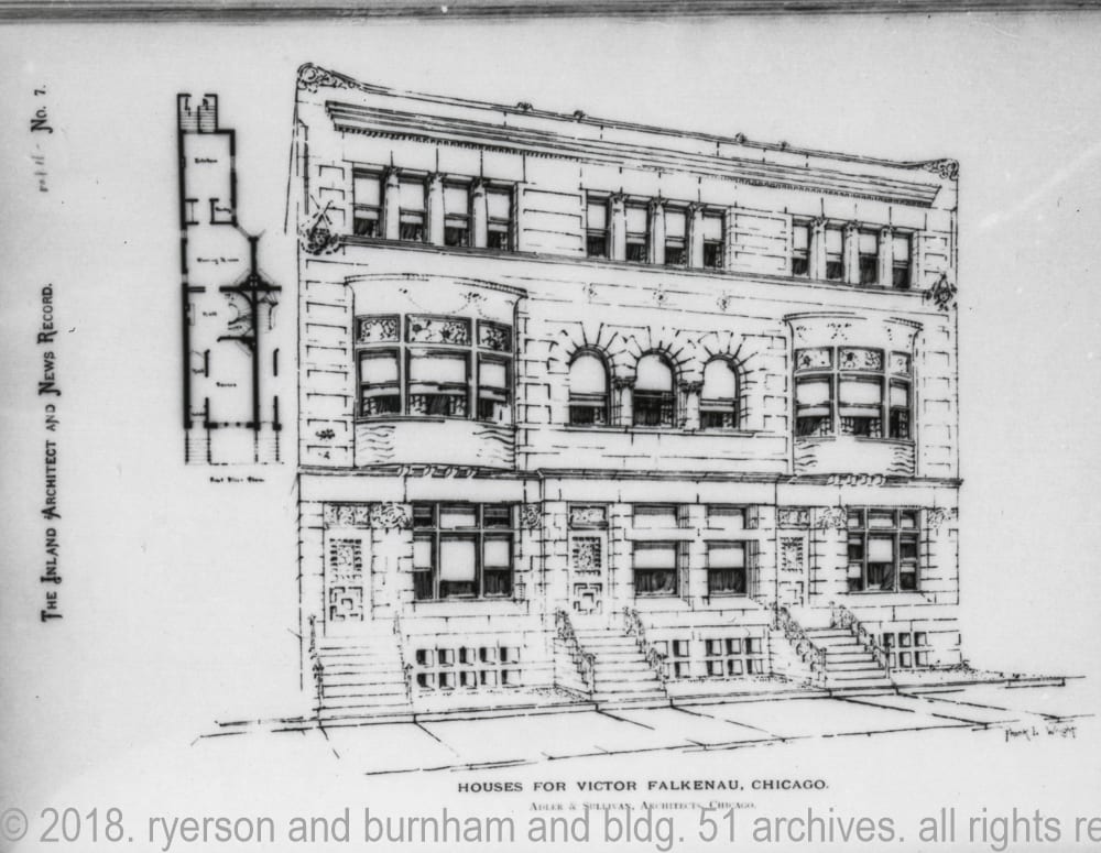 the victor a. falkenau flats (completed, 1888) building was one of the first residential structures designed in part by frank lloyd wright shortly after he joined the firm of adler and sullivan in 1888. ornament, including carved ornamental bedford limestone panels (e.g., winged cherub) and “stock” fireplace majolica tiles (see images), was salvaged by john vinci and richard nickel during its demolition in 1958.
