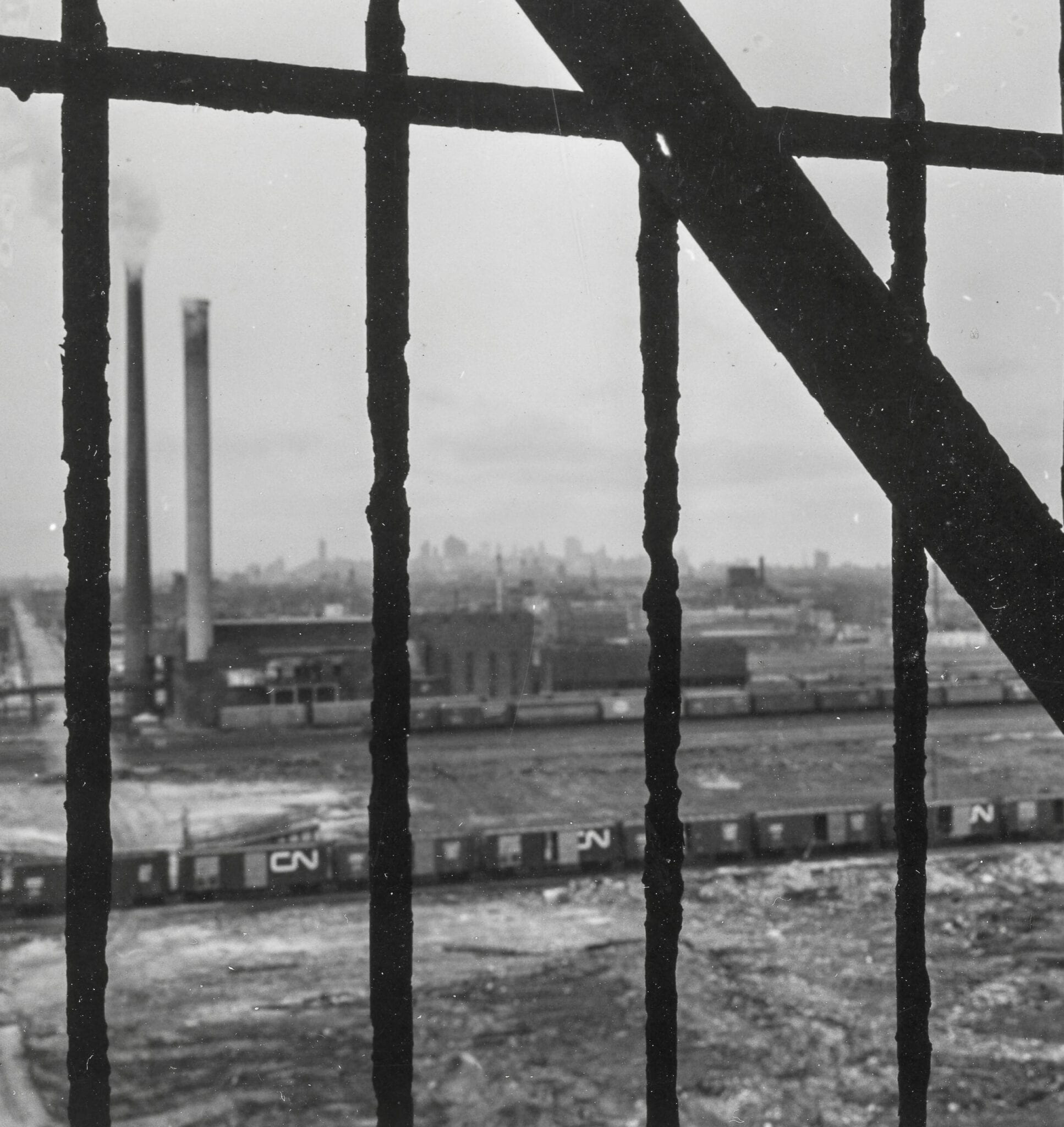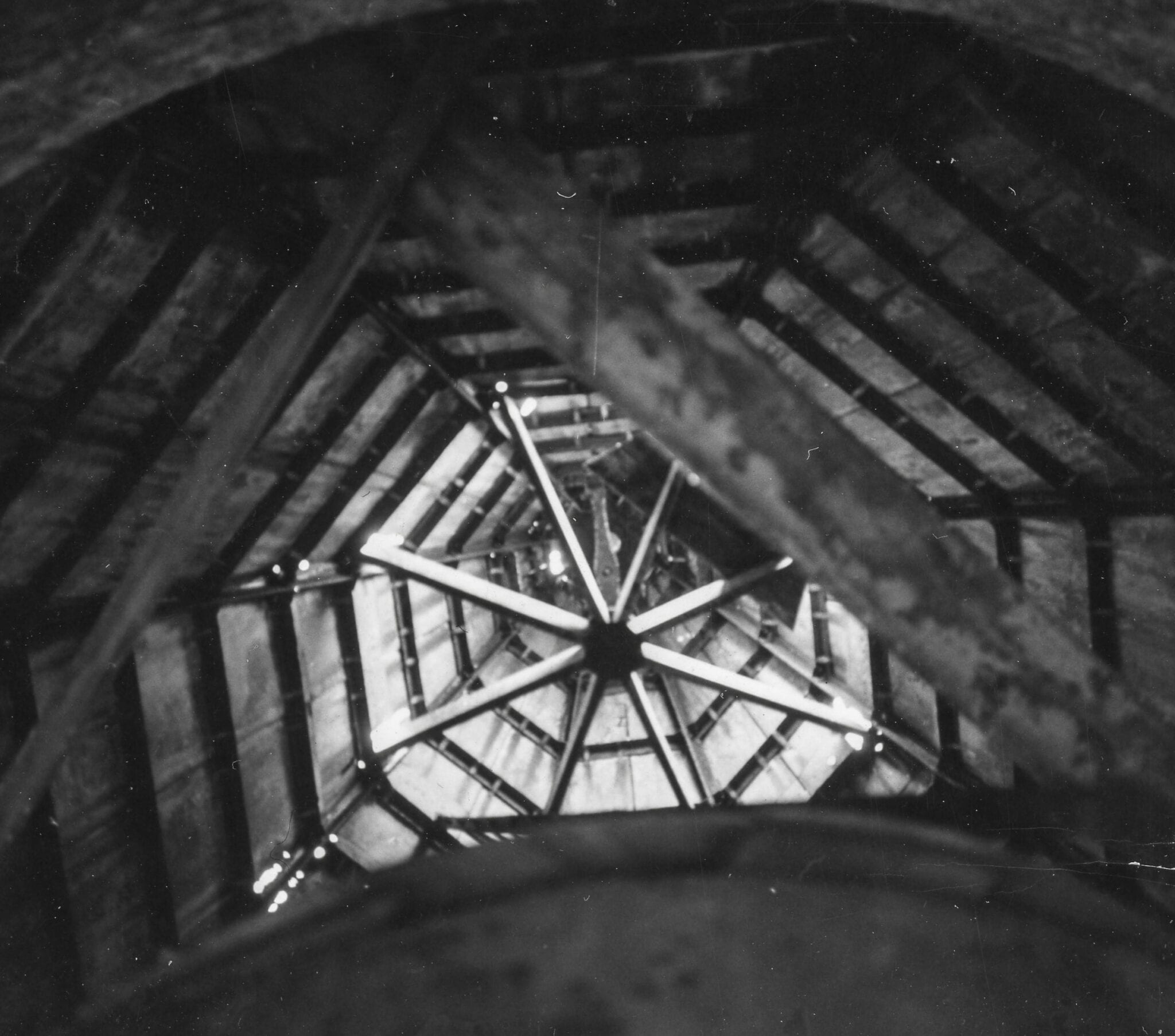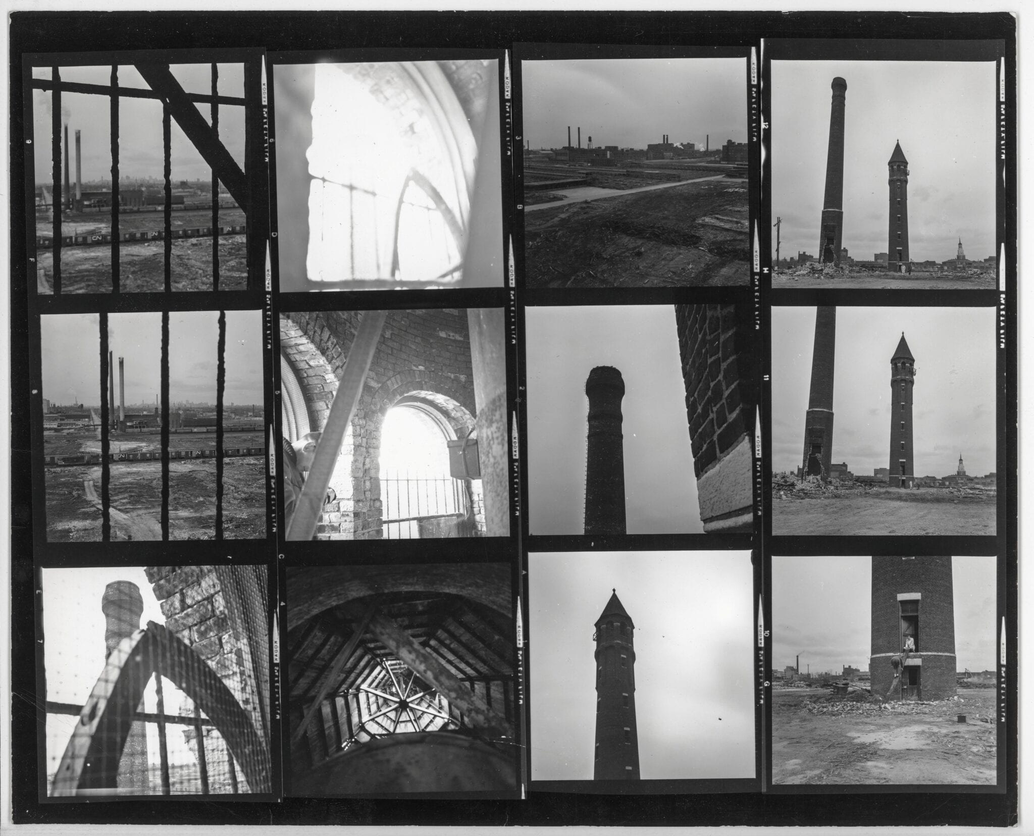 additional john vinci black and white images of burnham’s stockyard tower from inside and out below, including complete contact sheet.