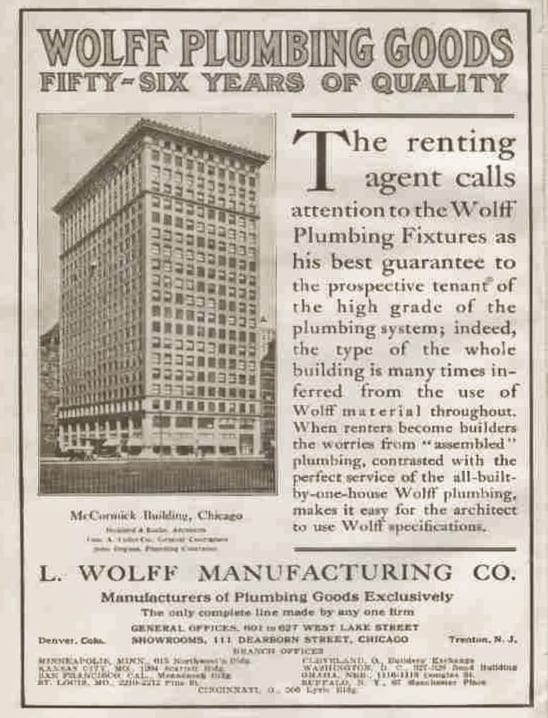 by 1876, wolff had evolved into one of chicago’s largest plumbing supply companies, outfitting commercial and residential structures alike. the l. wolff manufacturing company (renamed in 1876) experienced rapid growth over the next decade that led to the construction of a massive chicago-based factory complex (extant) located at carroll and fulton streets in 1887. wolff’s facility contained a workforce of nearly a thousand men and produced $1.5 million worth of goods a year.