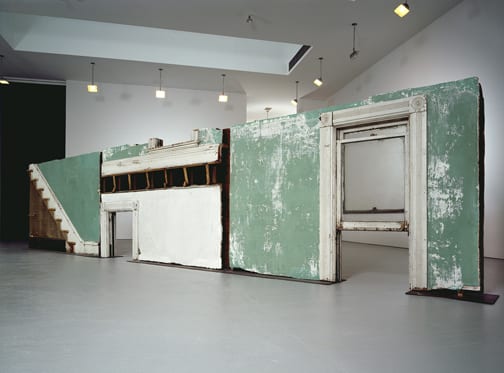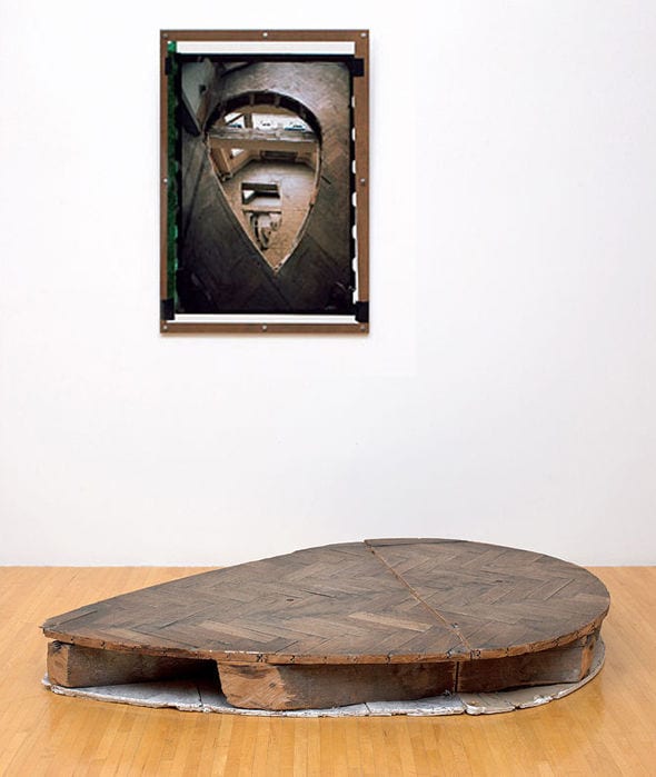 i have written previously about richard nickel as an inspiration in this regard. here, visiting gordon matta-clark’s work, i could not help but feel a kinship between the labor i embark on each week, of methodically salvaging houses, and works like “splitting,” in which the artist painstakingly cleaves a soon-to-be demolished building in half. cutting two parallel, vertical lines through the middle of a frame house with a chainsaw, and tipping the house back on its foundations, he was able to remove material from the middle and extract eaves of the building to be later shown as a sculptural work four corners. likewise, his “building cuts” involved transforming abandoned buildings by cutting into and dismantling the architecture. though our purpose and methods are not alike, i can empathize deeply with the experience of walking away from a project with only fragments, to be transformed into something presentable in another context. these remnants take on a further store of meaning after the source building has disappeared.
