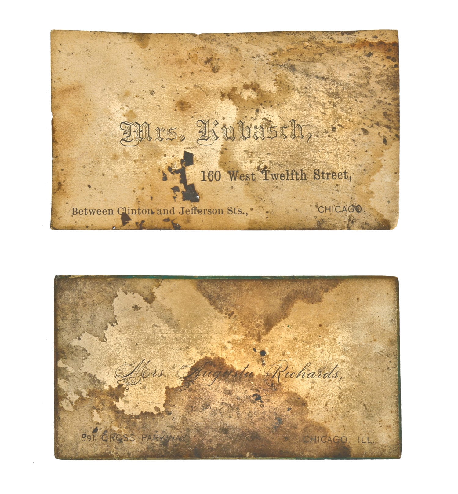 I’m a pretty big history and architecture nerd, so I enjoy following your blog, since the content obviously caters to both of those interests. I was particularly fascinated by the calling cards you found at the cottage on Ohio Street, documented in the May 25 post. I was curious about the names and addresses, so I did a little digging. Originally, I hoped to just find the homes on Sanborn maps (160 W 12th Street, now 551 W. Roosevelt, still existed as a two-story dwelling in 1914, the earliest available online version (Vol. 8, Sheet 3), but 391 Gross Parkway, now approximately 2000 W. Haddon Ave., had already been demolished and replaced by St. Mary’s of Nazareth Hospital (built in 1902) by the earliest available Sanborn map (Vol. 5, 1914, Sheet 110)), but I also wondered if I could find any information online related to the Mrs. Kubasch or Mrs. Augusta Richards named on the cards.