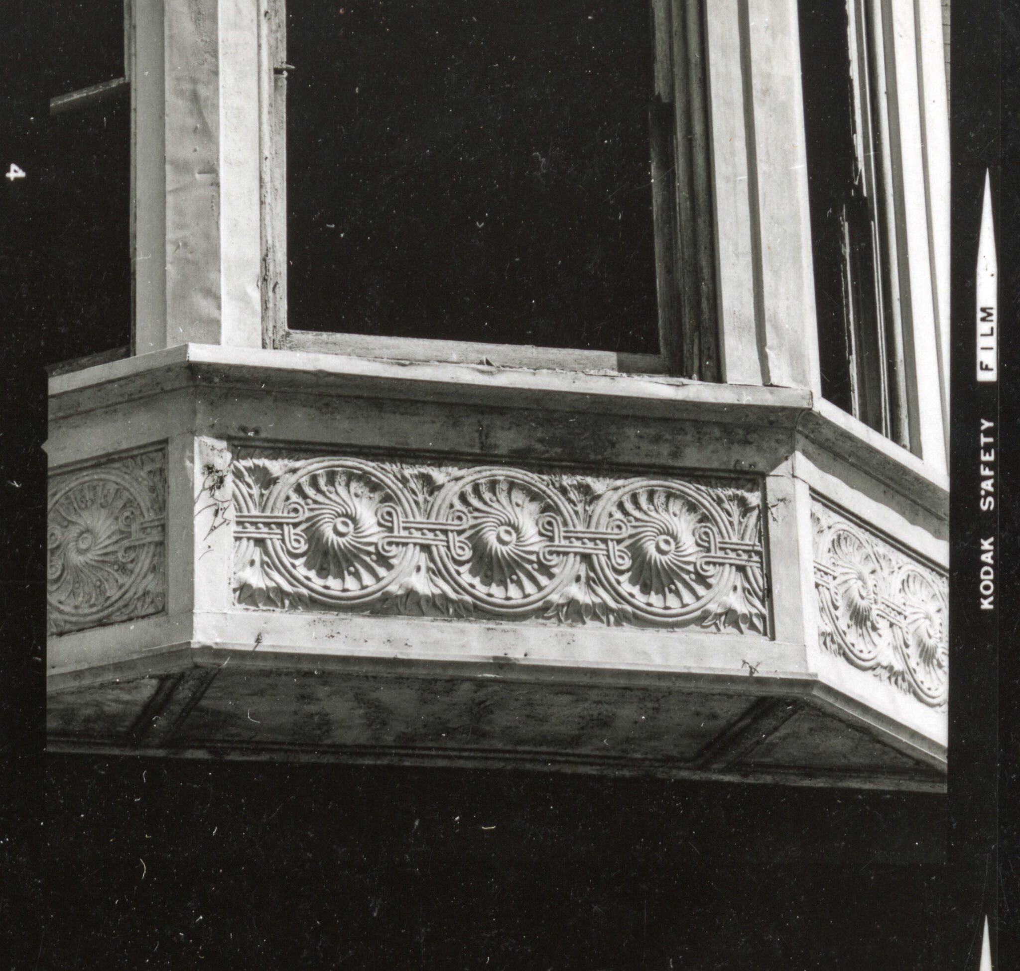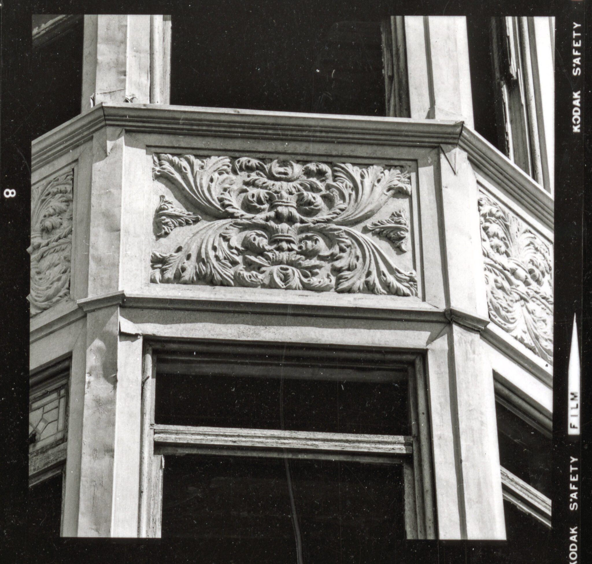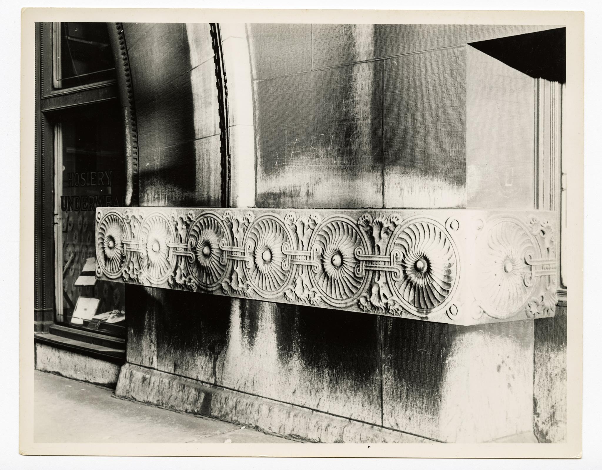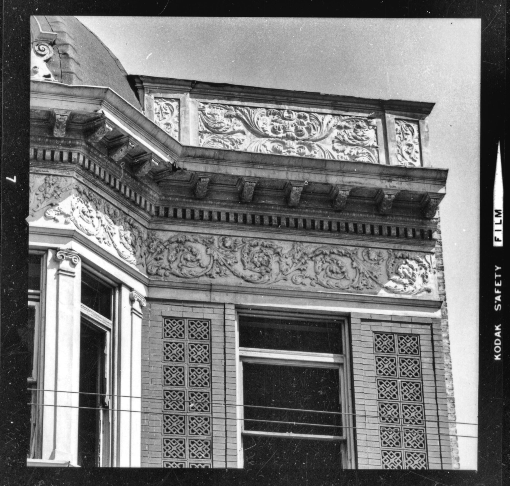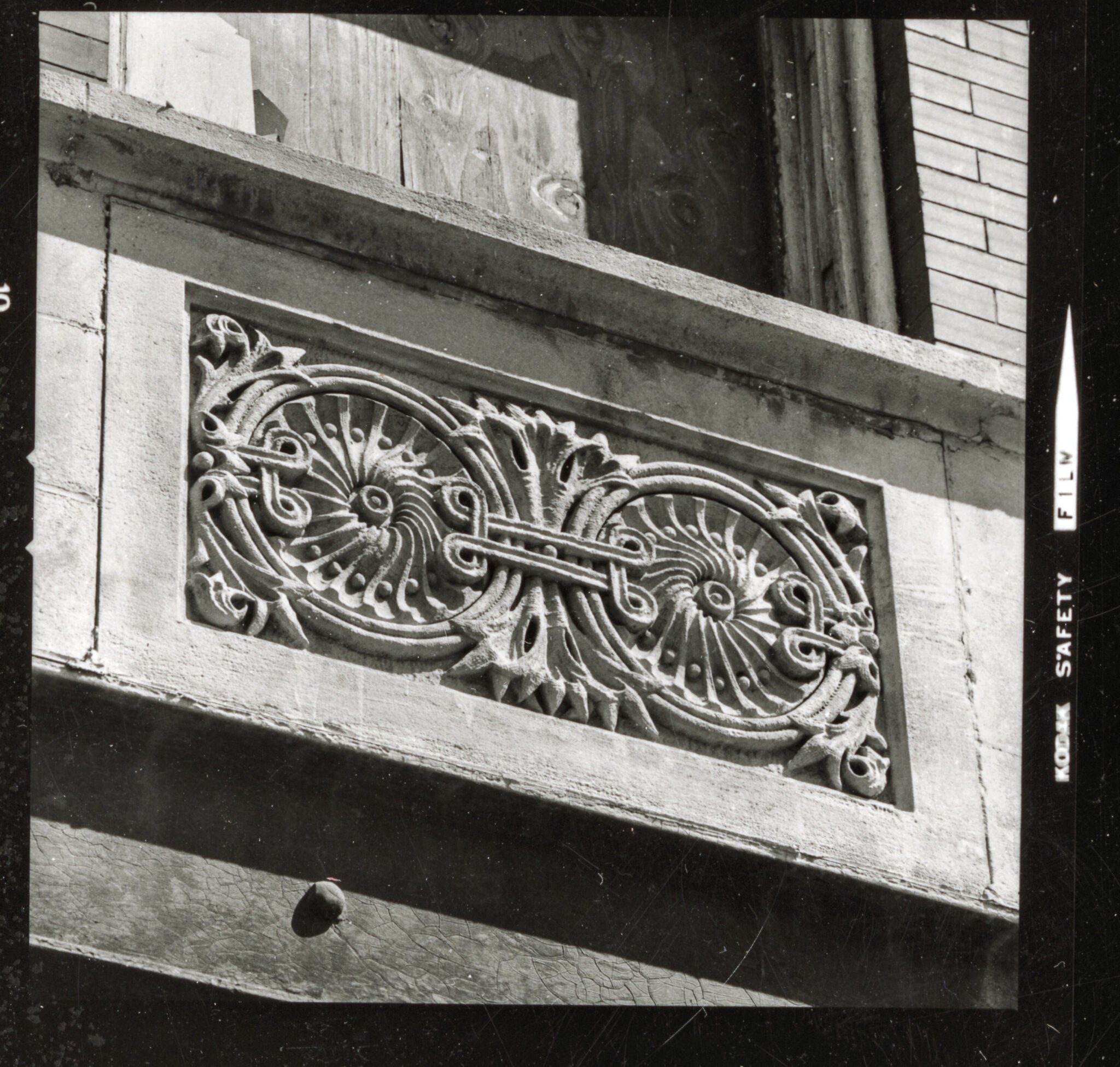 most of the ornament (e.g., pressed bricks, beveled glass transoms, stamped steel cornice, etc.) was stock, but the single carved bedford stone panel and bay spandrels borrow heavily from sullivan’s walker warehouse and auditorium (see ralph marlow line’s image of walker impost block for comparison).