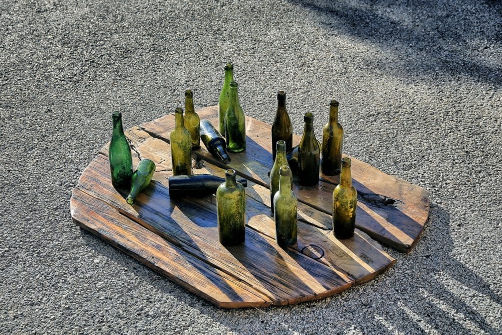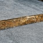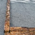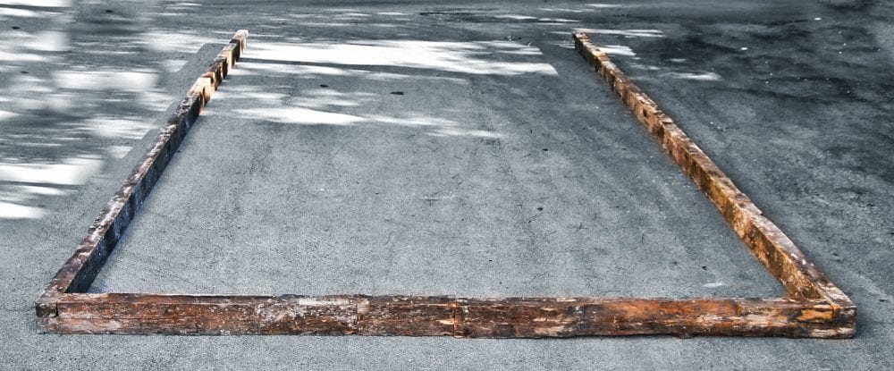the next project involved removing a cottage’s “footprint,” in the form of its mortise and tenon sill plates that supported the studs, first floor joists, flooring, etc. after carefully marking each section, i then reassembled it in the parking lot behind behind my shop, complete with the circular wood floor unearthed from the cottage’s privy pit (and positioned approximately to where it was located). i added a few bottles from the excavation and a few studs for added effect and then measured and photographed it.